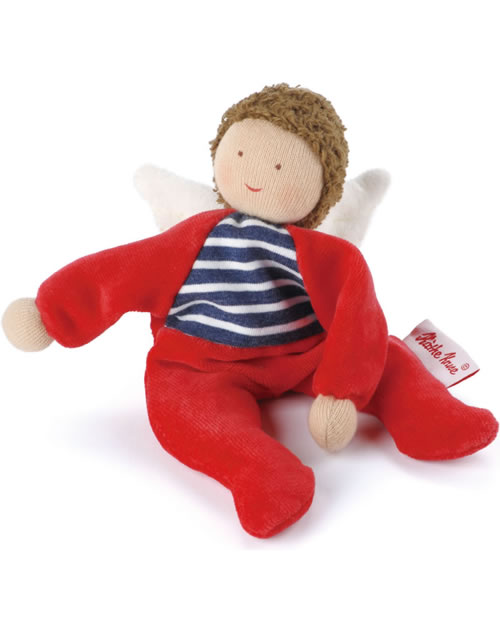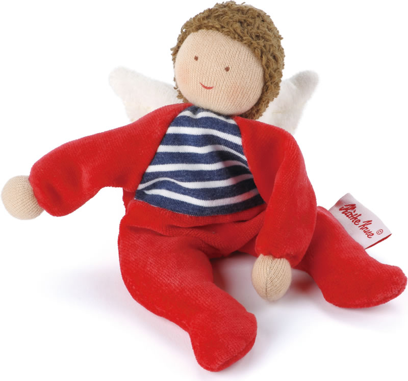 The naughty angel has brown plush hair and a hand painted face. His body is made of soft, nostalgic material. The inside is filled with granules. Two small angel wings are hidden on his back. The naughty angel is made of a material mix of Nicki fabric, cotton jersey and plush, which stimulates babys. The little doll is packed in a high quality gift box and is a perfect gift for every child.