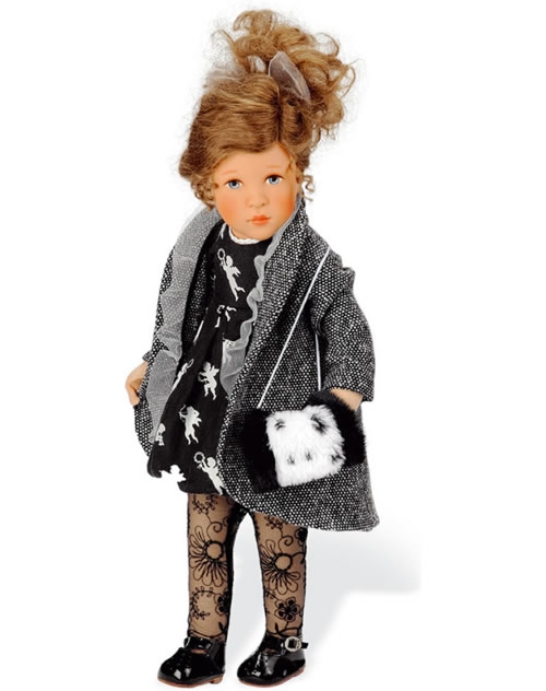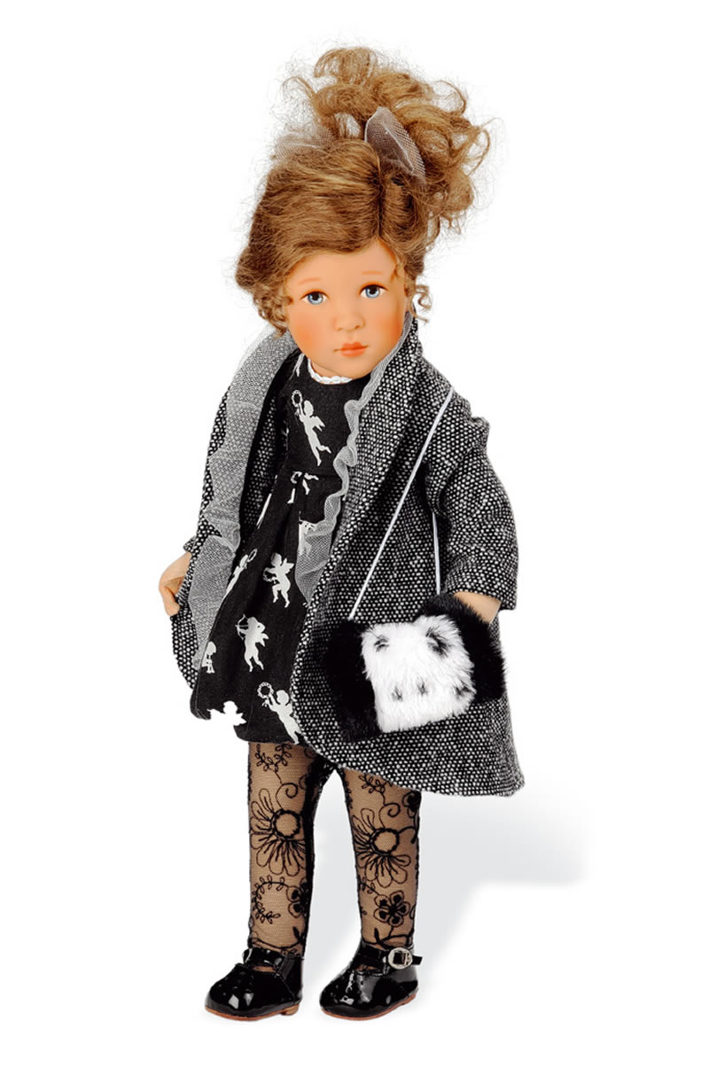 The Käthe Kruse Studios made this special doll in close cooperation with famous doll artist, Sylvia Natterer. Since 1978 Sylvia Natterer has been a long-time friend of Hanne Adler-Kruse and they often talked about the idea of creating a doll together. These ideas lead to the making of Yula. The classic Käthe Kruse doll stands 21 inches tall and is hand-stuffed with reindeer hair. The hand-painted head is made of high quality vinyl and designed by Sylvia Natterer. The real hair is pinned up. Yula wears a dress with an angel print, a salt-and-pepper coat and a muff. Black stockings and patent leather shoes complete her outfit. Yula is limited to only 100 dolls worldwide.