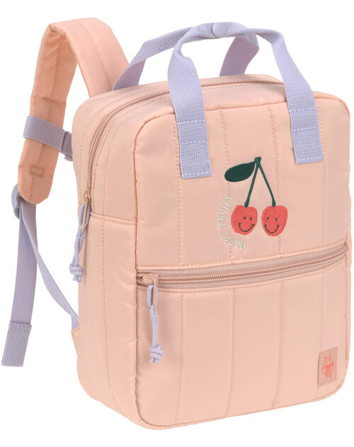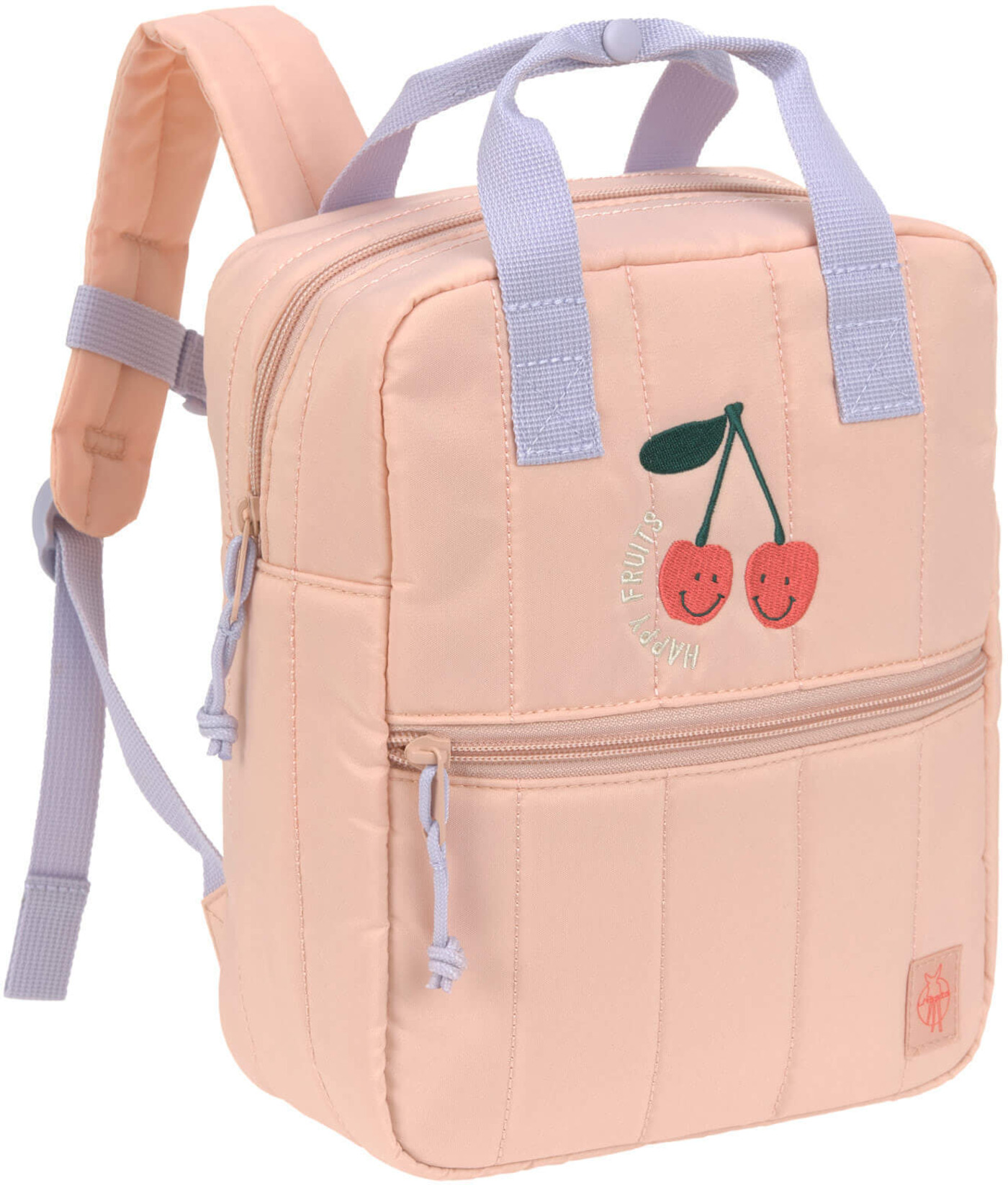 The Square kindergarten backpack in the Little Gang Cherry Peach design by LÄSSIG impresses with its modern shape and cheerful embroidery. Plenty of storage space. Padded shoulder straps. Ideal for trips or for kindergarten. 7 L volume. From 3 years.