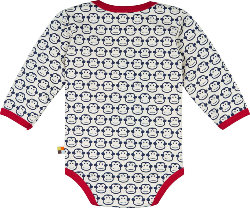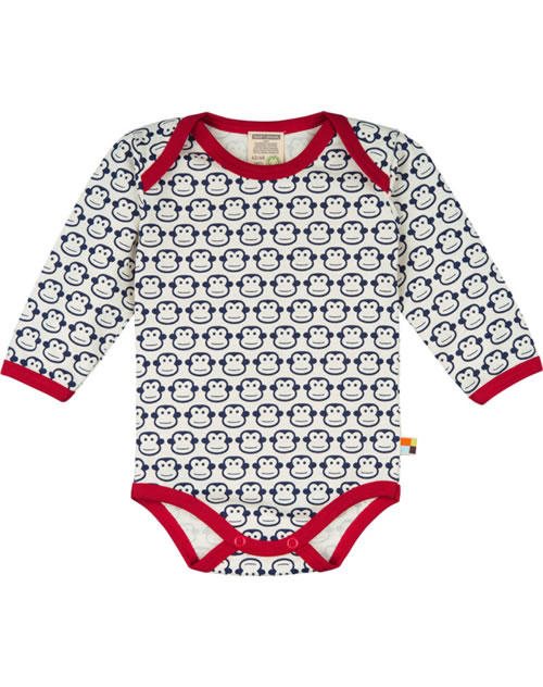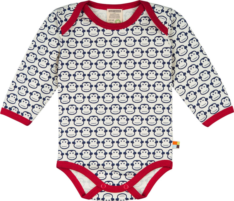 Comfortable, light baby rib long sleeve bodysuit with monkeys made of soft cotton by LOUD + PROUD. The small button placket in the crotch and the winding collar make donning and doffing a breeze.