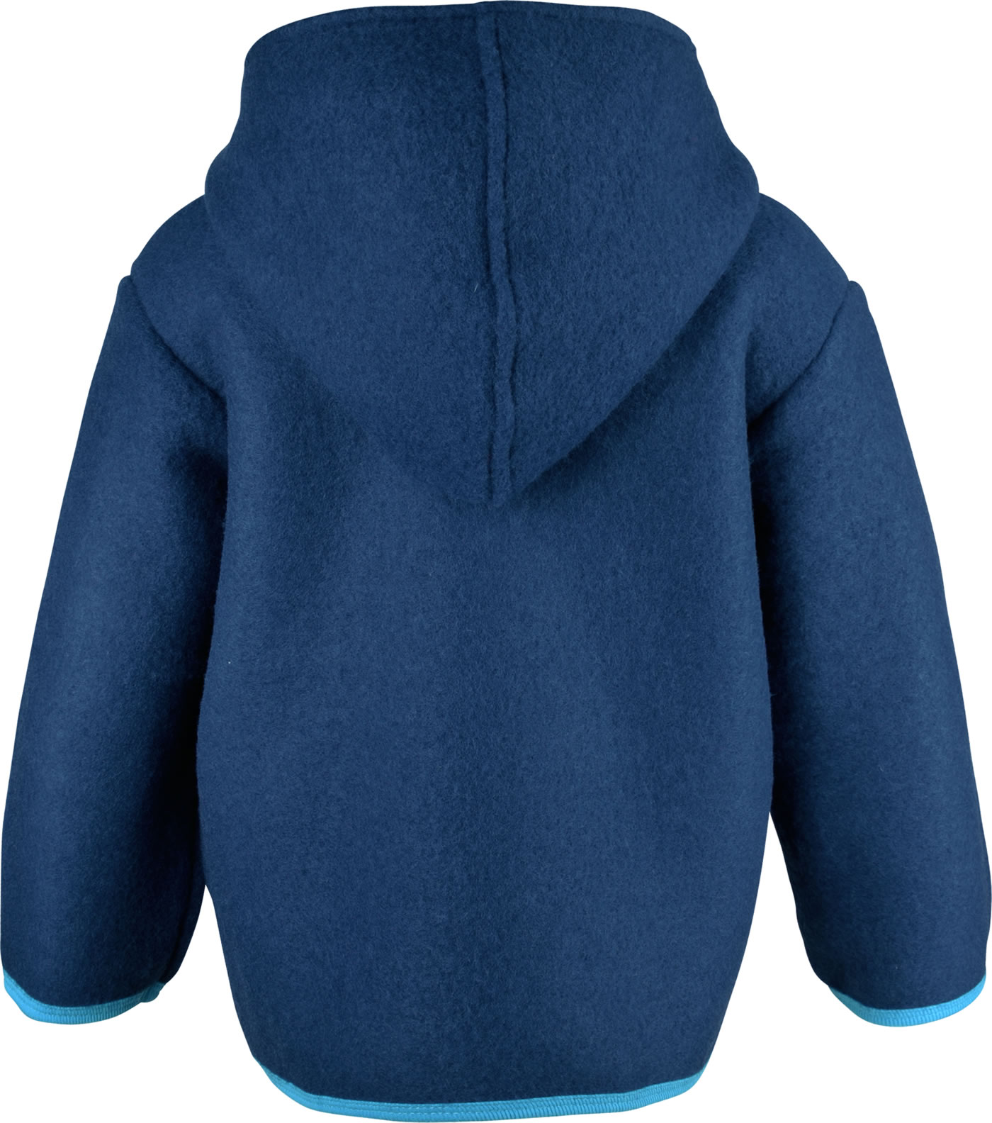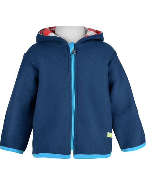 Hooded jacket made of wool fleece by LOUD + PROUD. The zipper and cuffs of this cuddly soft jacket are in a contrasting color. There is an additional chin guard on the zipper. The inside of the hood is lined with a colorful all-over jersey.