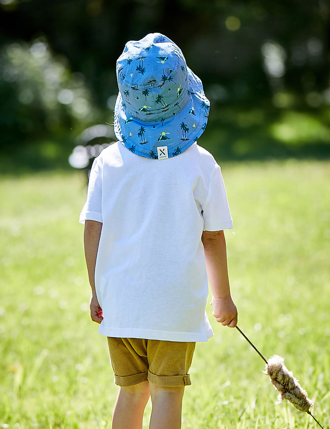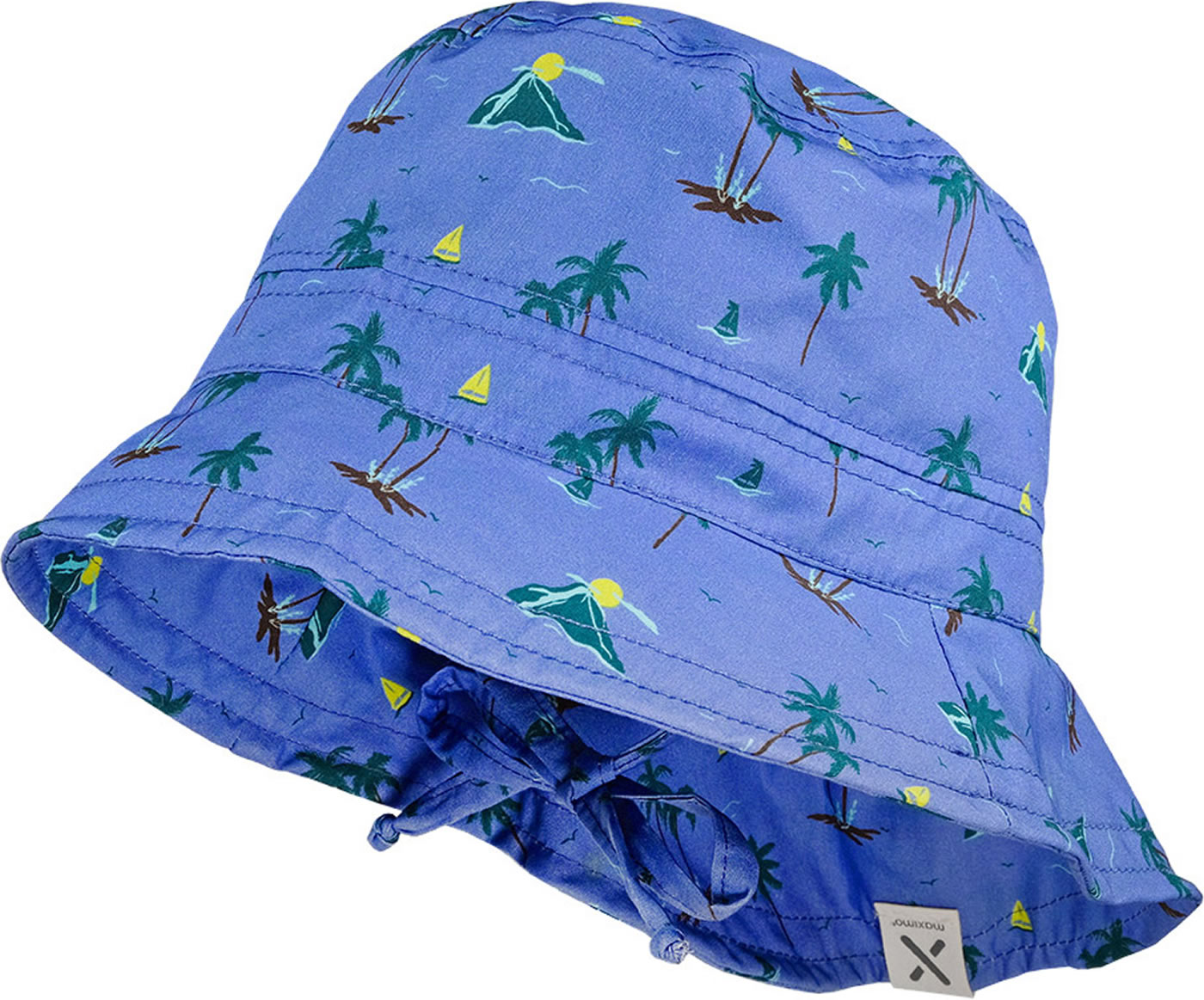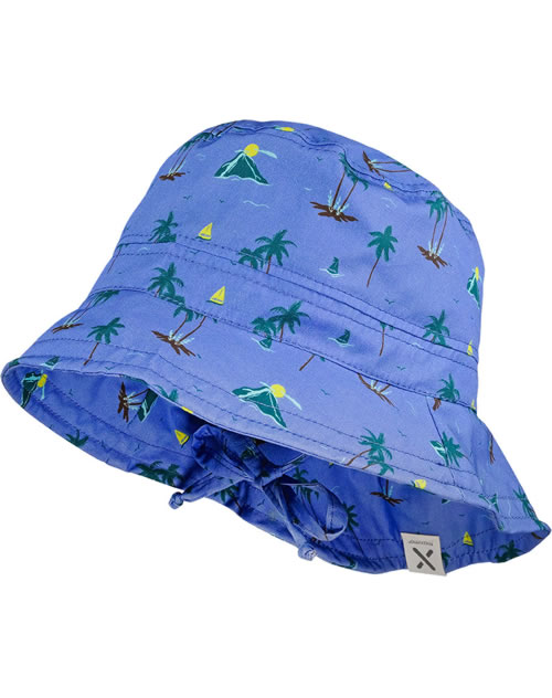 Beautiful summer hat with a wide brim in blue and with palm motifs by MAXIMO. The hat has UV protection 50+ and the ties give the hat the best possible hold.