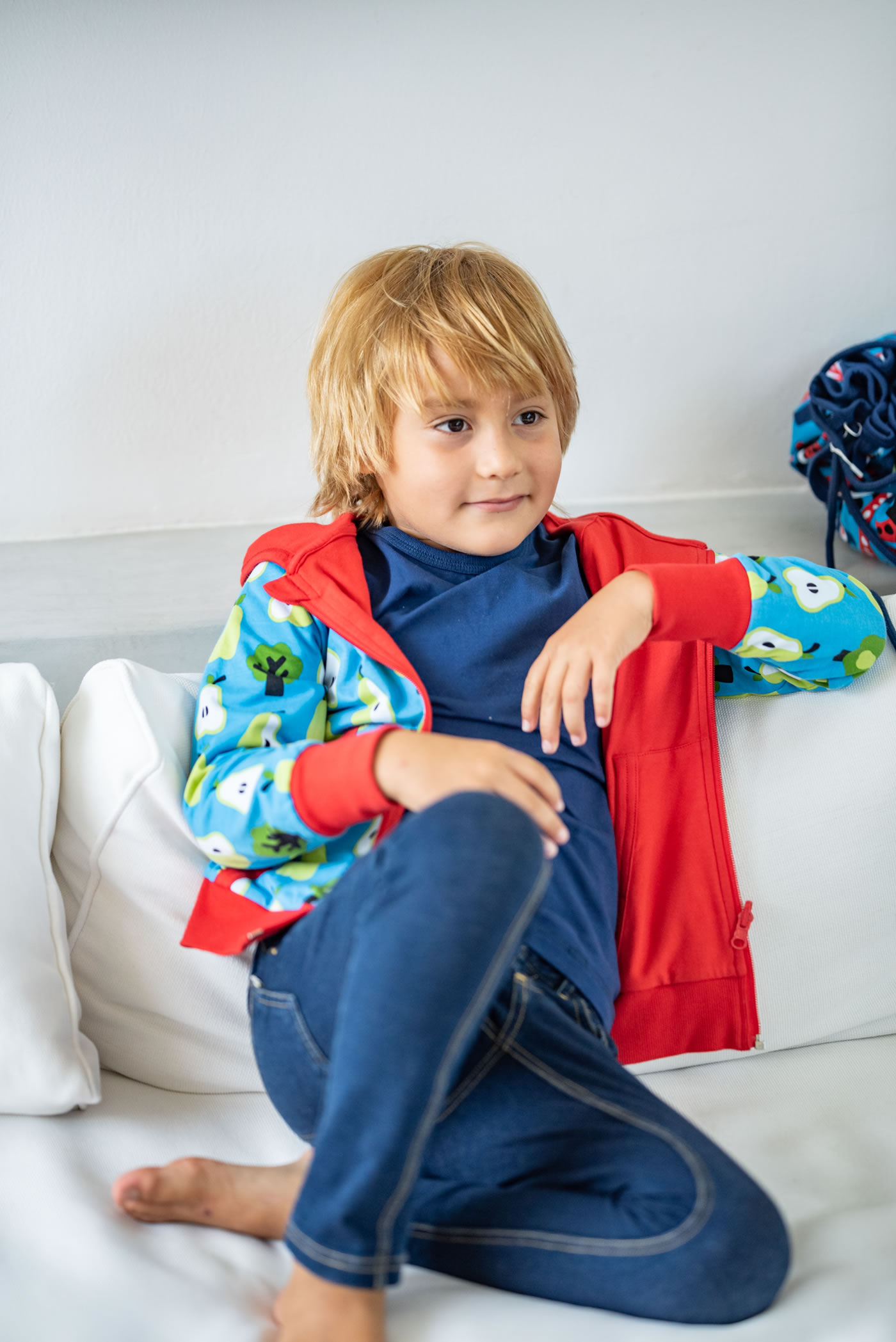 Reversible hooded sweatshirt with great pear pattern by MAXOMORRA. Colored contrasting cuffs and piping ensure an absolute eye-catcher. The double-layered material made of organic cotton and the loose cut ensure a high level of comfort. The hoodie can be worn with the colored side or the plain side depending on your mood.
