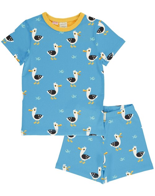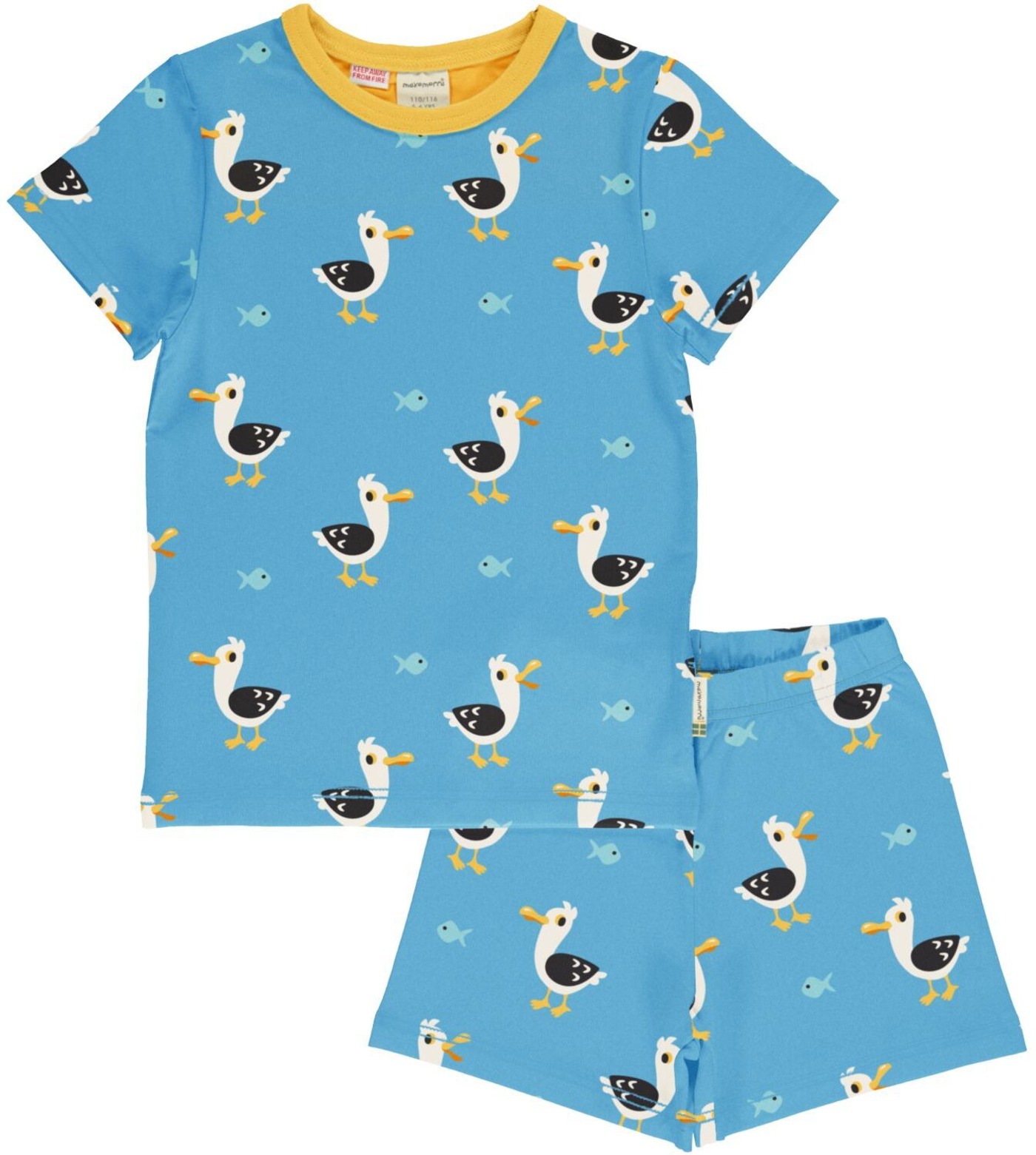 A two-piece short pajama set in blue with seagull motifs from Maxomorra.