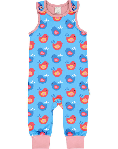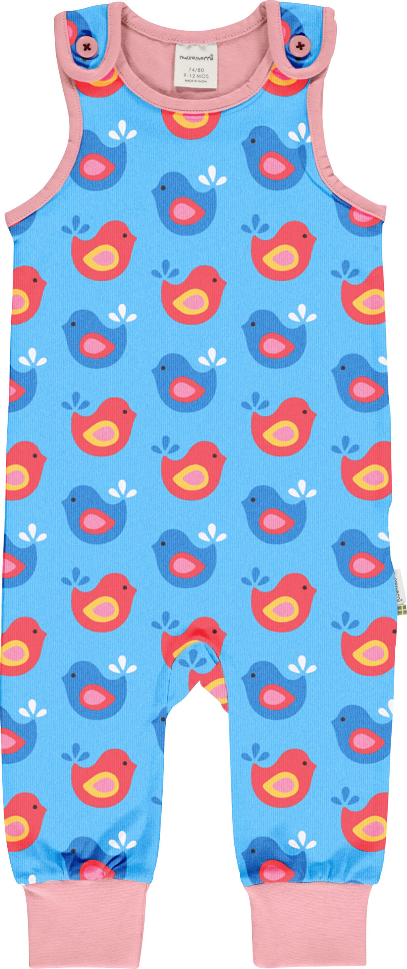 Great rompersuit with bright birds in blue by MAXOMORRA. The buttons on the straps make putting them on and taking off to a children's play. The soft material offers a high wearing comfort.