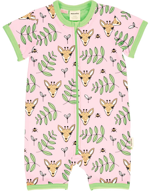 Great player with short arms and legs in pink with giraffe pattern by MEYADEY for little girls. A nice contrast are the contrasting seams and the long zipper on the front, which makes putting on and taking off a breeze. The soft material is very comfortable to wear.