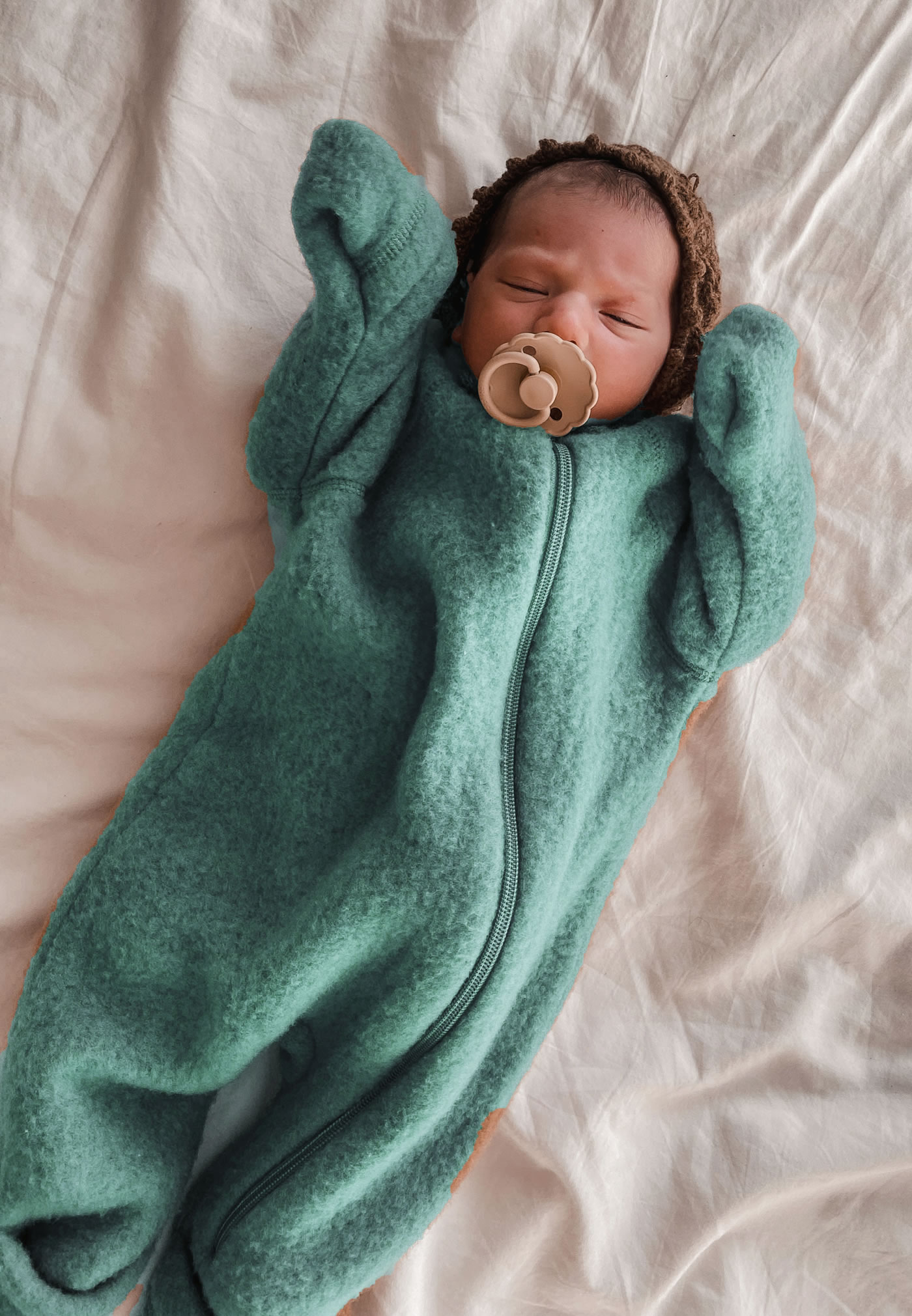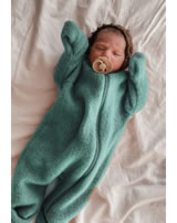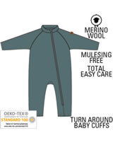 This warm baby overall made of merino wool by MIKK-LINE is super soft and doesn't itch. The fibers of the merino wool used are thinner than those of other types of wool and are therefore particularly soft on baby's skin. The suit is OEKO-TEX certified, which means that no harmful chemicals were used in the manufacture of the clothing. A special detail are the sleeve and leg cuffs, which can be turned inside out and used as a replacement for shoes/gloves on particularly cold days, for example, or as scratch protection for fingernails.