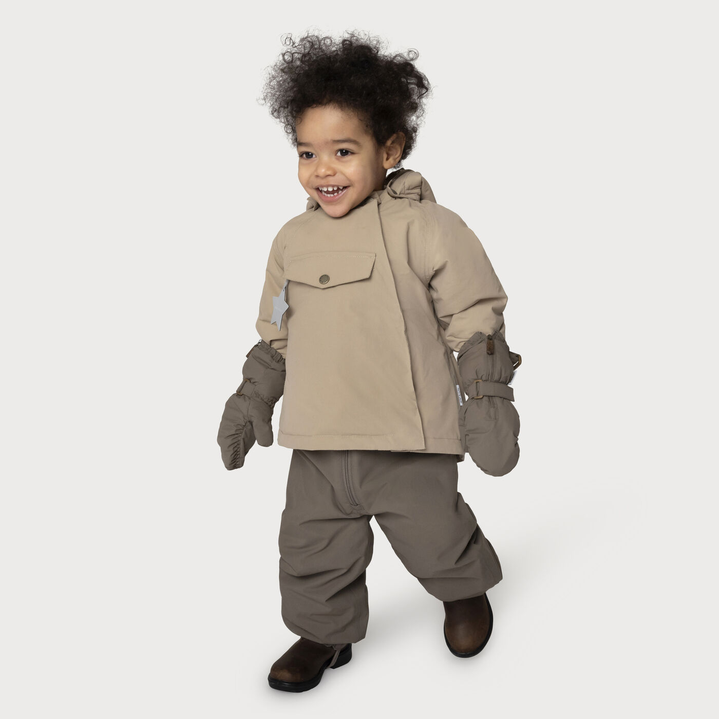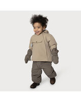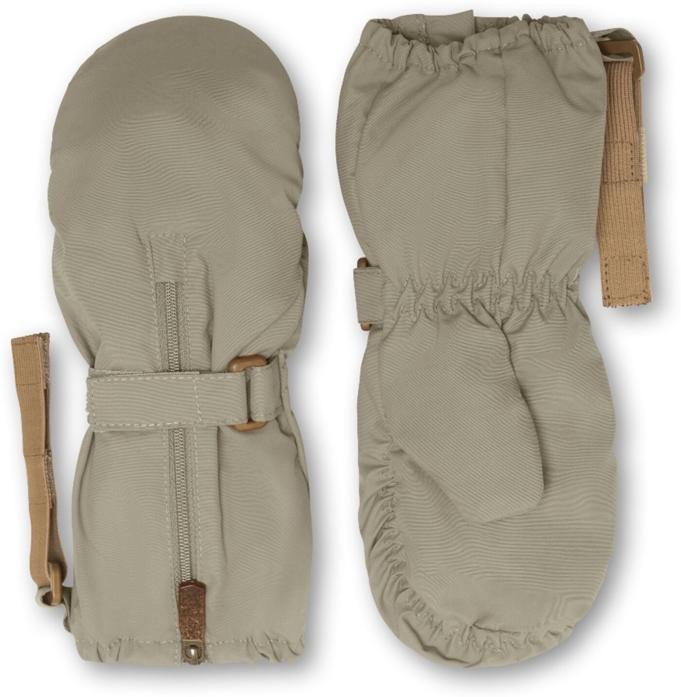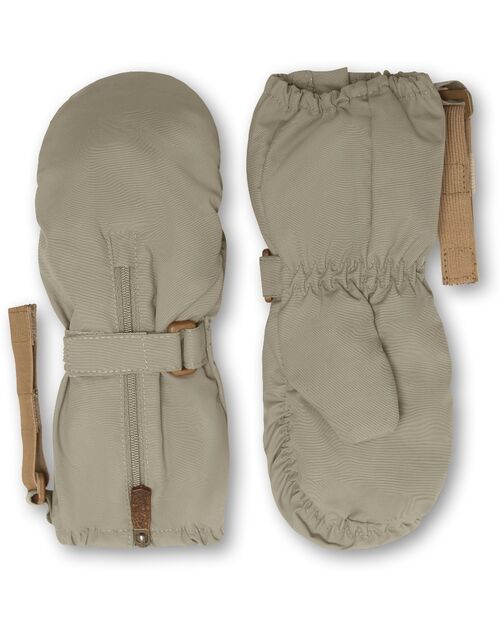Warmly lined and waterproof gloves from MINI A TURE. The gloves are lined with soft fleece and made mostly from recycled materials. There is a reflective logo on the side and a zipper on the back of the hand allows for easy on and off. The gloves can be attached to MINI A TURE jackets thanks to the Velcro straps.