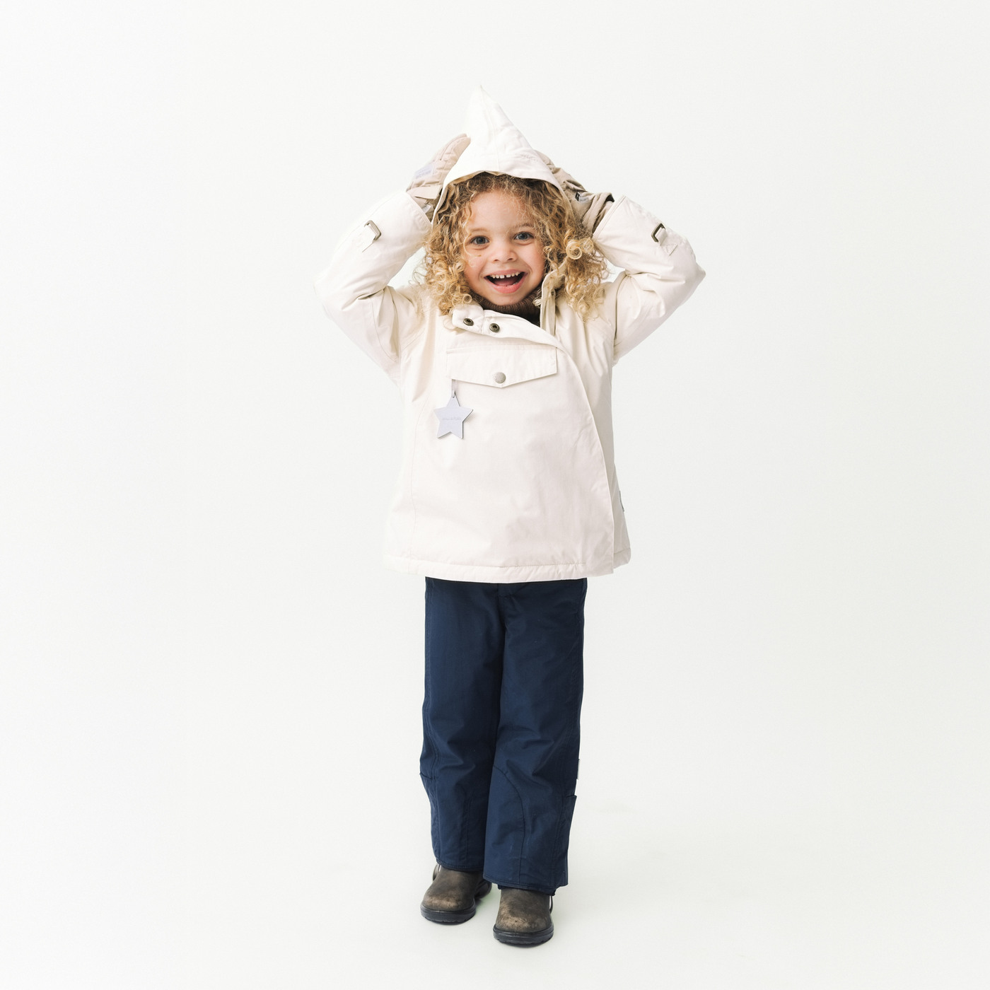 The cut is inspired by a classic snowsuit, with a slightly dropped crotch that not only allows for maximum freedom of movement but also leaves room to grow.