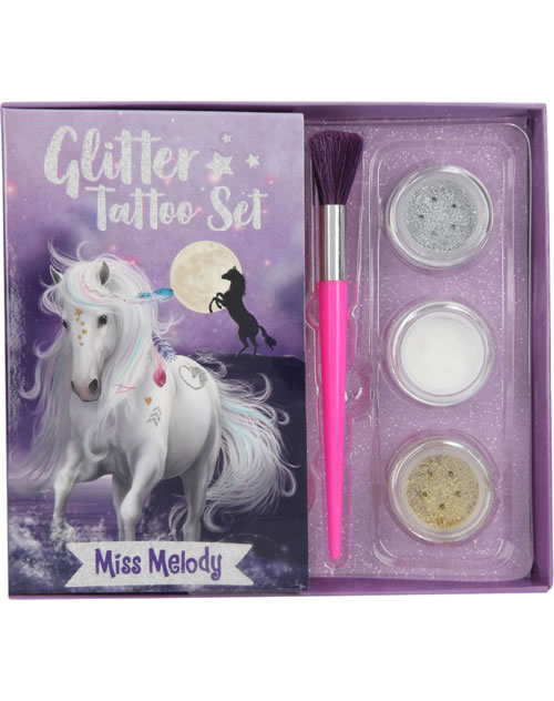 Contents: 54 tattoo, 3 glitter powders, 1 brush, instructions.