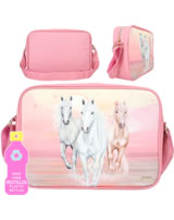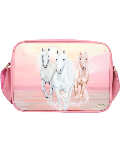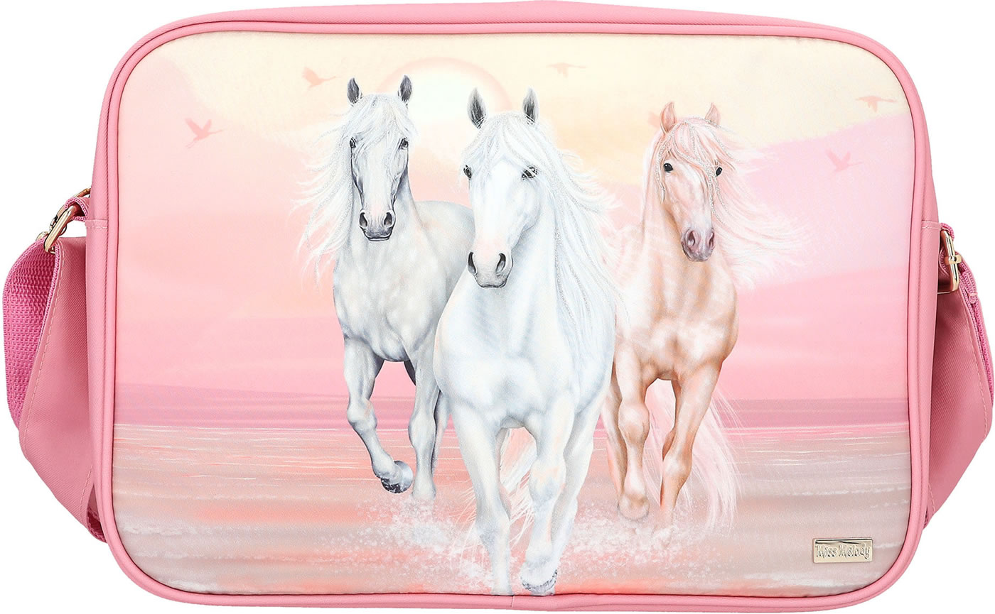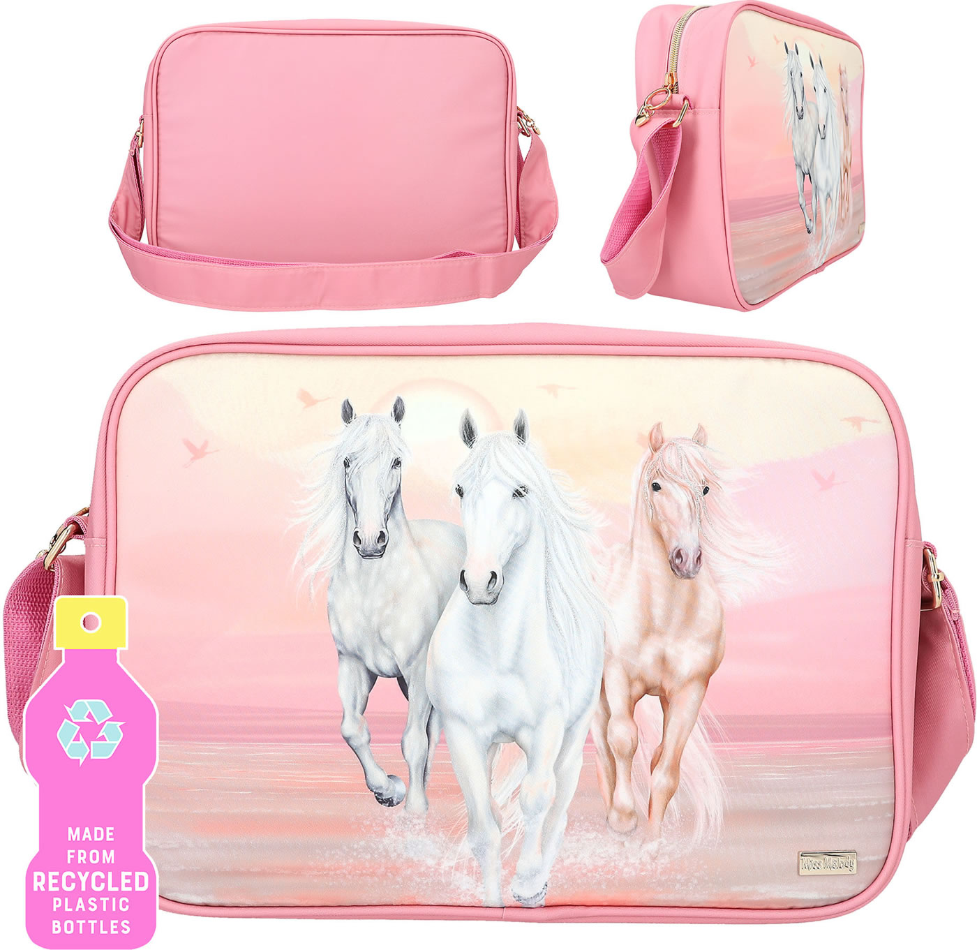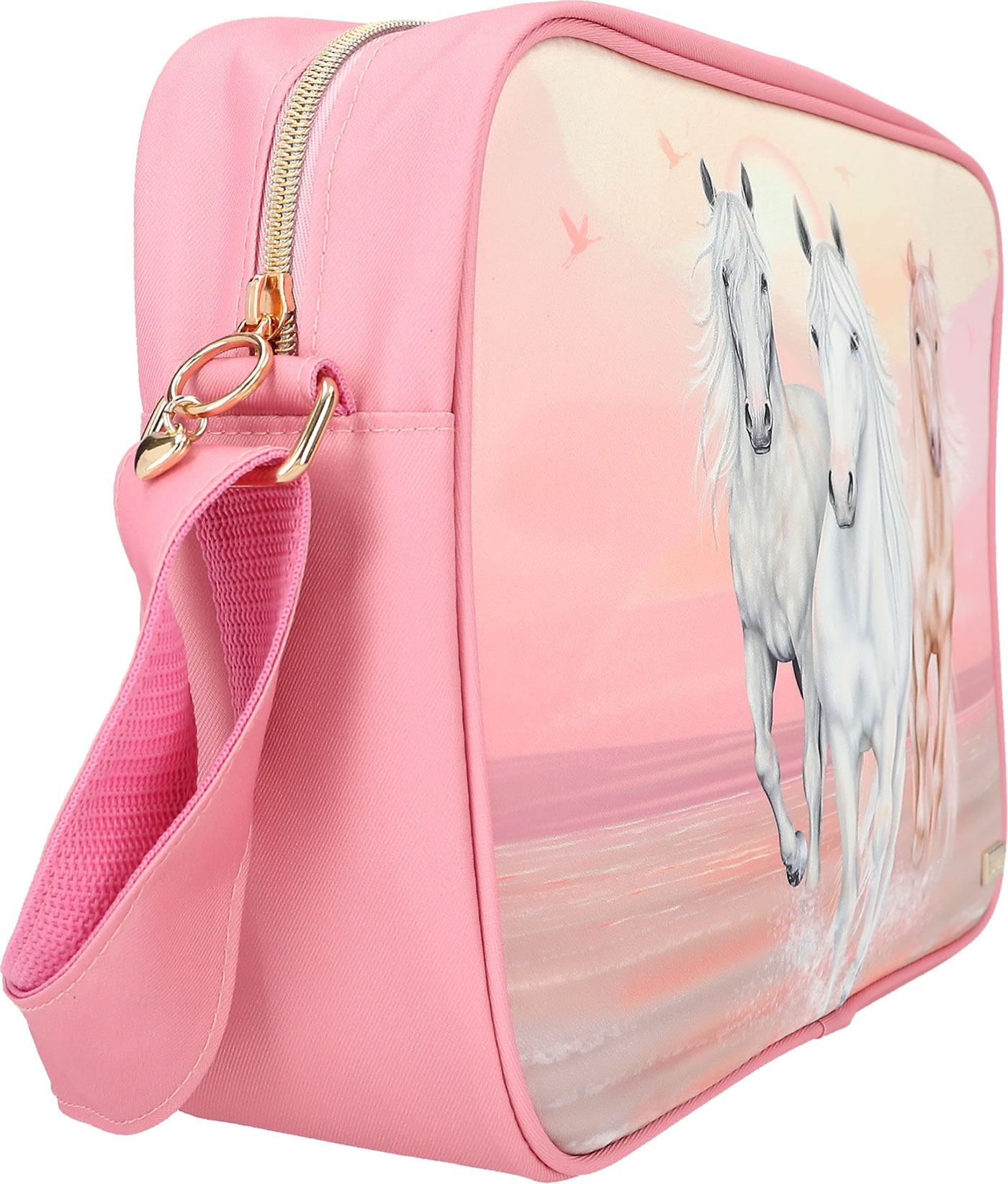 A dreamy XL horse motif, soft pink and golden glitter: The large Sundown shoulder bag by Miss Melody has a spacious main compartment, two inner compartments and a matching, length-adjustable strap for hanging.
