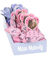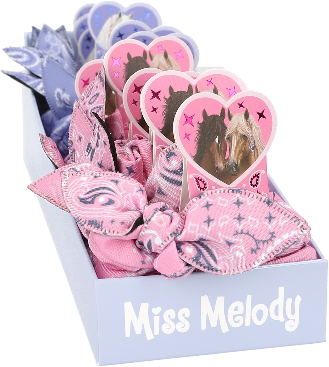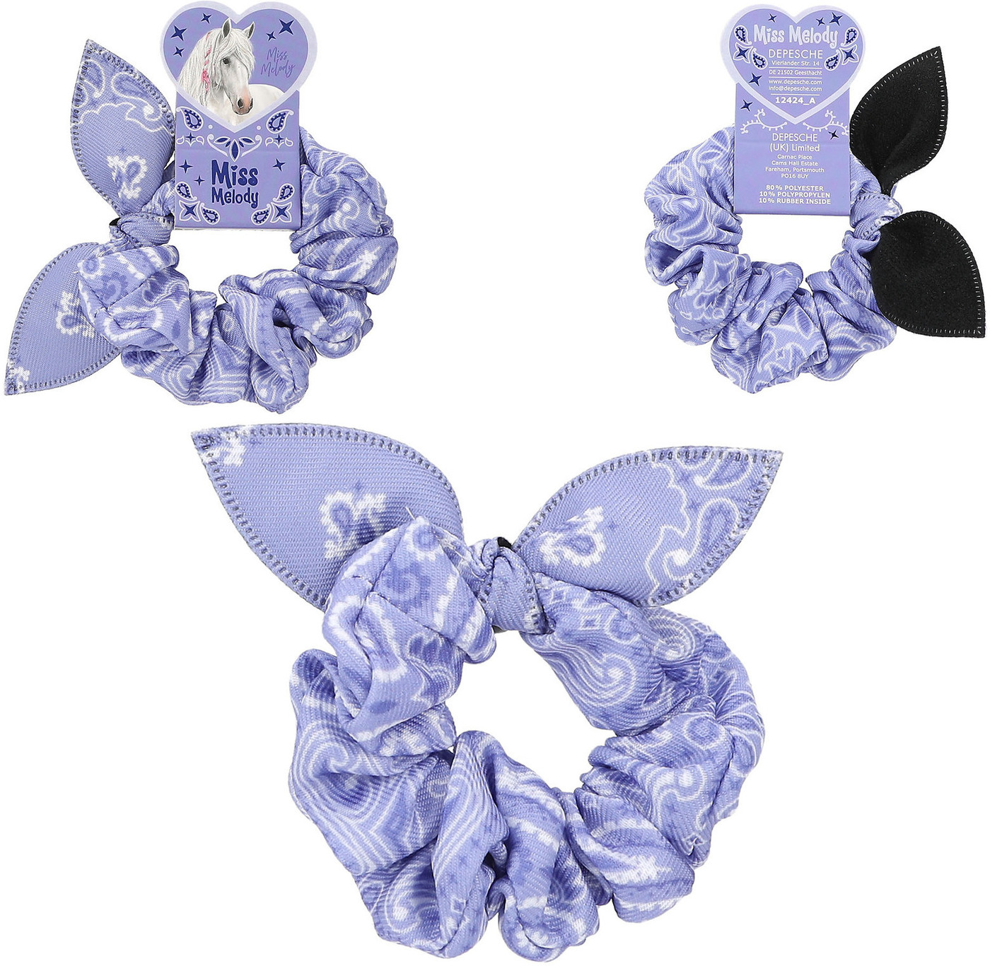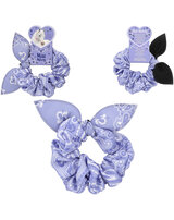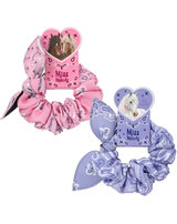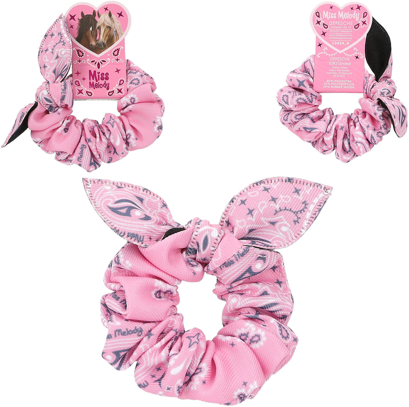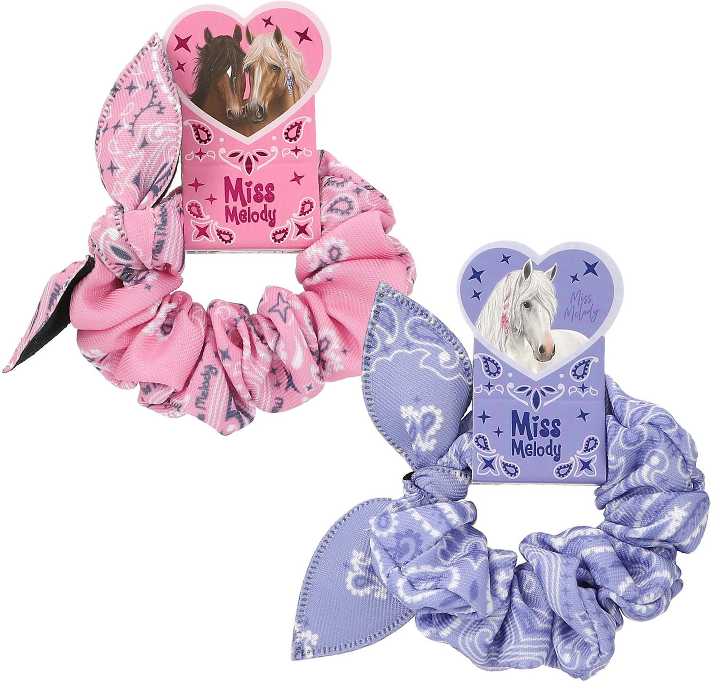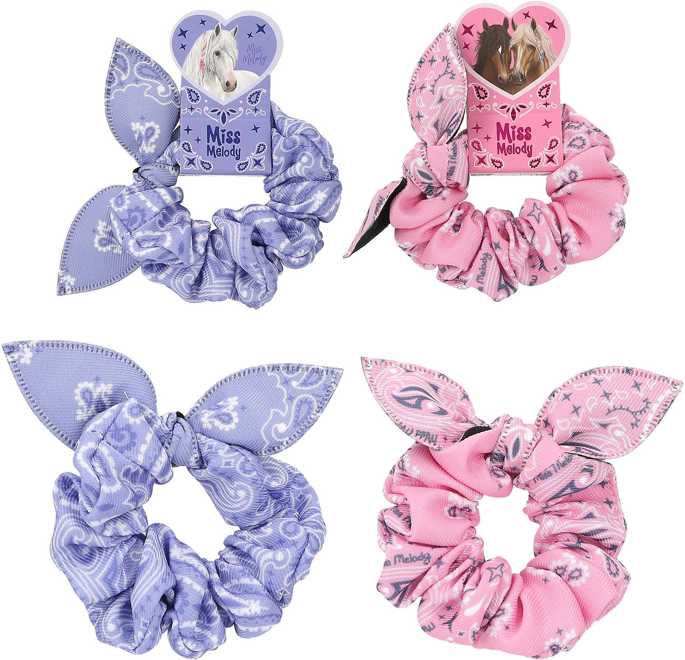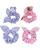 Miss Melody's pretty hair scrunchies in soft pink and lilac feature a trendy bandana pattern and a small decorative bow.