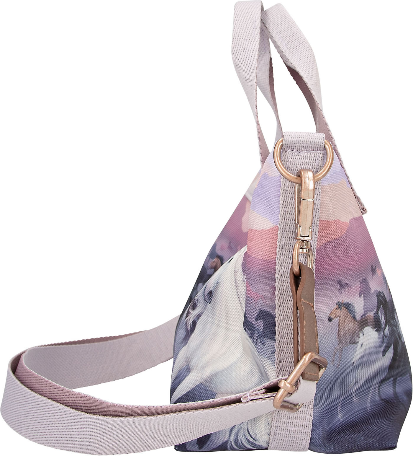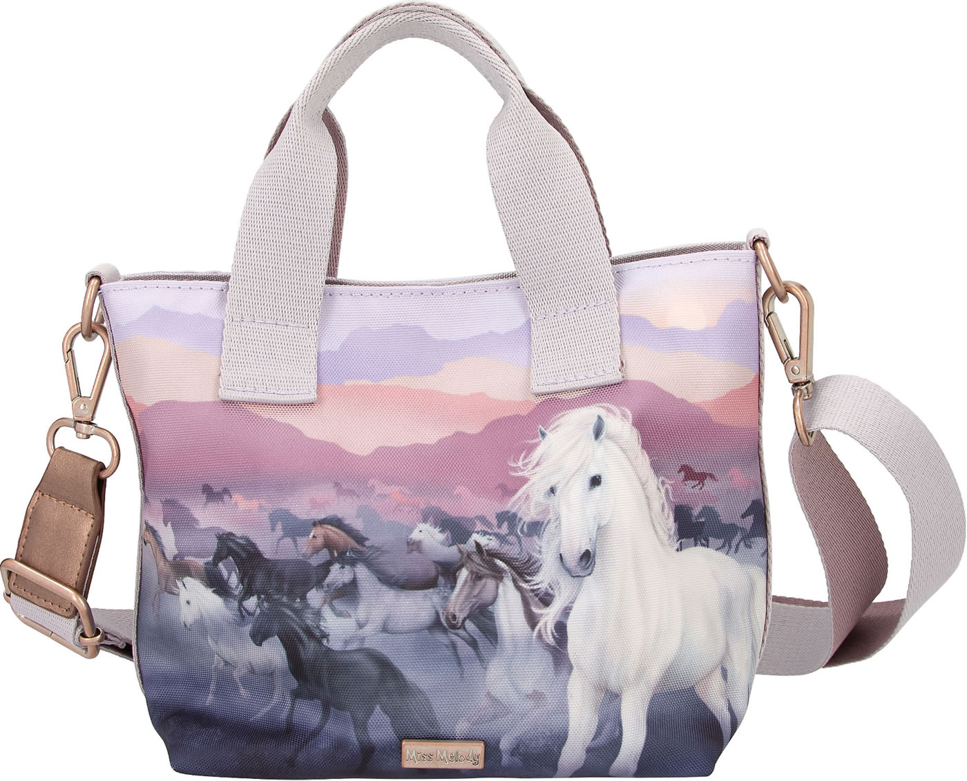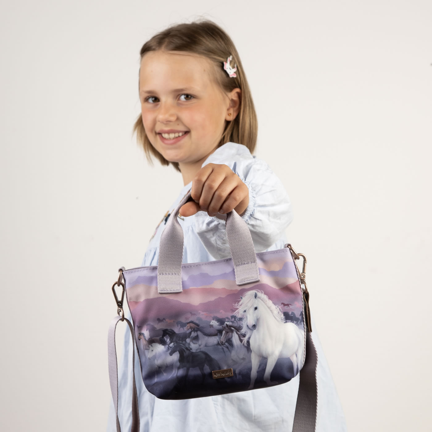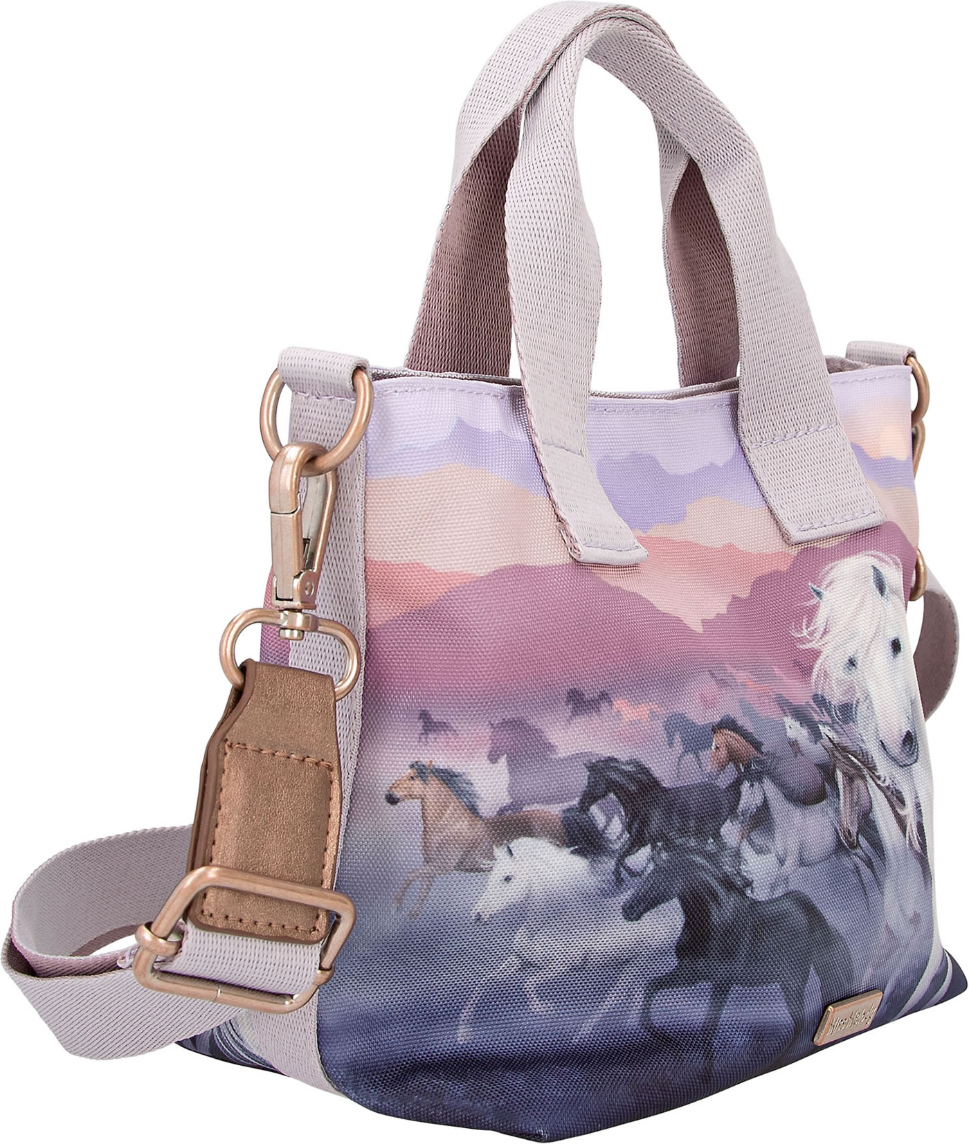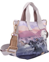 Fantastic horses all around: The small handbag by Miss Melody with a beautiful XL herd motif in purple and mauve tones in front of an atmospheric evening sky has two handles and closes with a snap fastener. The length-adjustable, color-coordinated shoulder strap is attached with copper-colored carabiners and can therefore be removed.