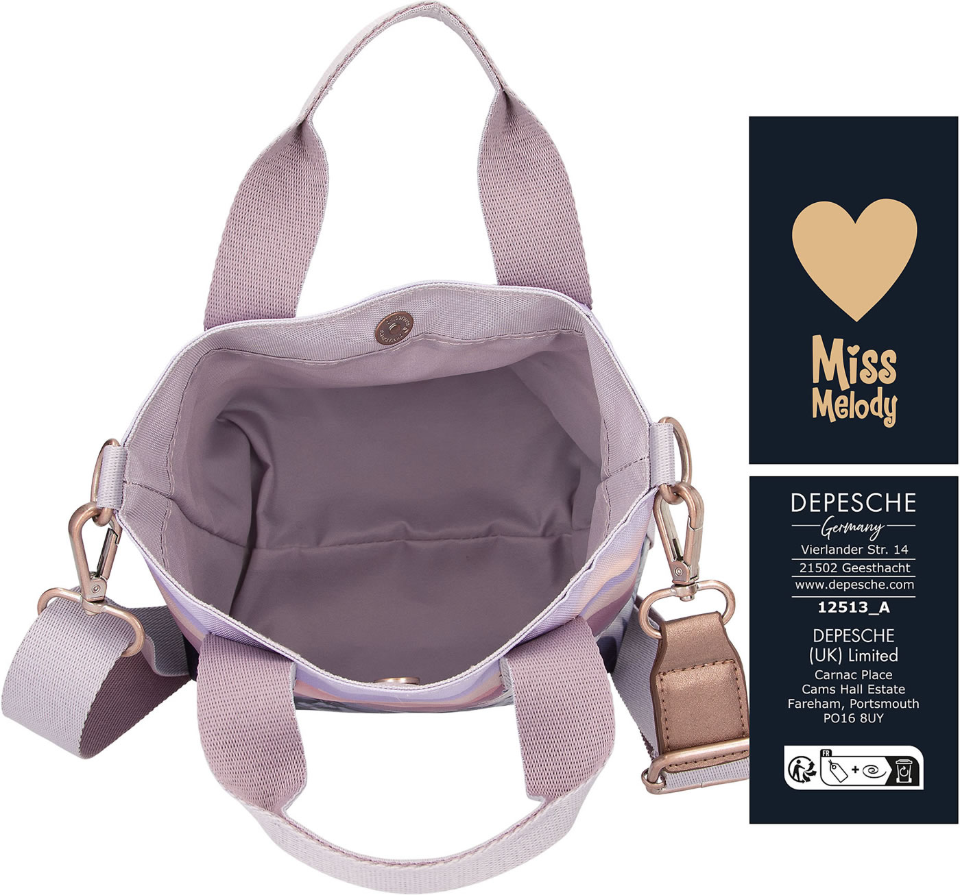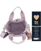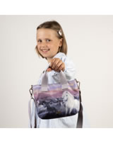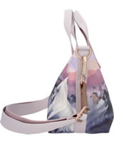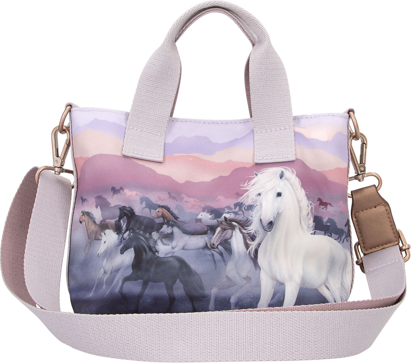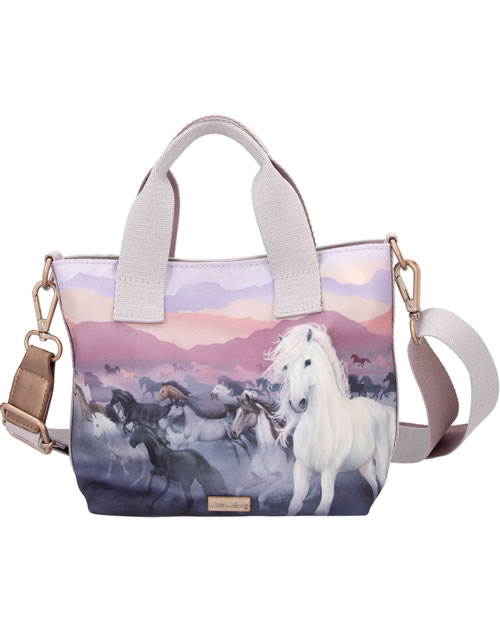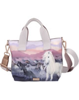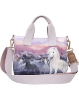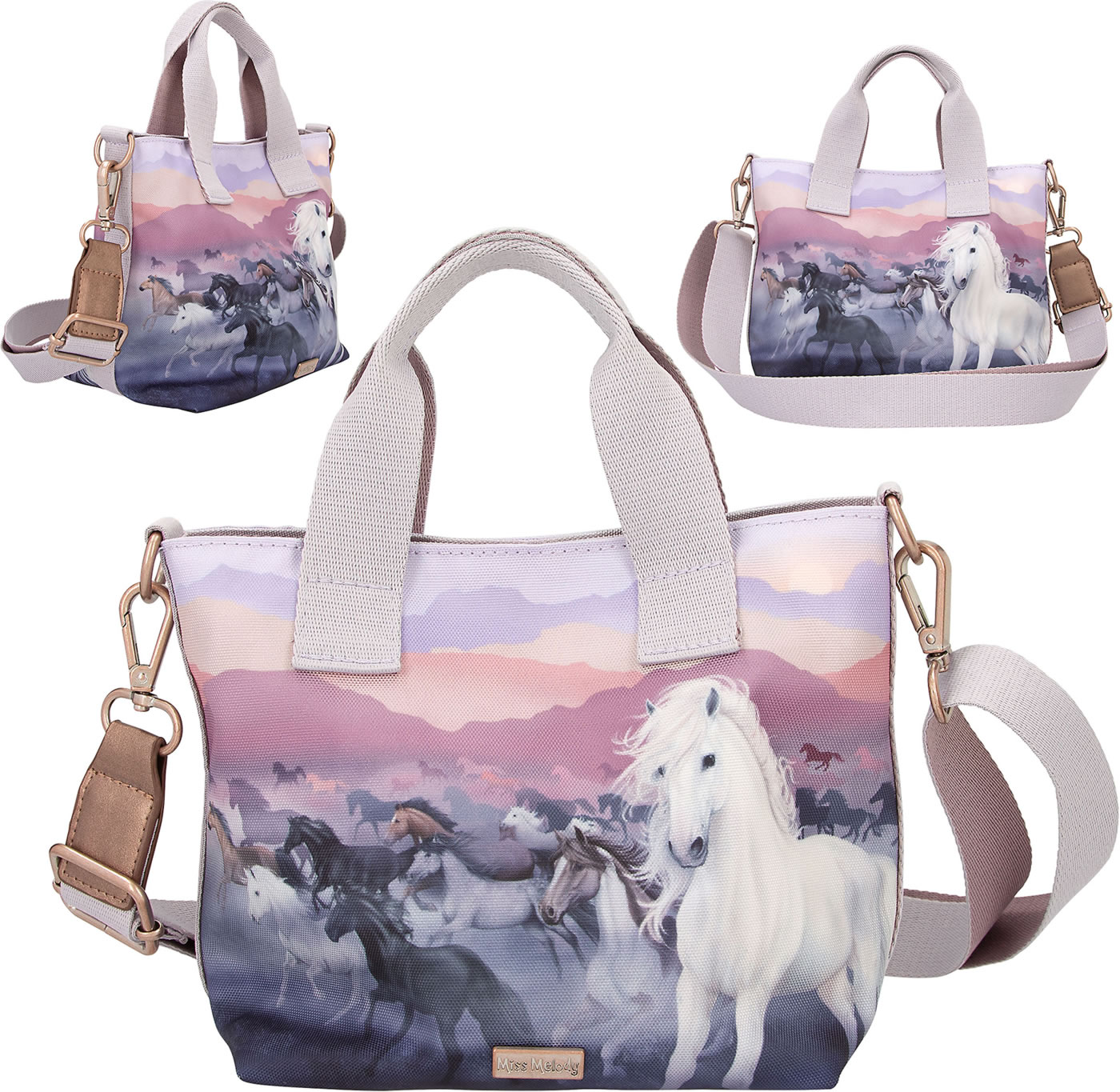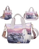 Fantastic horses all around: The small handbag by Miss Melody with a beautiful XL herd motif in purple and mauve tones in front of an atmospheric evening sky has two handles and closes with a snap fastener. The length-adjustable, color-coordinated shoulder strap is attached with copper-colored carabiners and can therefore be removed.