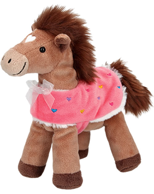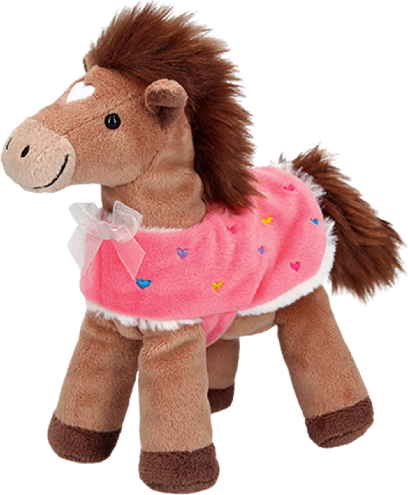 The new foal on the horse farm is called Heartbreaker. It has a dark brown mane and hooves. The blanket is embroidered with colorful hearts and a heart is also on the forehead of the foal.