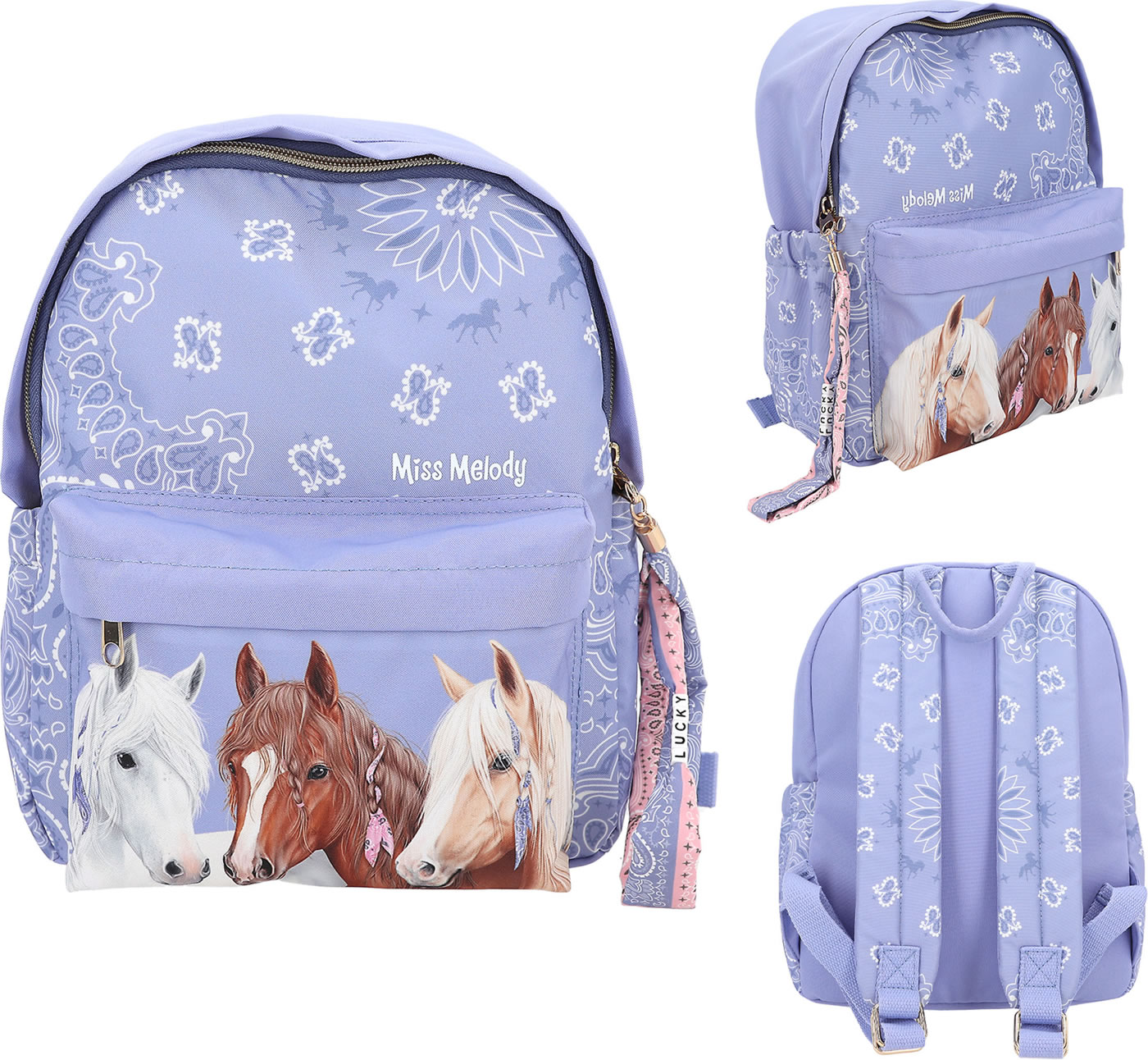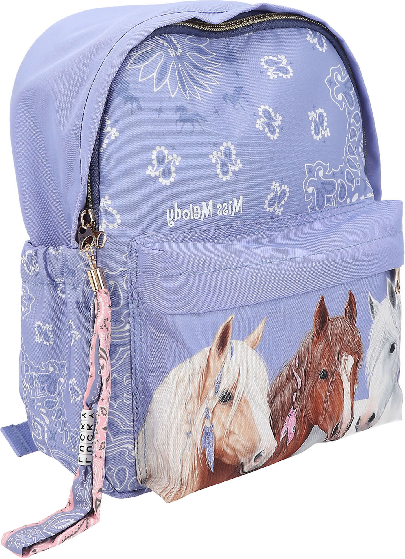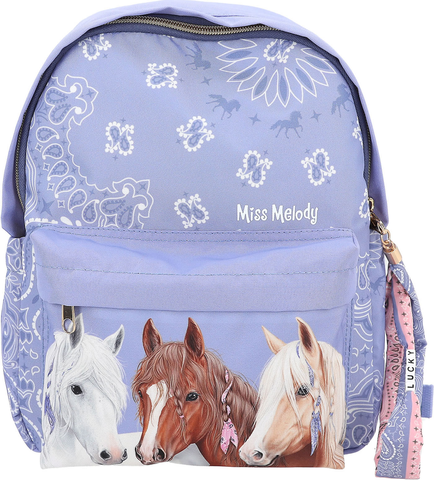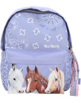 Fantastically beautiful: The smoke blue backpack from Miss Melody has a great horse motif on the front pocket and a hip bandana pattern on the rest of the front, the padded straps and the side pockets. With super cool long zipper pendant made of textile ribbons and LUCKY letter beads.