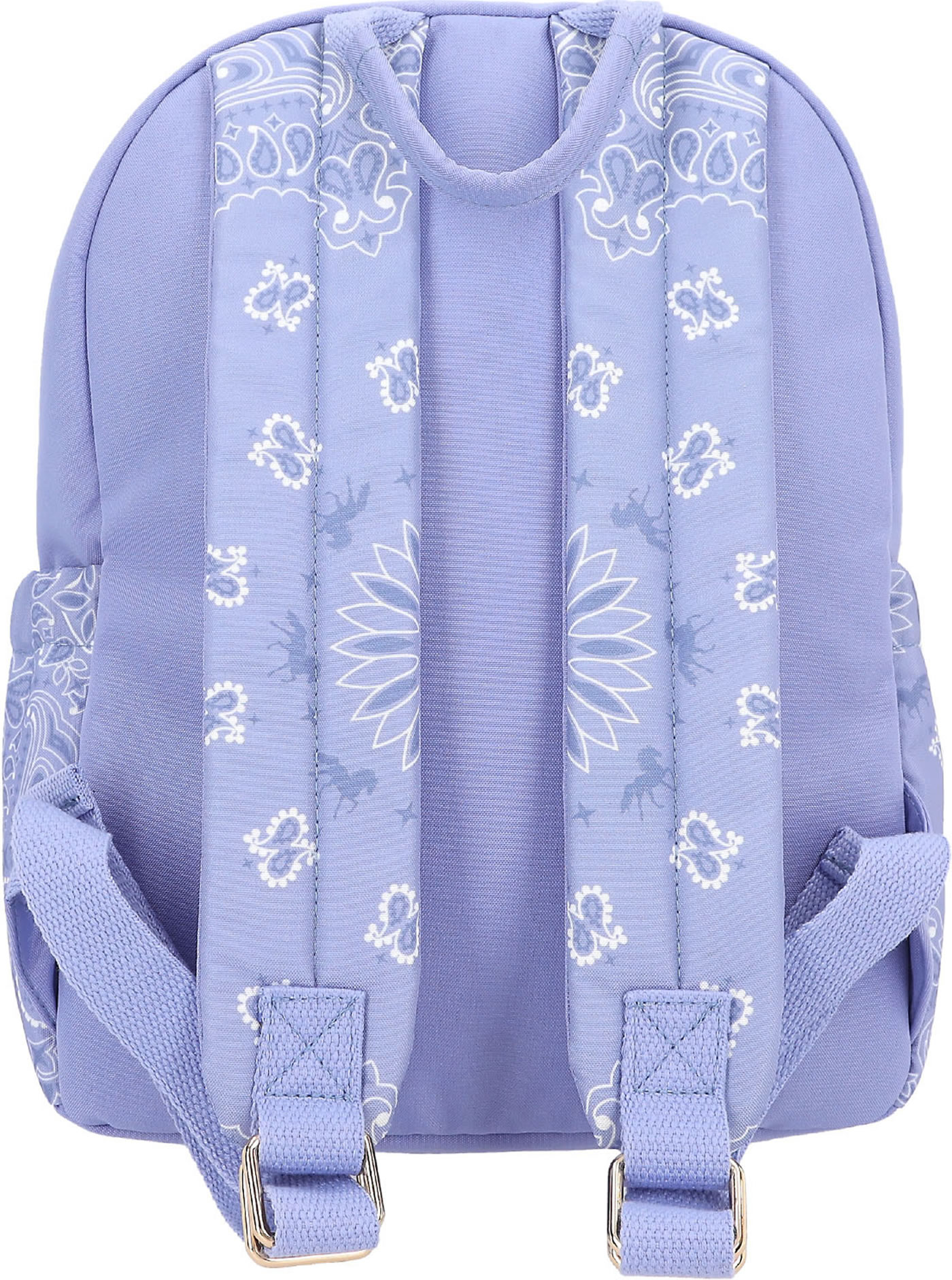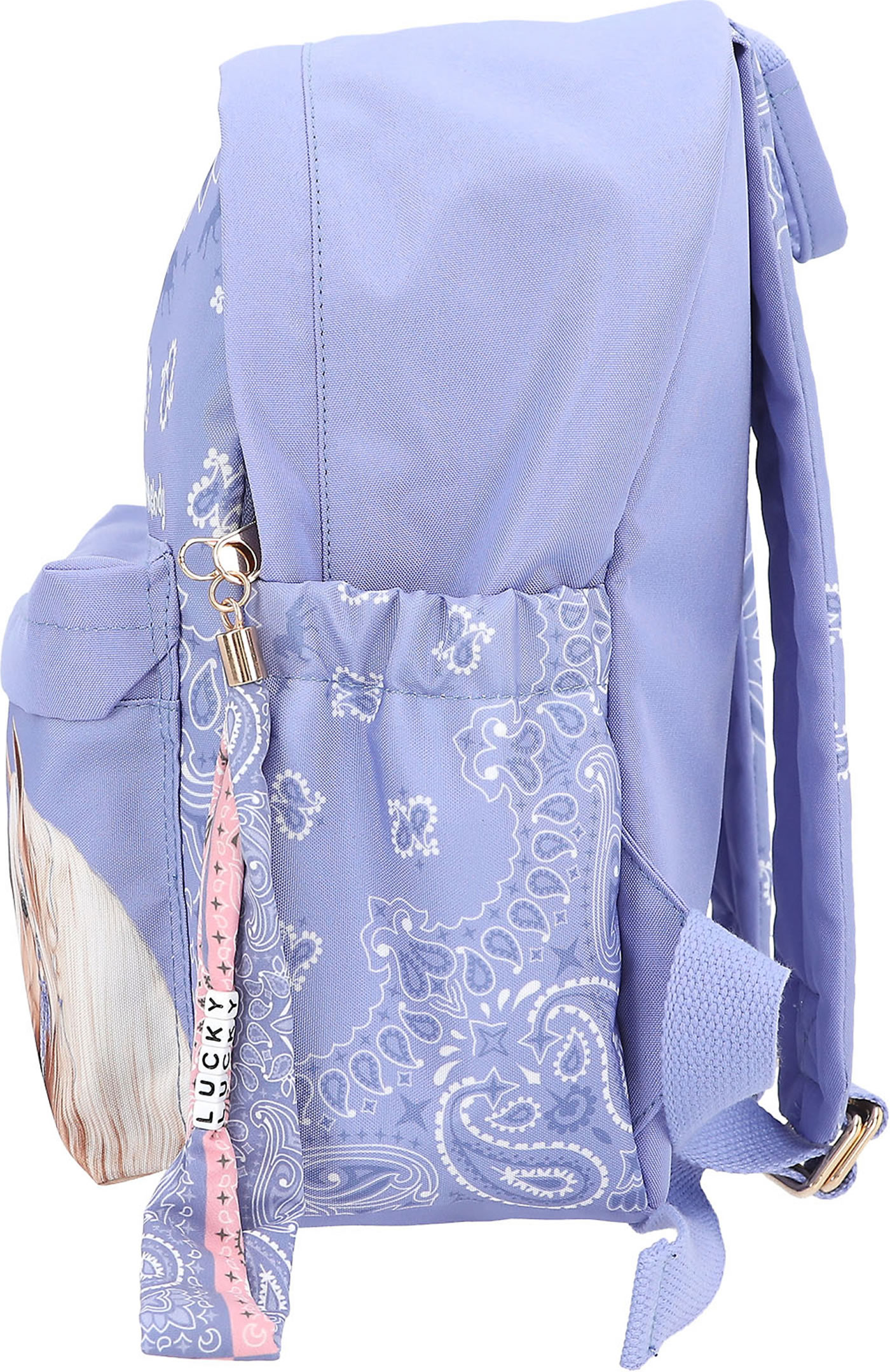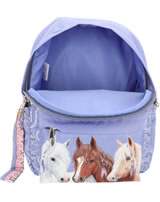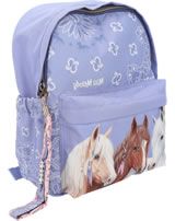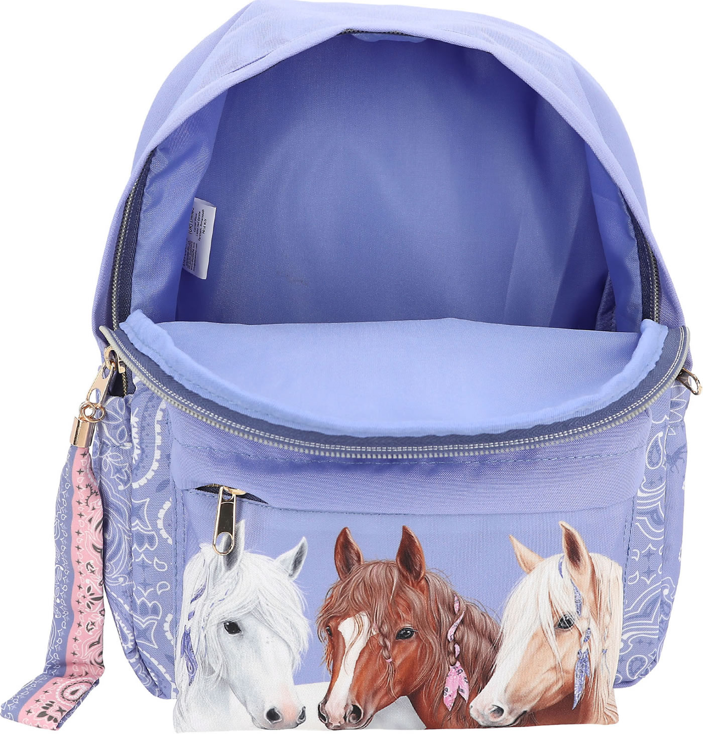 Fantastically beautiful: The smoke blue backpack from Miss Melody has a great horse motif on the front pocket and a hip bandana pattern on the rest of the front, the padded straps and the side pockets. With super cool long zipper pendant made of textile ribbons and LUCKY letter beads.
