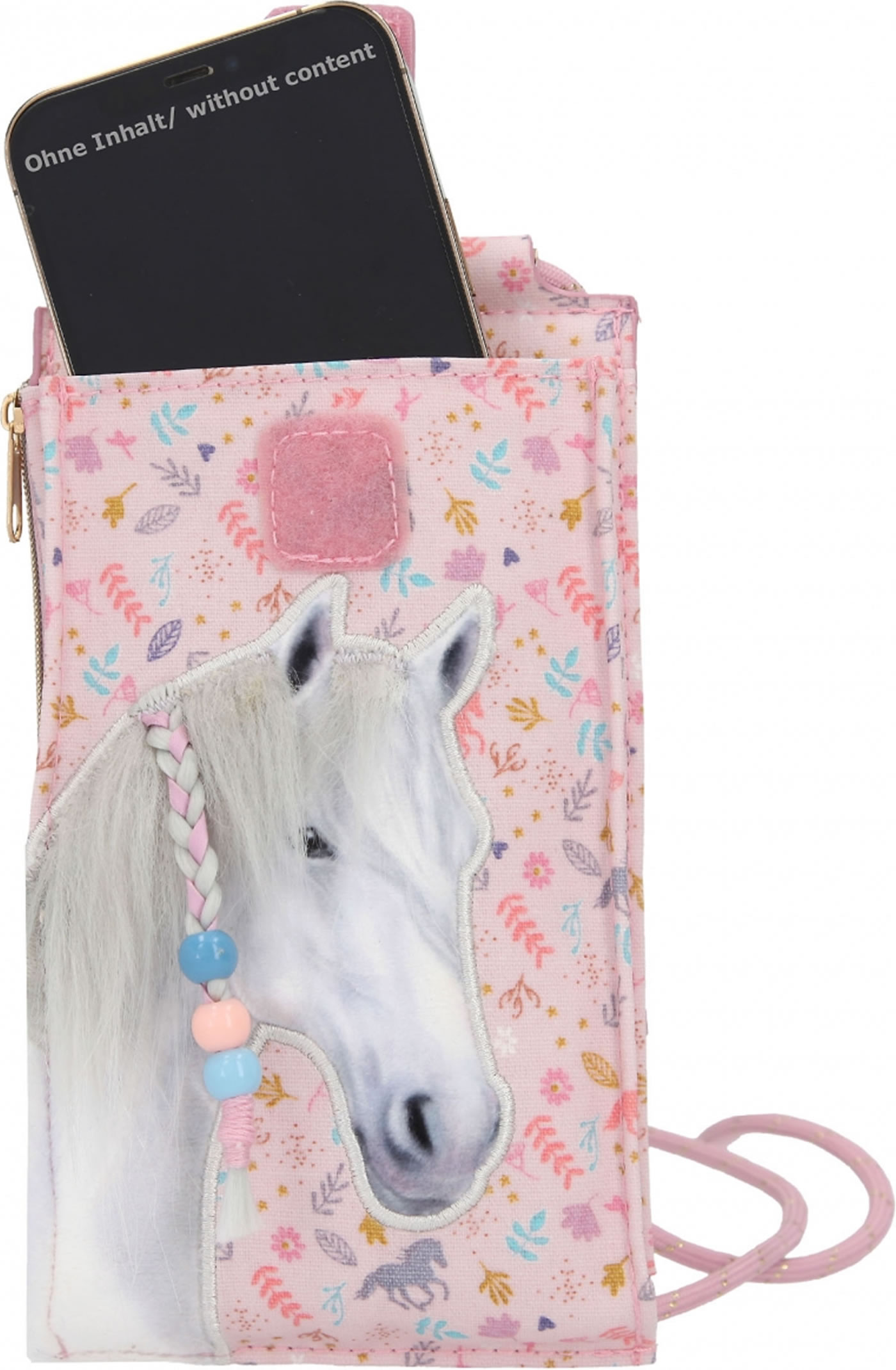 Most common mobile phone sizes fit into this pocket. With the strap it can be worn around the neck.