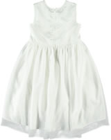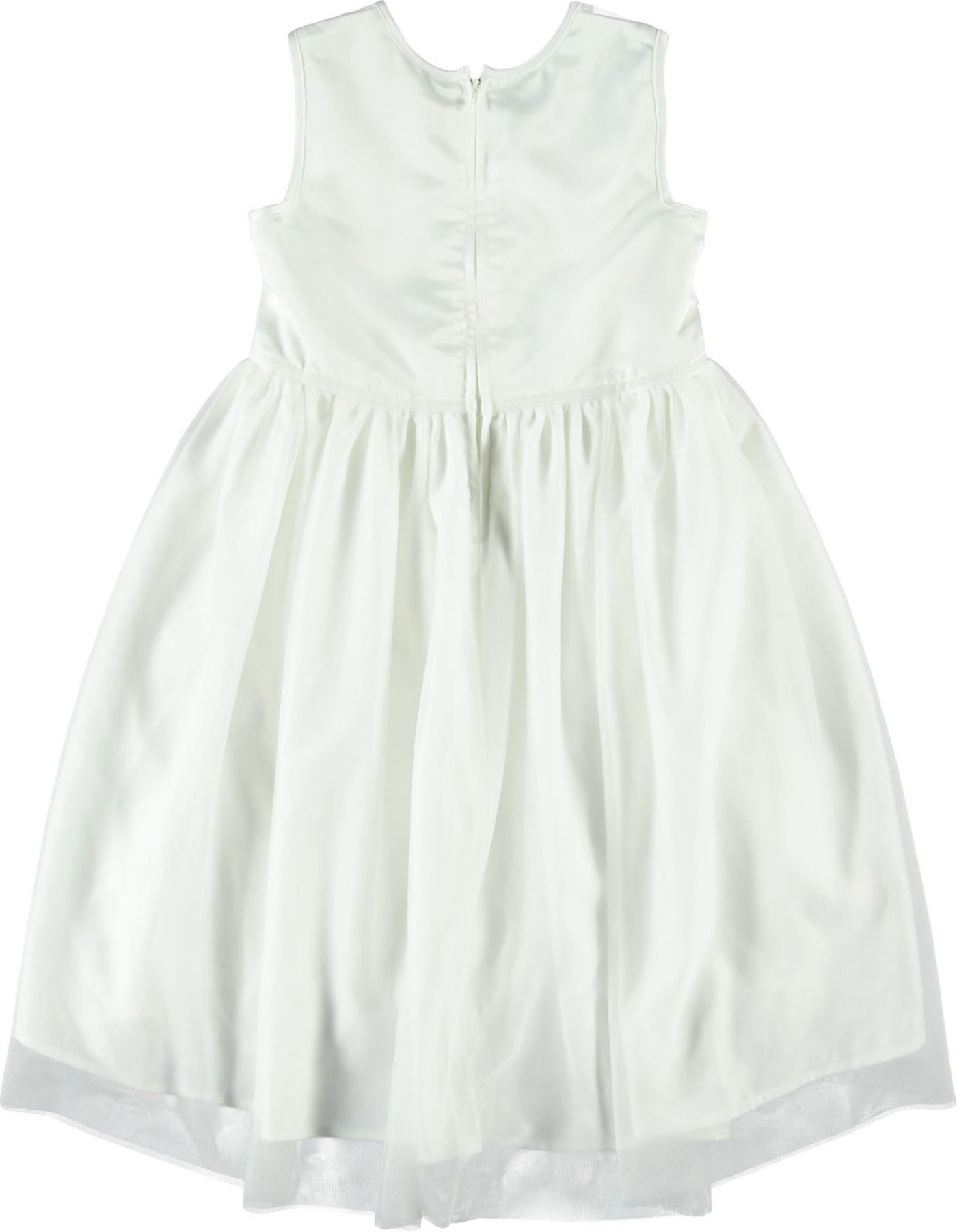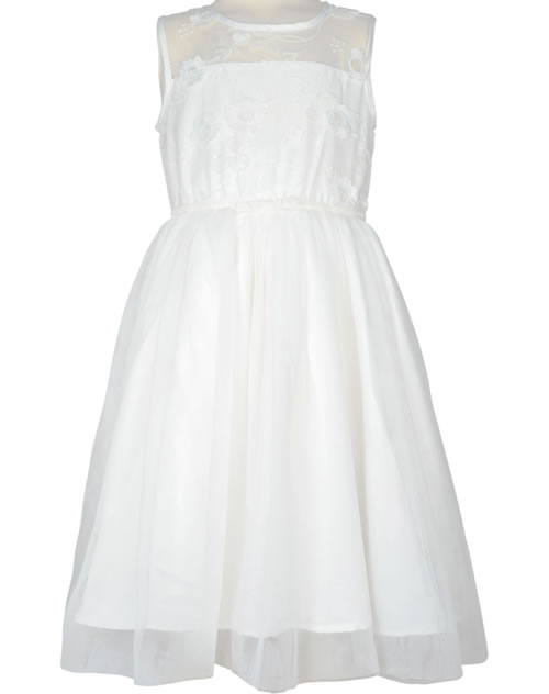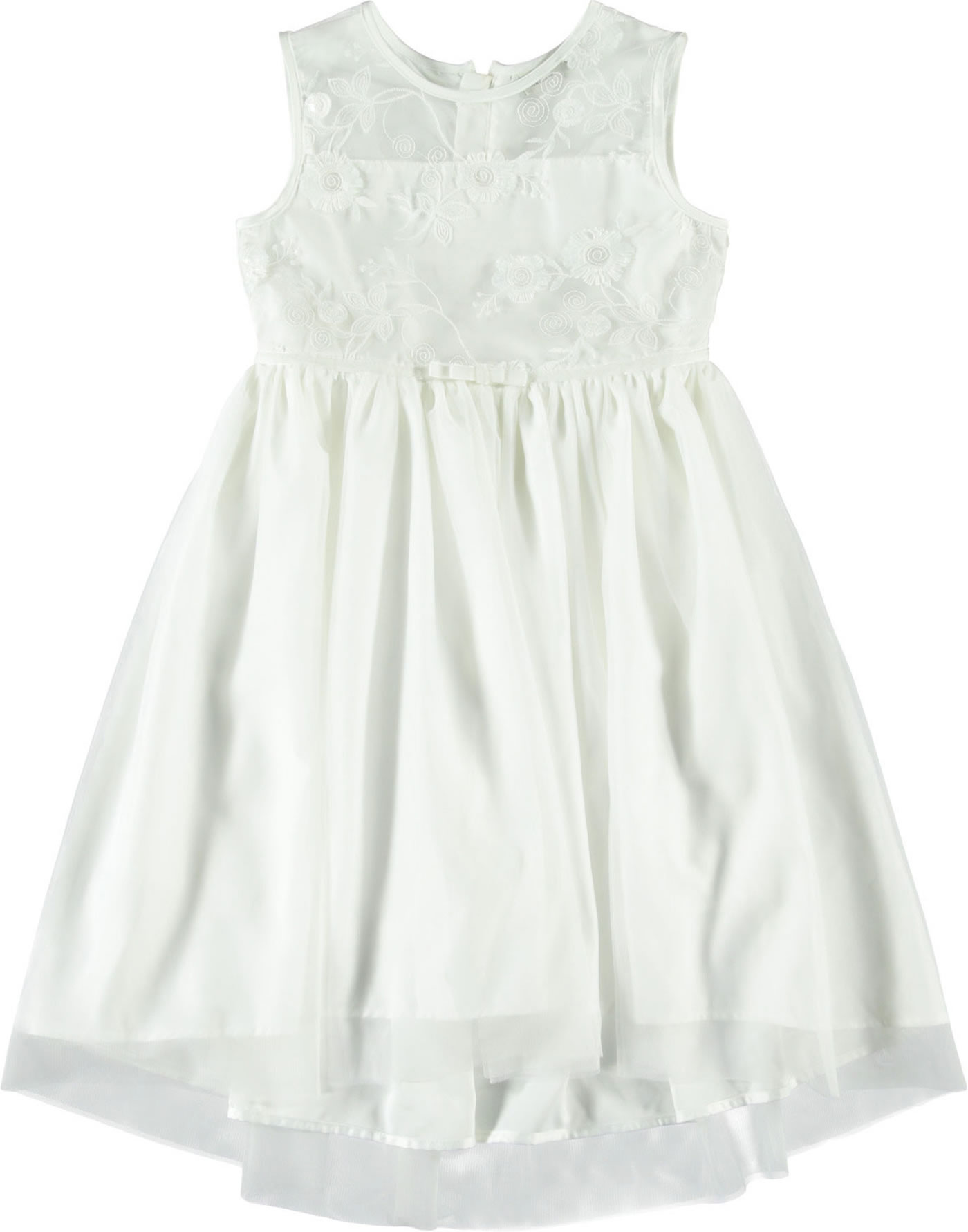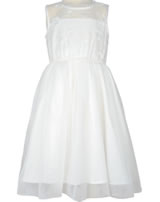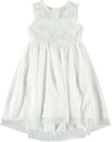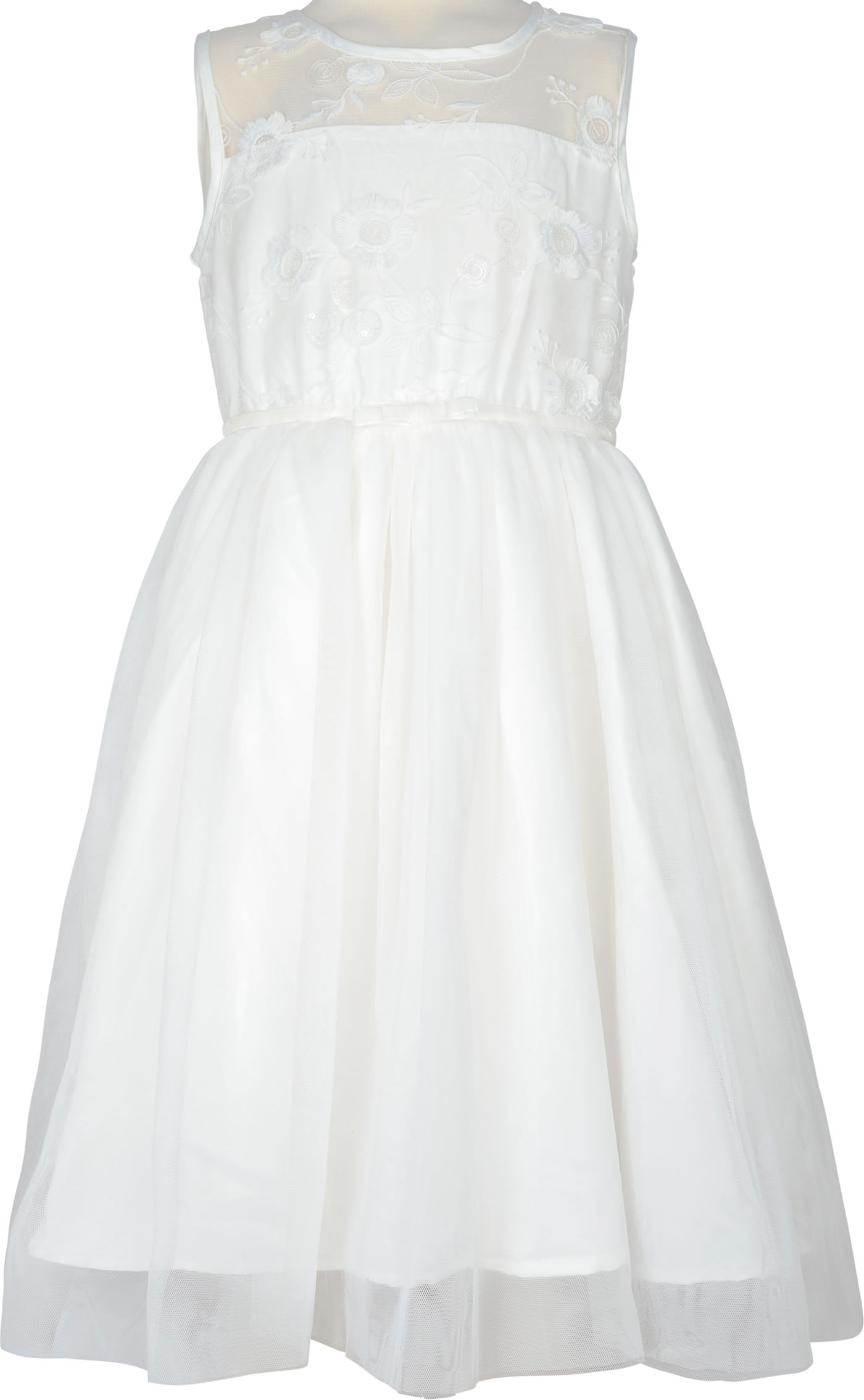 Festive lace dress with straps in bright white by NAME IT for girls. To close with a zipper on the back. With tulle skirt and opaque slip. Nice details are the embroidered floral pattern with sequins on the chest and the small bow at the waist.