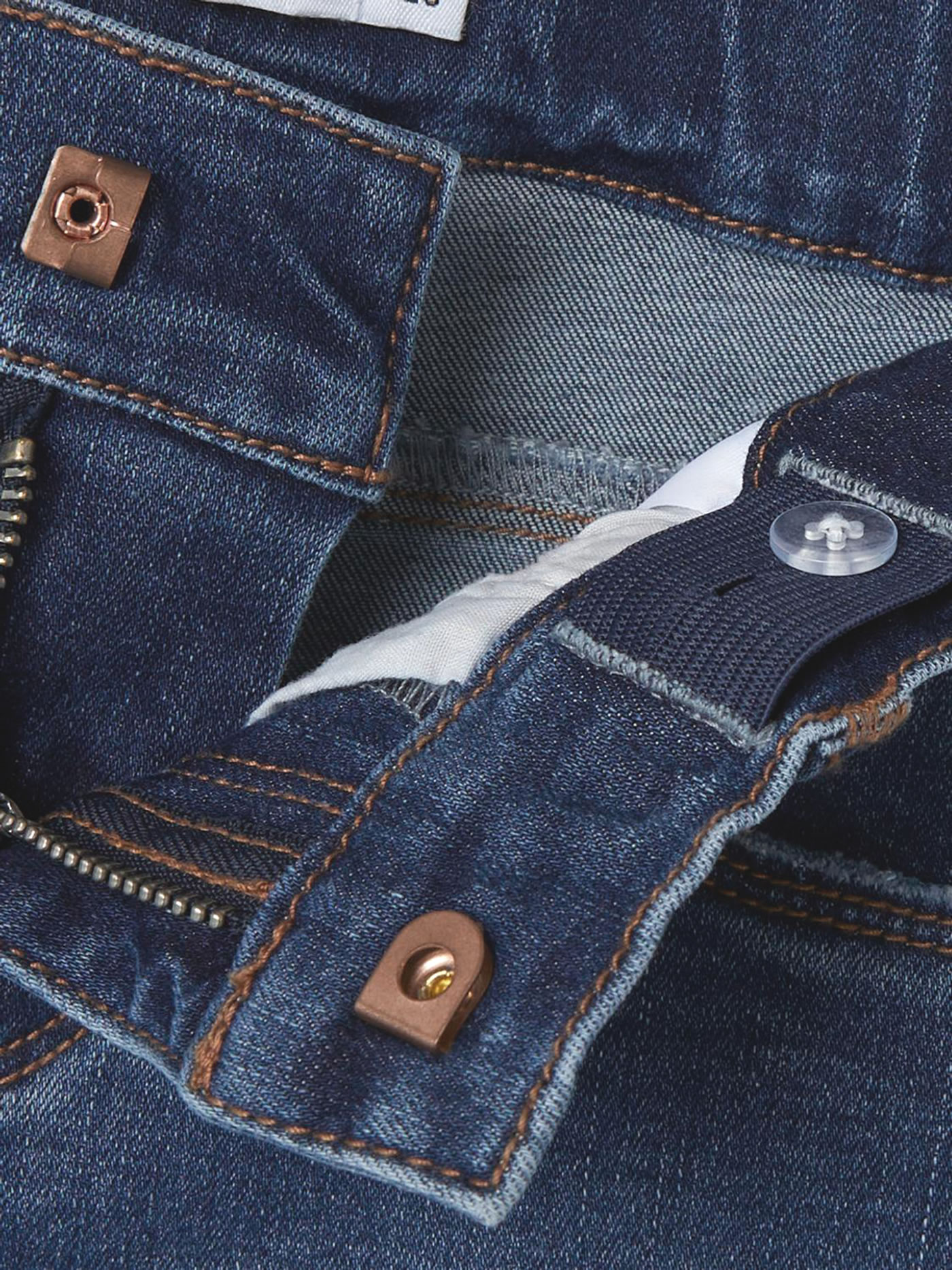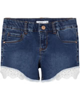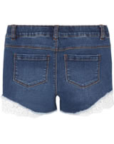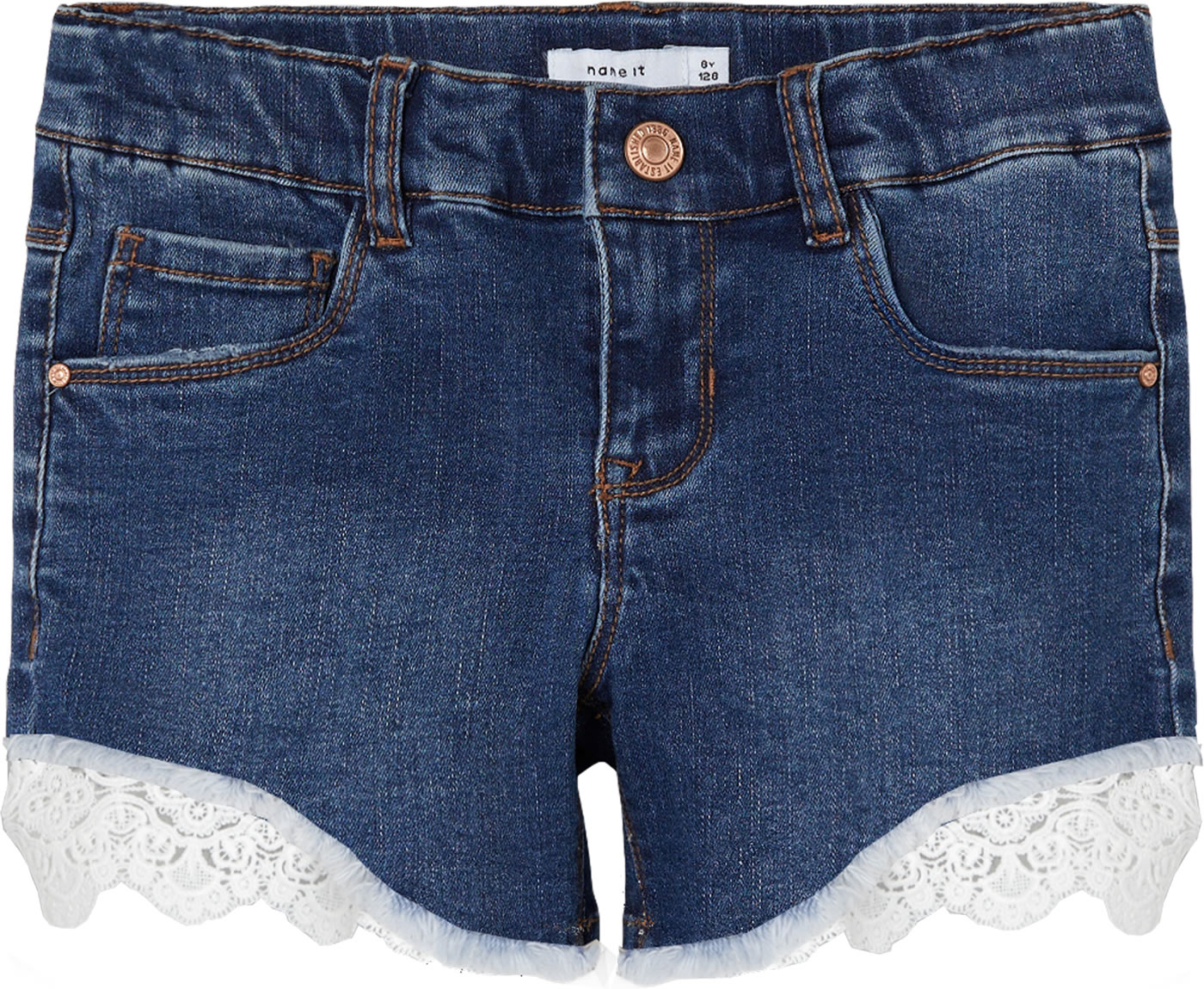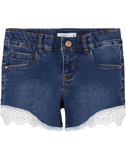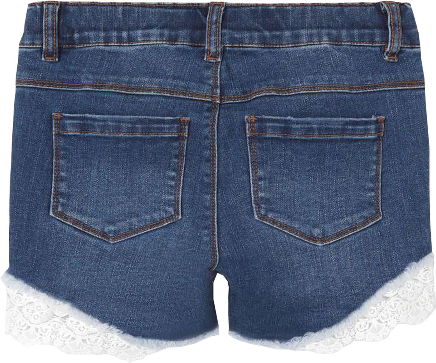 Jeans shorts for girls from NAME IT. The shorts have a hook closure and the width is adjustable at the waist. The shorts are in five pocket style and special details are the frayed hems and the integrated lace on the legs.