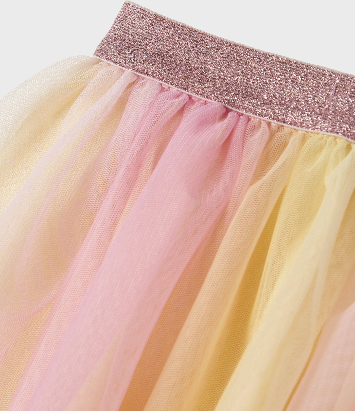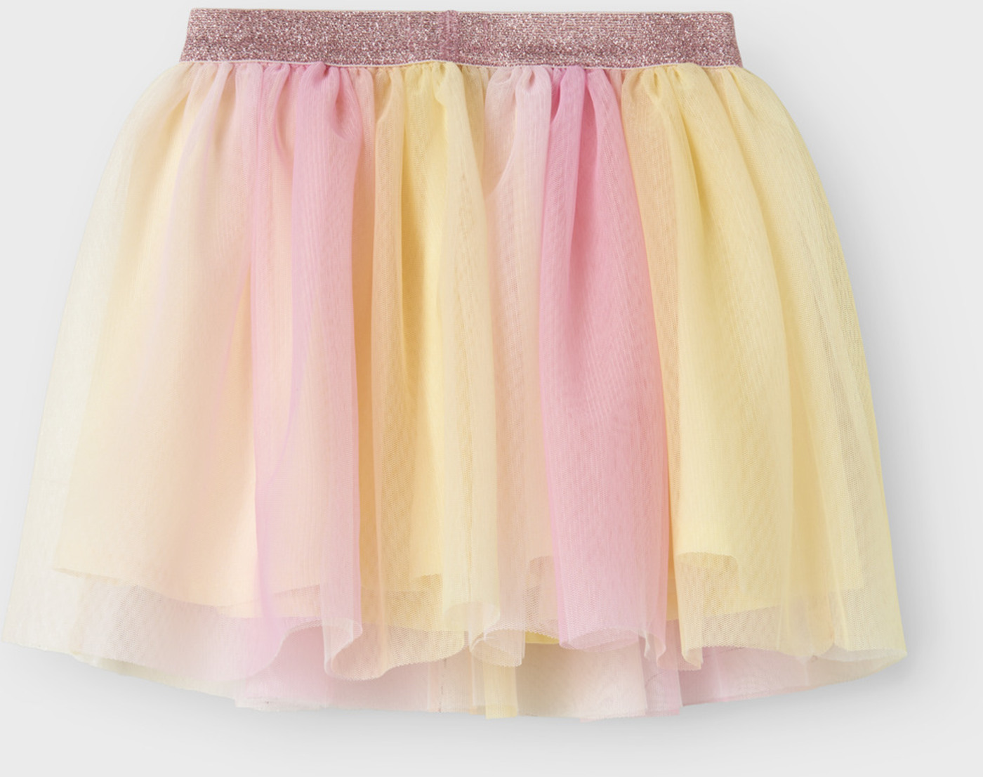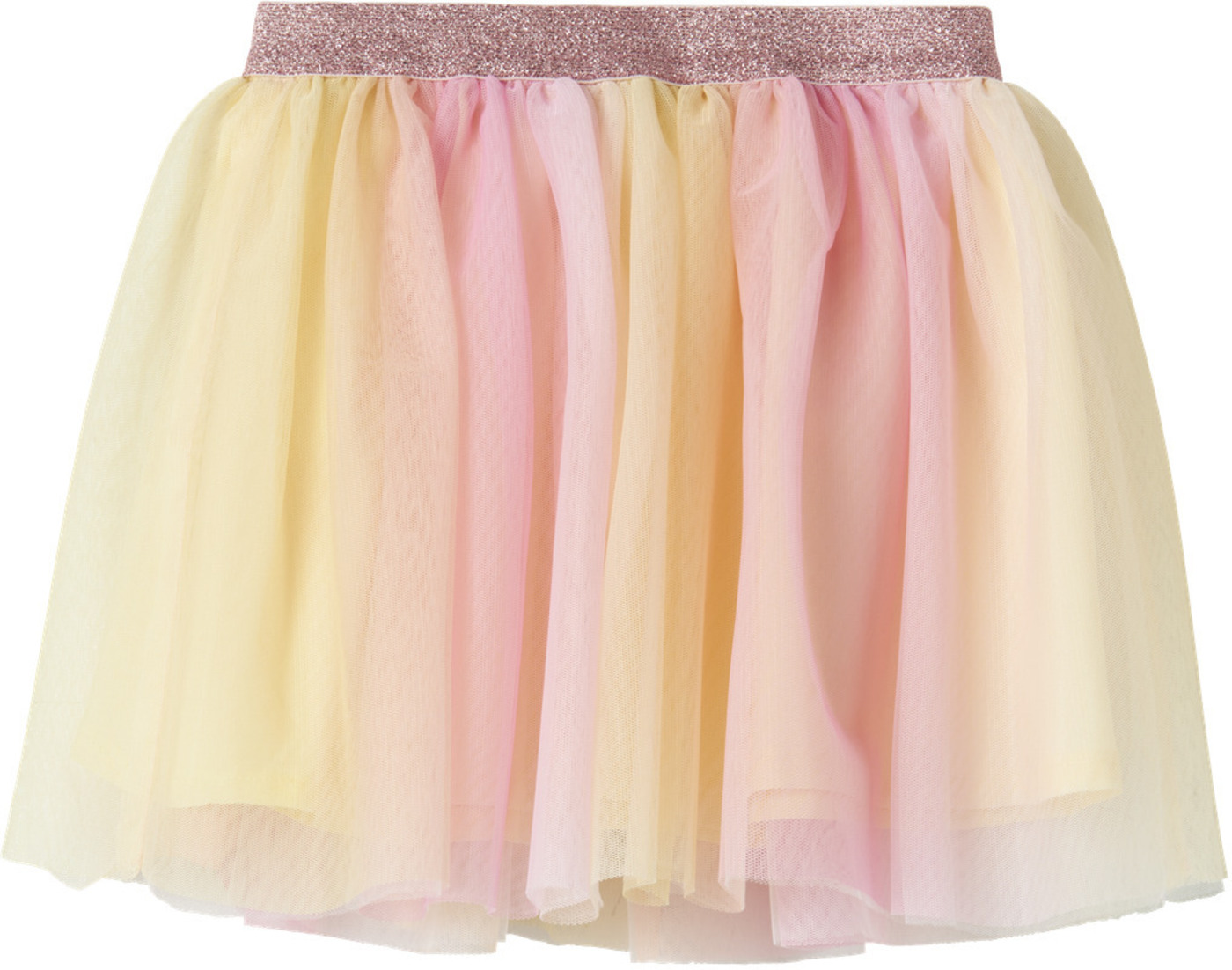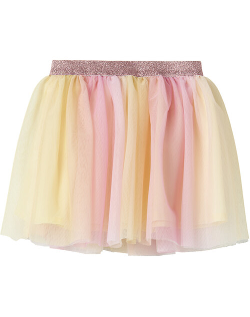 A wide, flowing skirt by Name it. The skirt is made from two layers of thin tulle and a polyester lining for added opacity. The elastic cuffs ensure a perfect fit. The gradient color and glittery waistband are particularly beautiful details.
