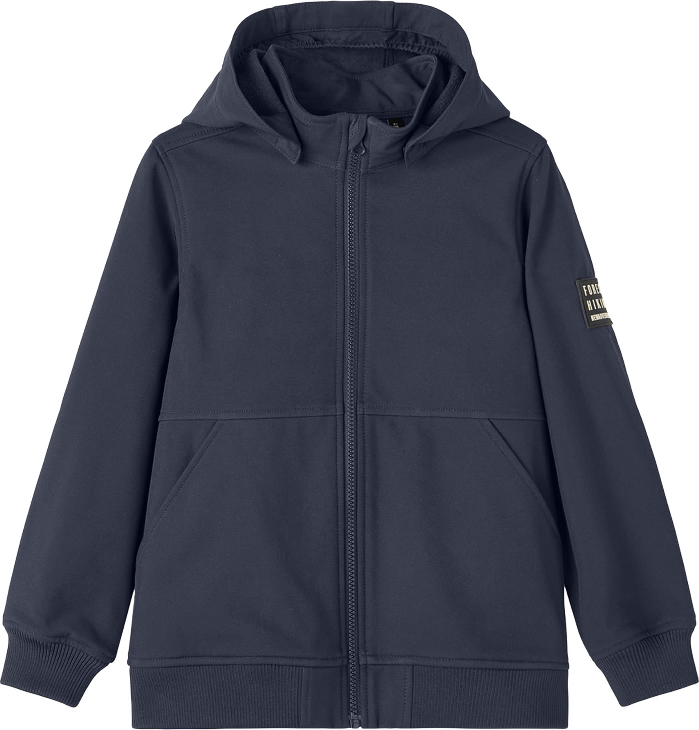 Softshell jacket with detachable hood by NAME IT for boys. The comfortable jacket is fully lined with soft fleece. There are two pockets on the front. The jacket can be closed with a zipper. Elastic cuffs on the sleeves offer additional wind protection and reflectors ensure better visibility in the dark. The patches on the left sleeve are a great eye-catcher. The Bionic-Finish ECO impregnation is based on a fluorine-free recipe and keeps the color and the fabric new for longer.