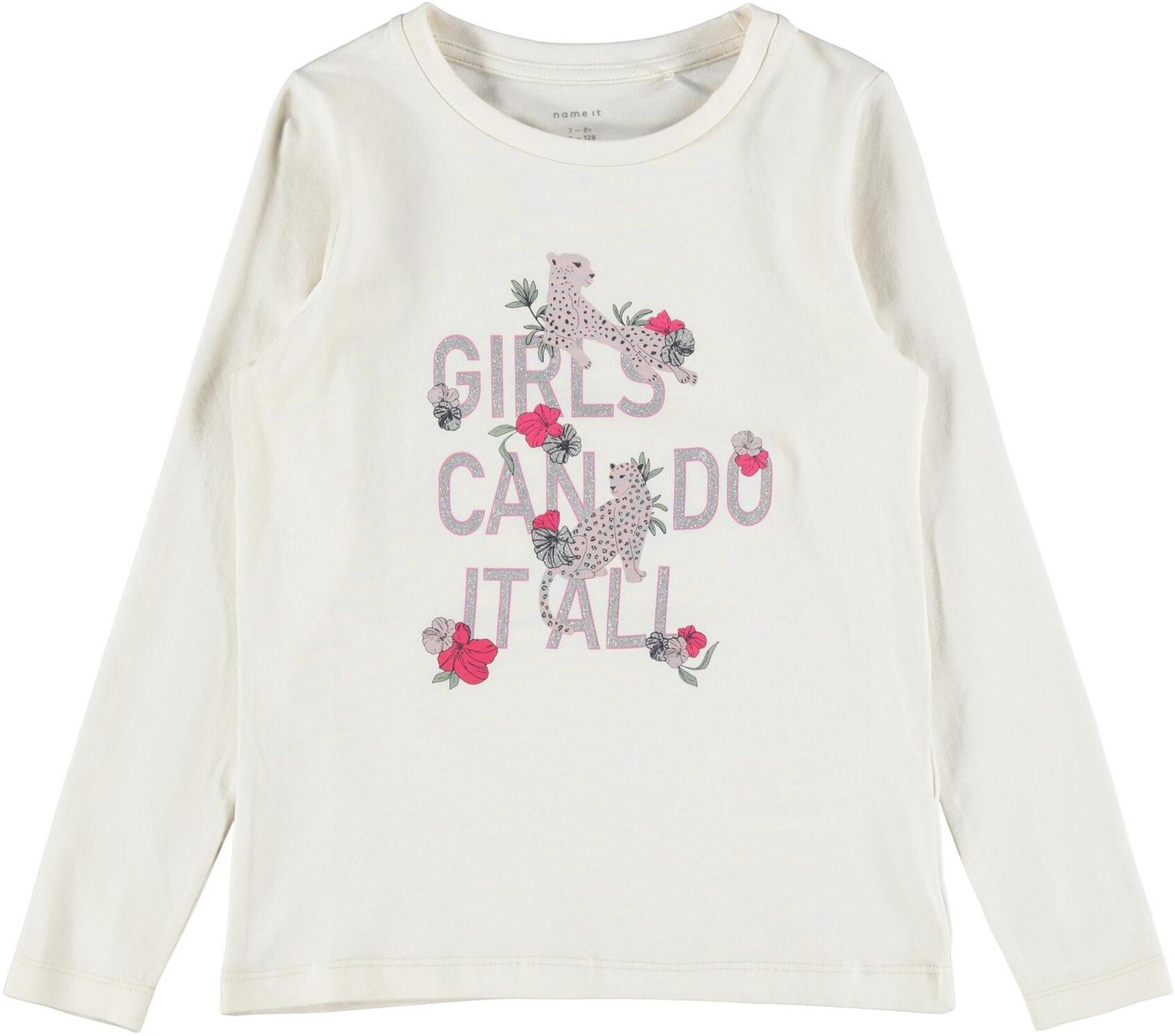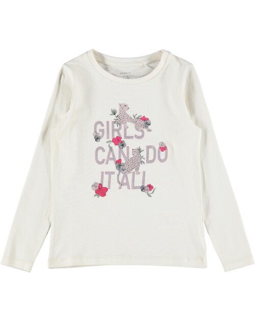 Long sleeve shirt for girls by NAME IT. The t-shirt has a great print with glitter and leopards on the front. The soft material ensures a high level of comfort.