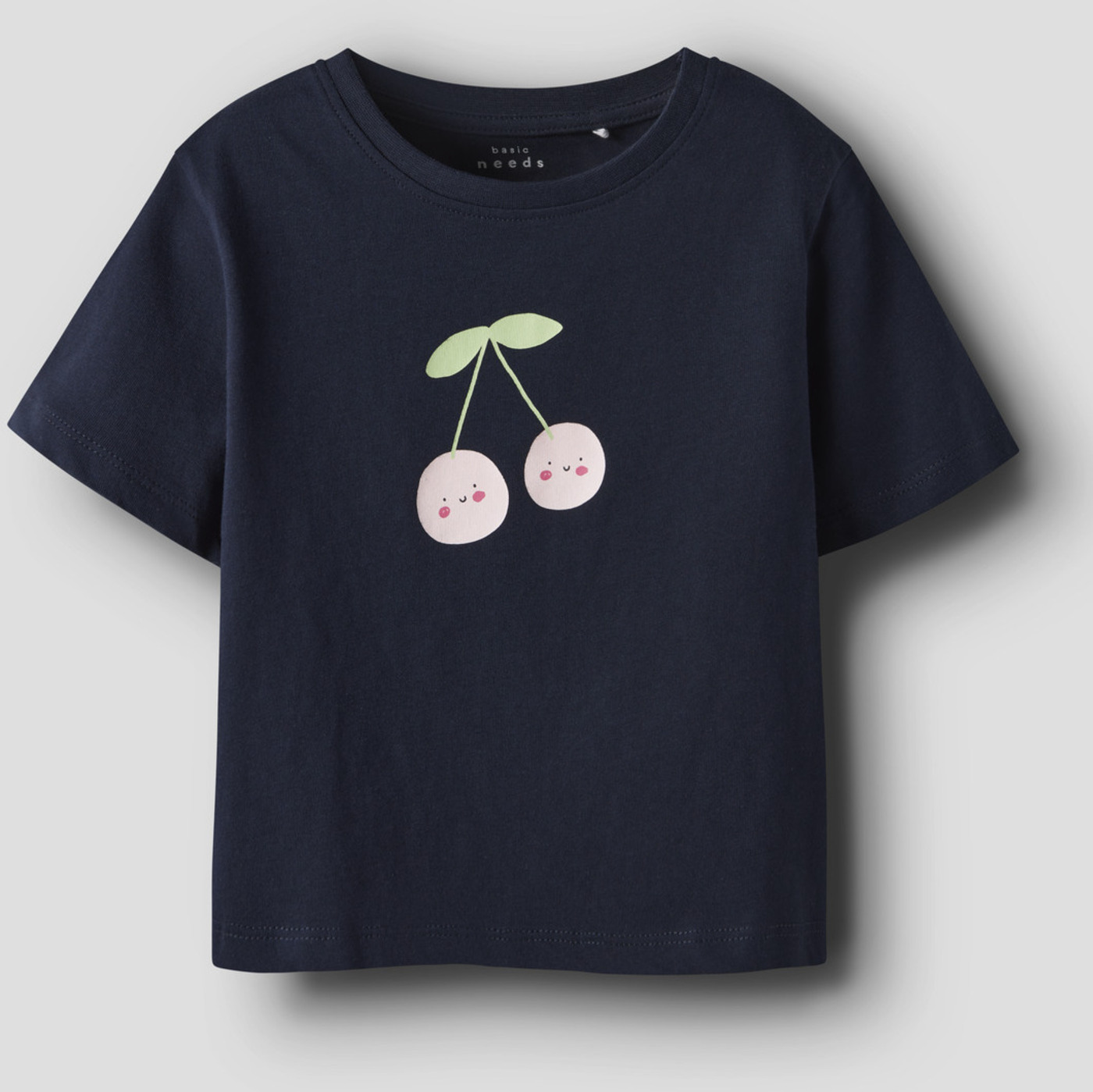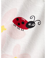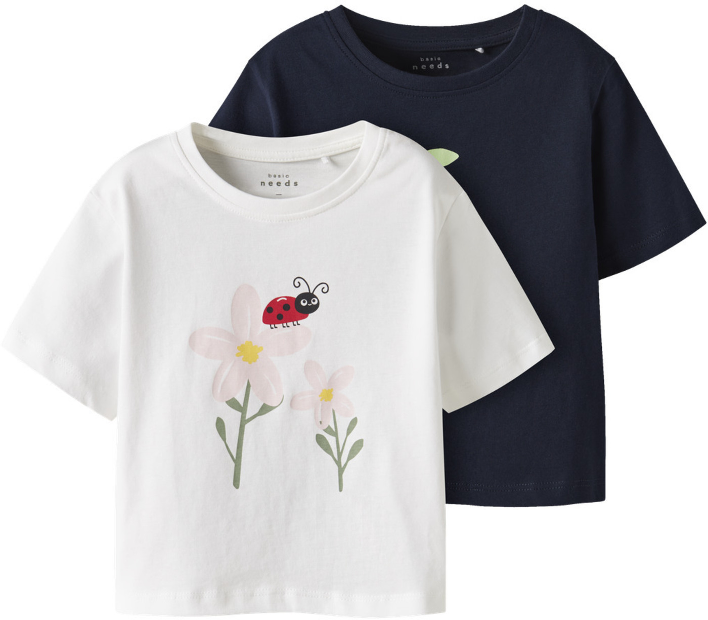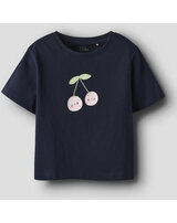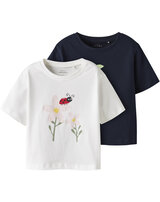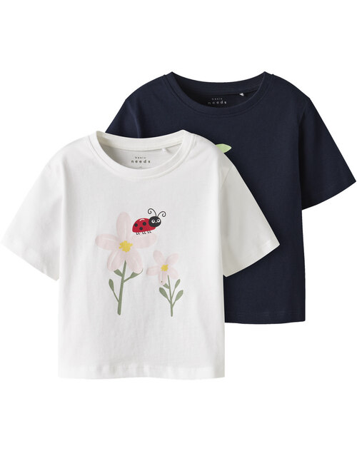 Great short-sleeved shirts in a pack of 2 for girls from NAME IT. The blue shirt has a great print with cherries and the white shirt has a flower with a ladybug on the front.