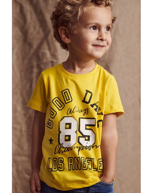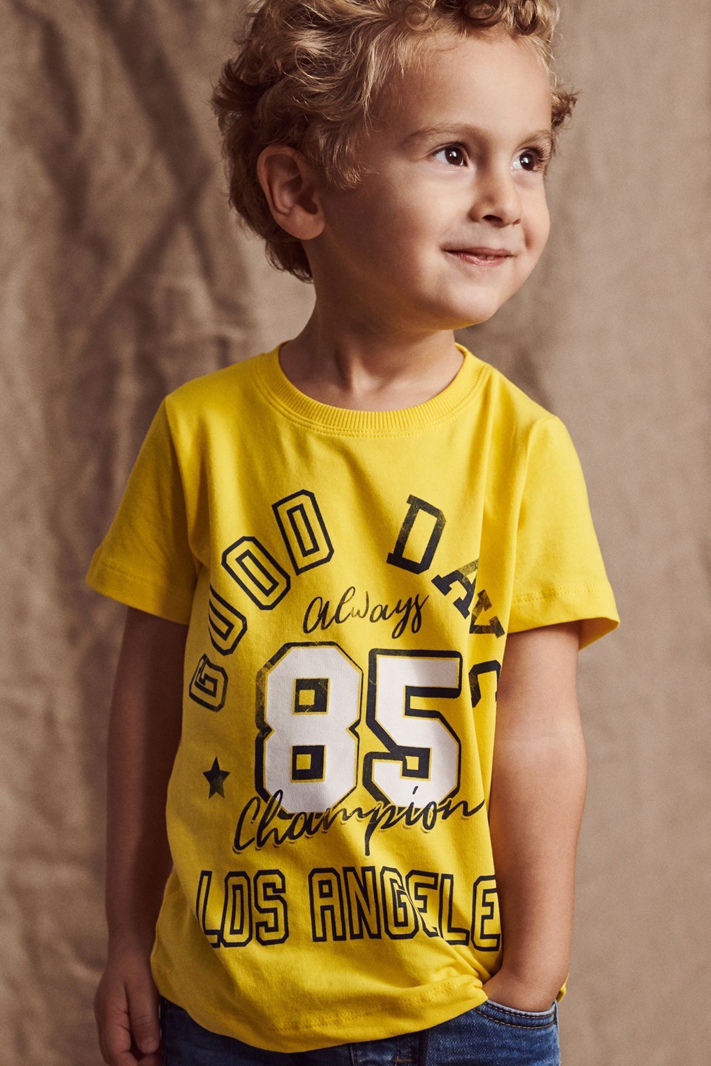 Plain short-sleeved shirt in empire yellow for boys by NAME IT. The t-shirt has a cool print on the front. It can be easily combined. The soft material ensures a high level of comfort.