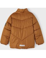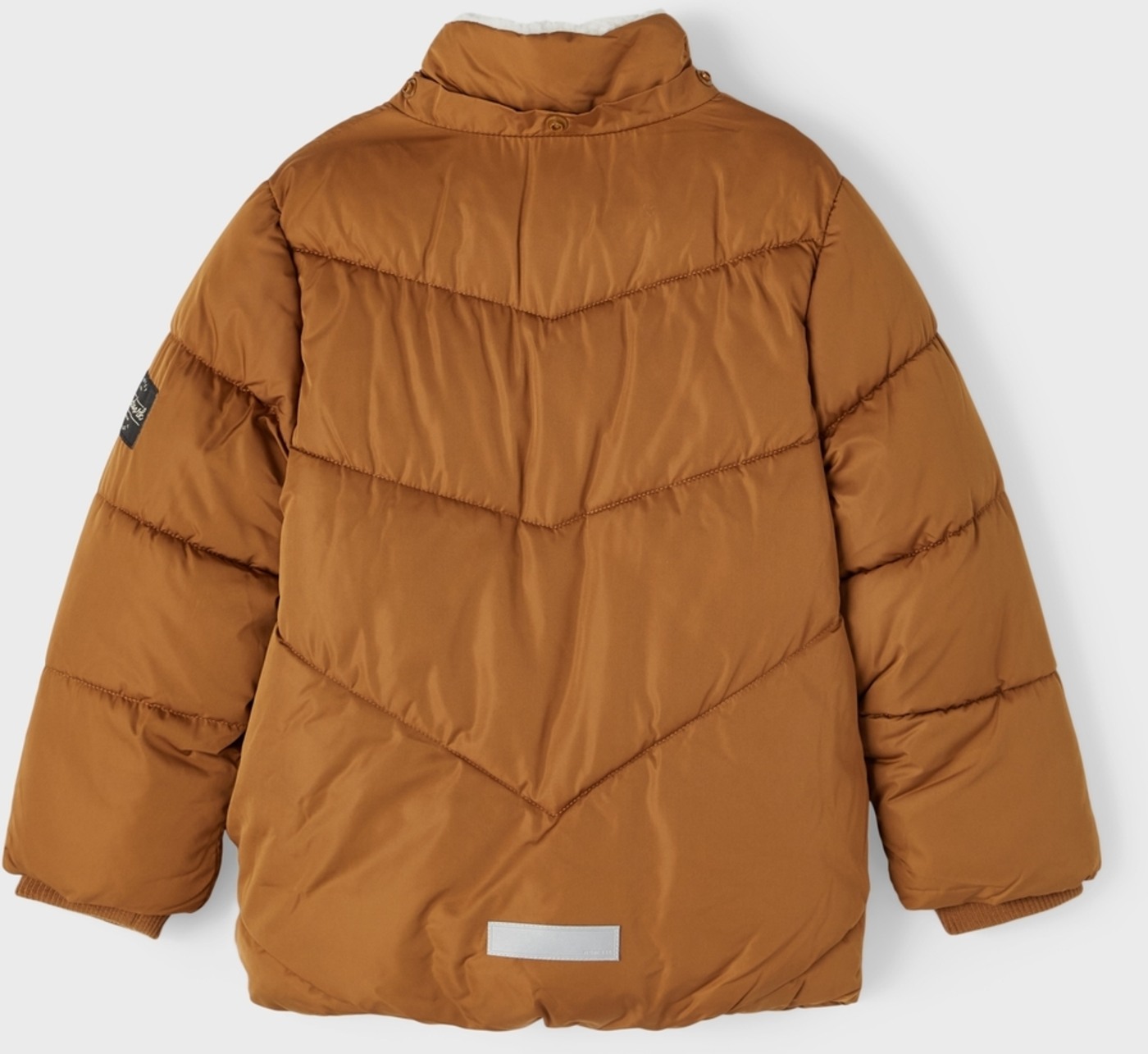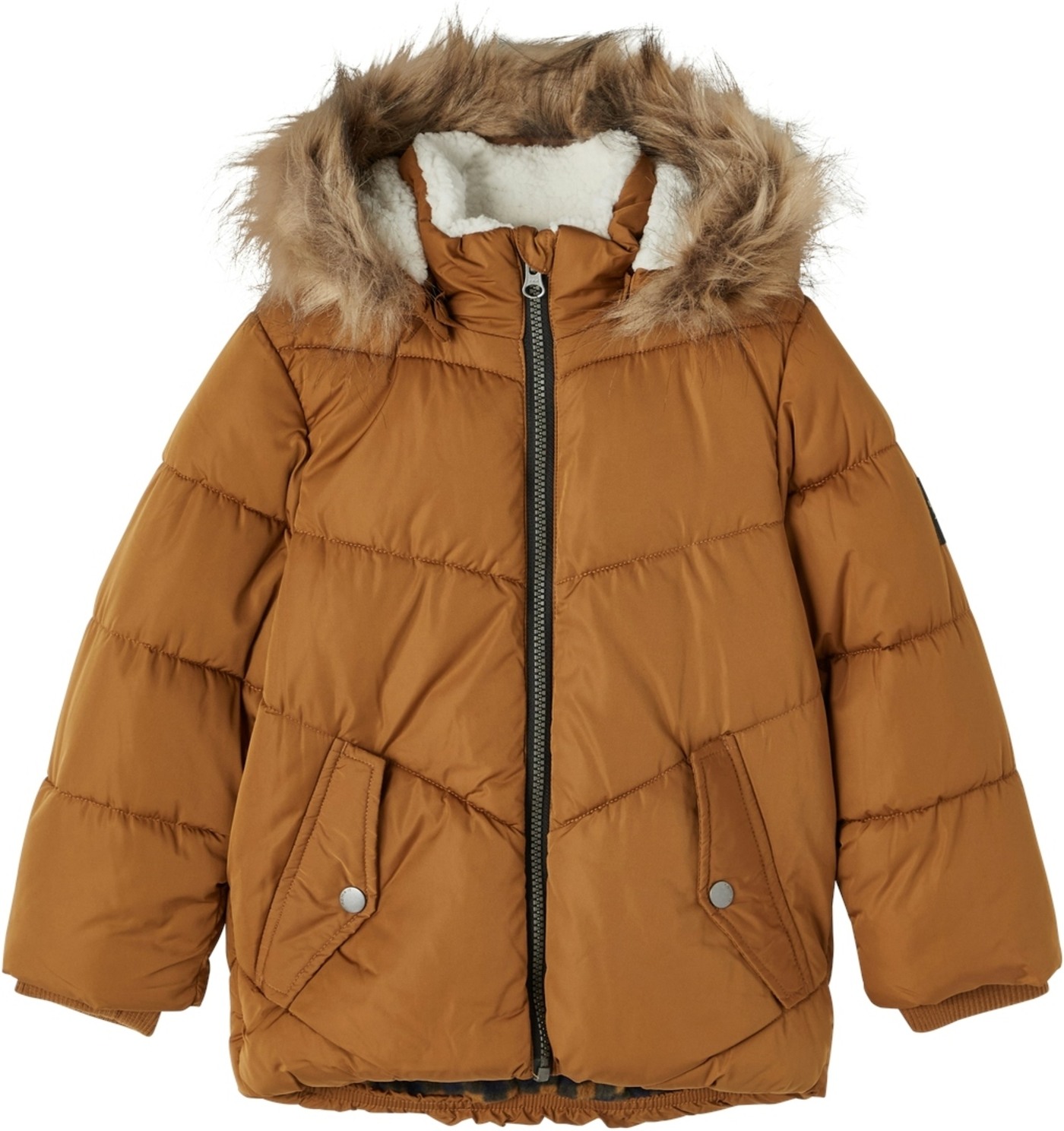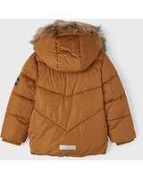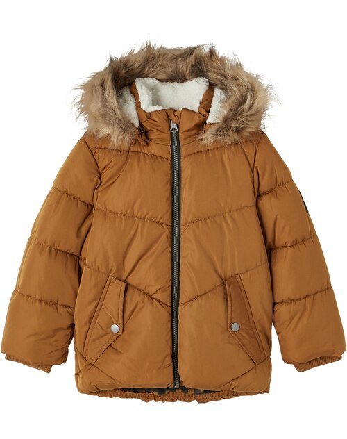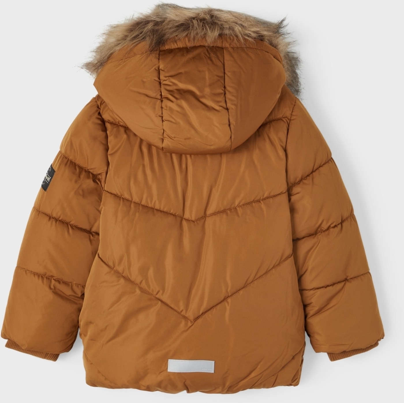 Winter jacket with detachable faux fur hood by NAME IT for boys. There are two pockets on the front. The jacket can be closed with a zipper with an underlaid wind protection so that wind and rain cannot penetrate inside. The back is equipped with a reflective strip. The jacket is lined with soft fleece and the hood is equipped with cuddly teddy plush. The jacket's padding makes it ideal for the cold winter days.