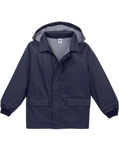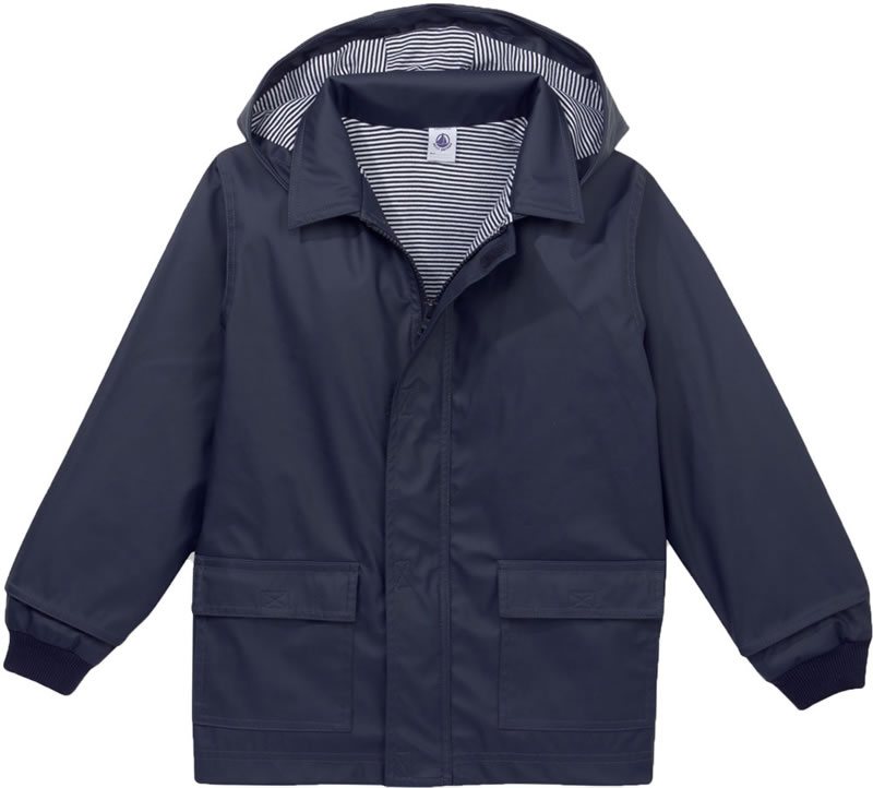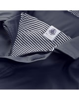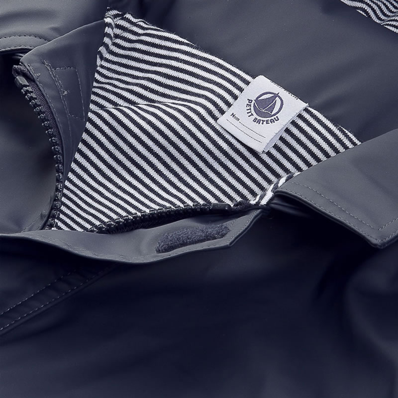 This classic item of PETIT BATEAU does not need an introduction, because it is the main component of every wardrobe for girls and boys. The waxed, supple raincoat with hood, made of radiant, water-repellent fabric, with the comfortably soft and comfortable striped inner lining protects every rainy weather. The hood, the big sewn pocket at the front and the attached ribbed cuffs at the sleeves are fashionable details at the otherwise typical cut. This rain coat can be worn throughout the year.