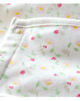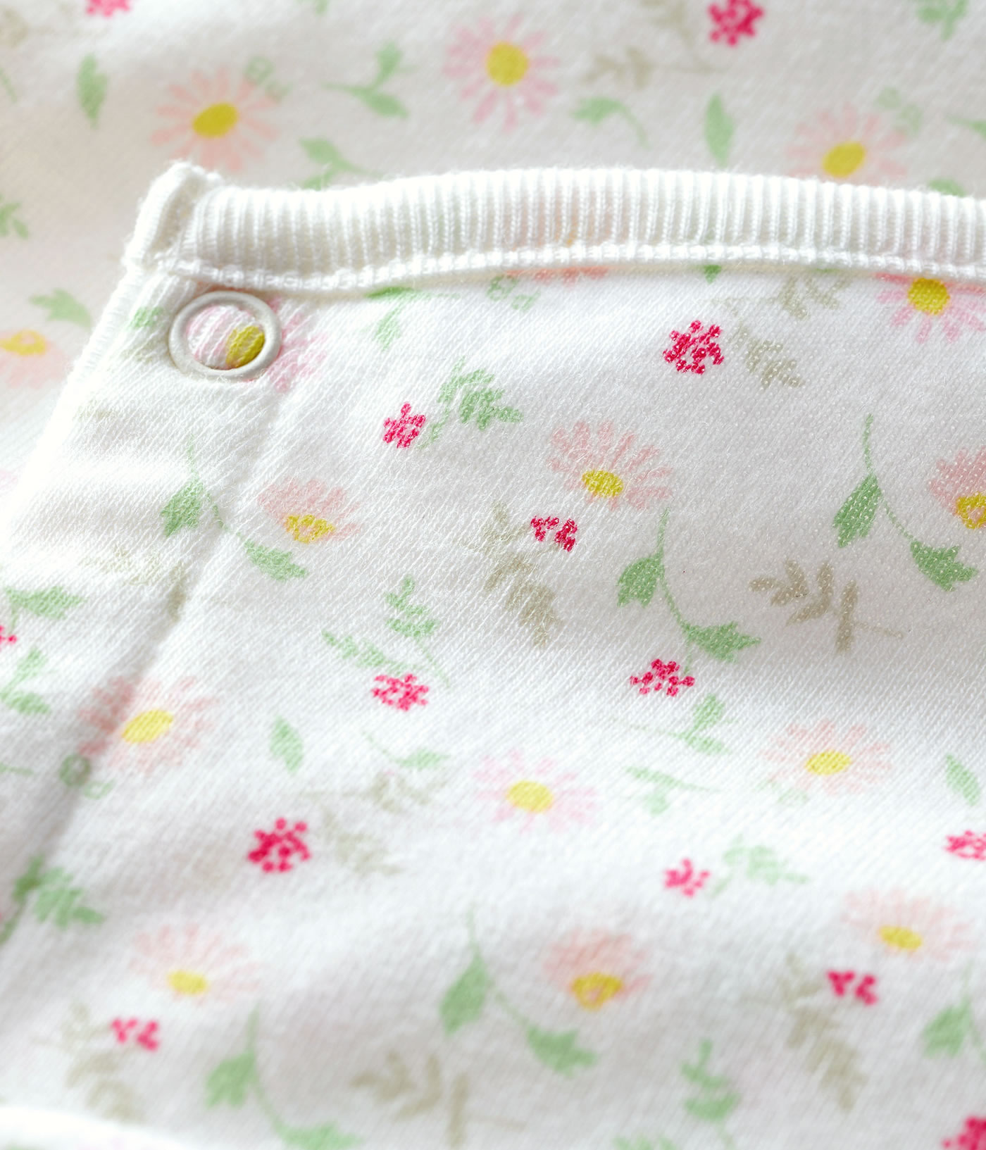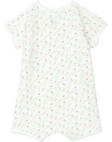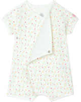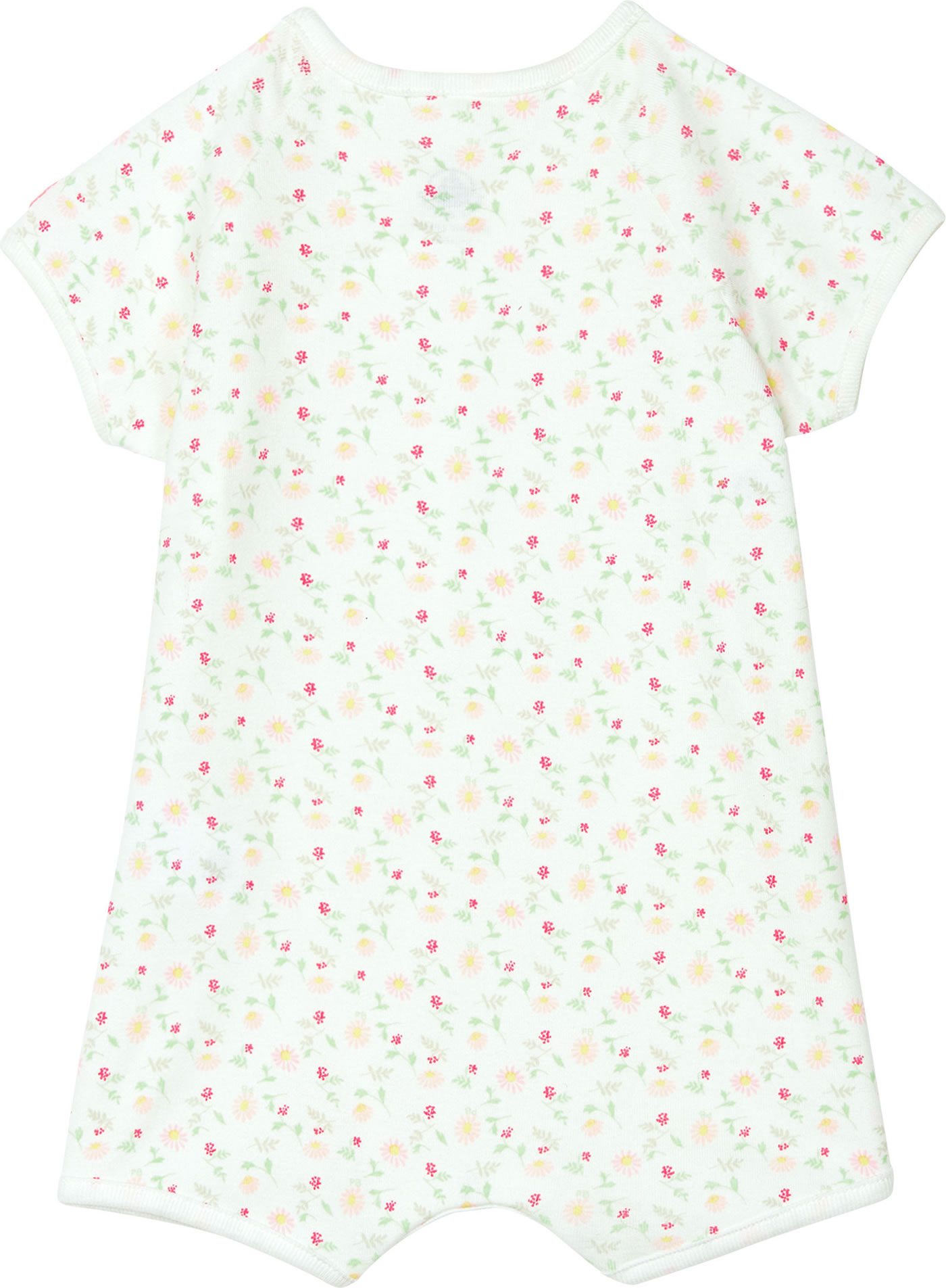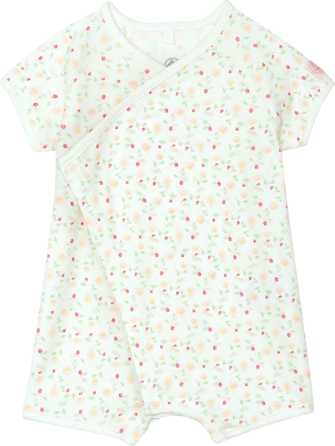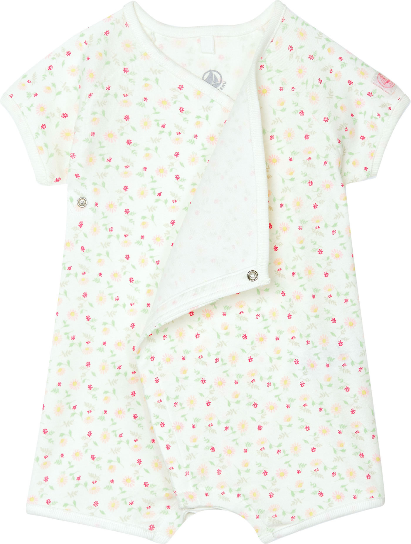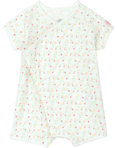 Pretty wrap romper for the summer with a pretty floral pattern by PETIT BATEAU for girls. Push button bar from the armpits to the end of the legs make it easier to put on and take off. Additional push buttons in the crotch help with quick diaper changes.