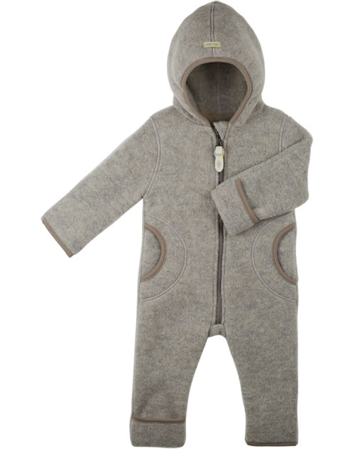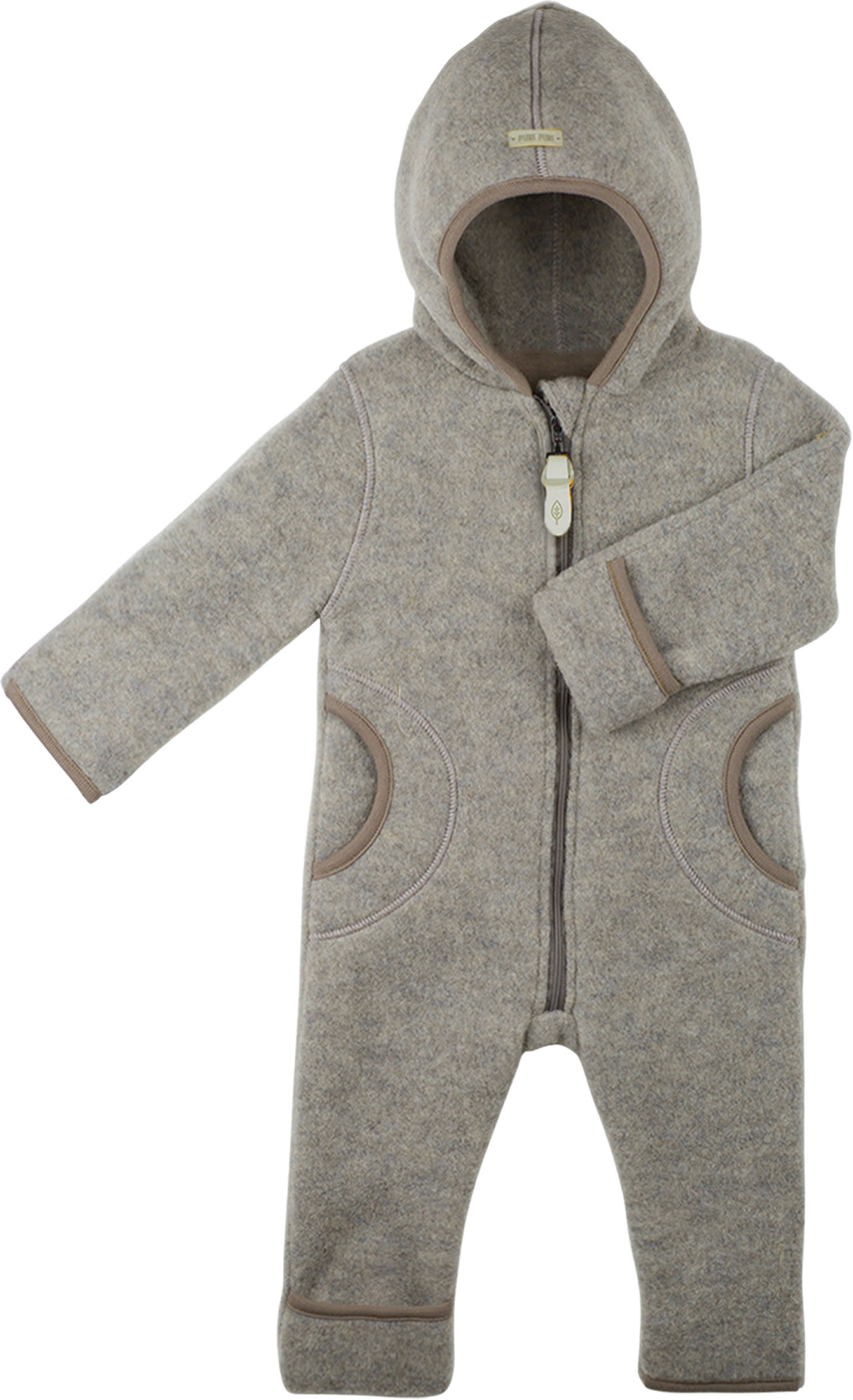Warm and soft hooded jumpsuit from Pure Pure by Bauer. The overall made of wool fleece is particularly suitable for cool days. The zipper is equipped with a chin guard and the attached hood ensures that the chin is nicely wrapped. The contrasting colored piping on the pockets and hems are beautiful details.