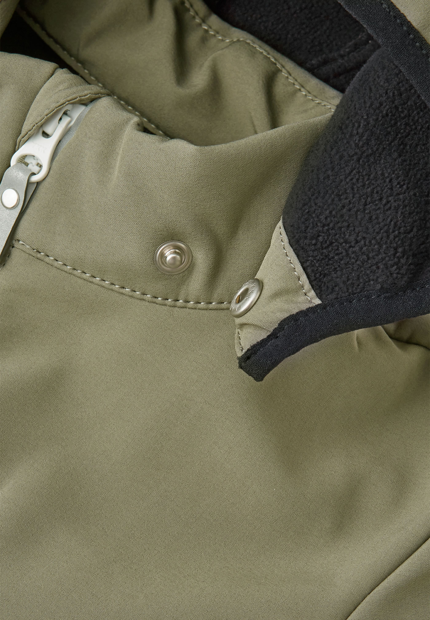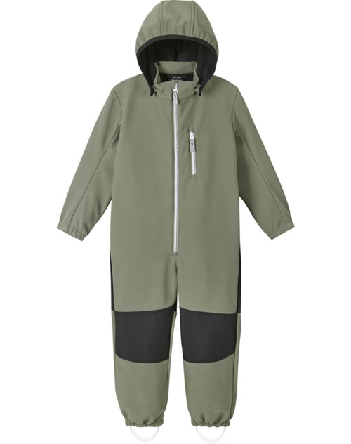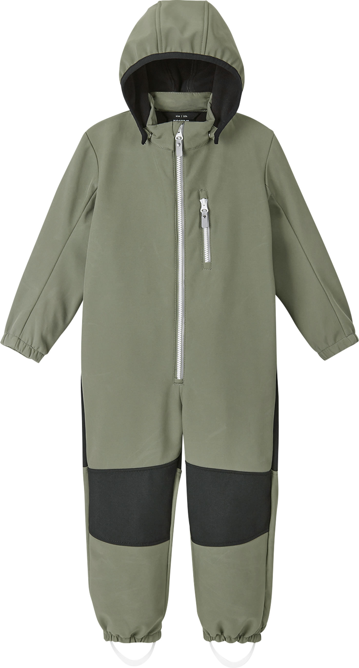 The windproof softshell overall NURMES by REIMA for boys and girls is breathable, water-repellent and lined with soft fleece on the inside. Great details such as the detachable hood and the reflective elements make it a companion for outdoor play. The full zip has a chin guard and makes it easy to put on and take off. Zippered pockets provide space for small treasures. The overall is made of durable material and reinforcements on the knees and bottom make it very robust.