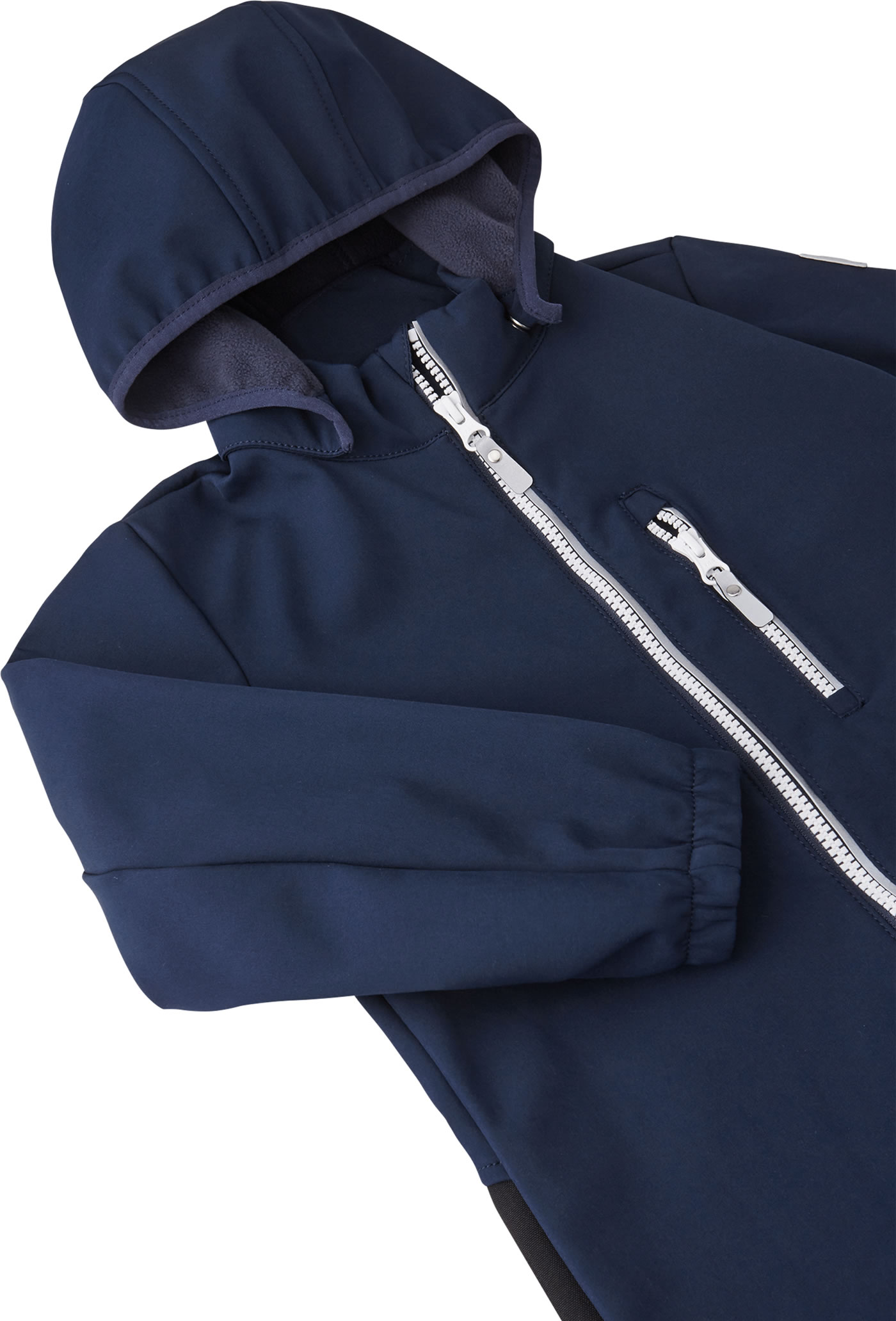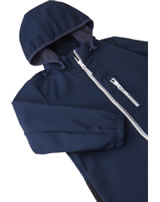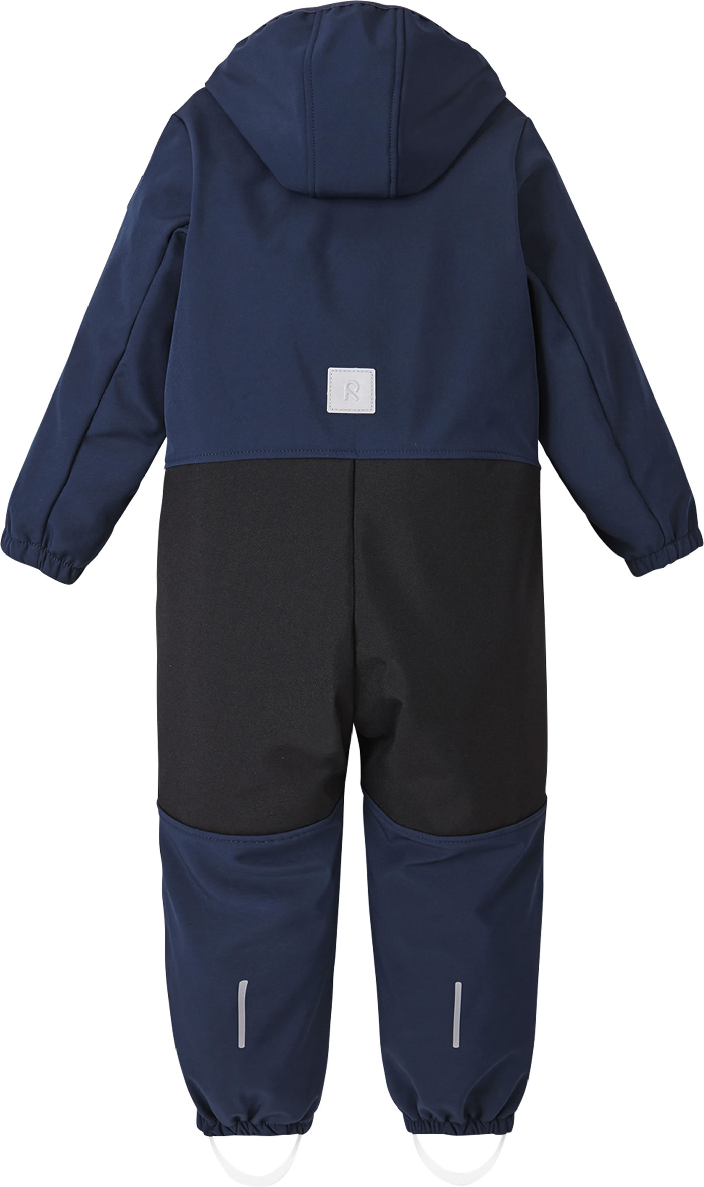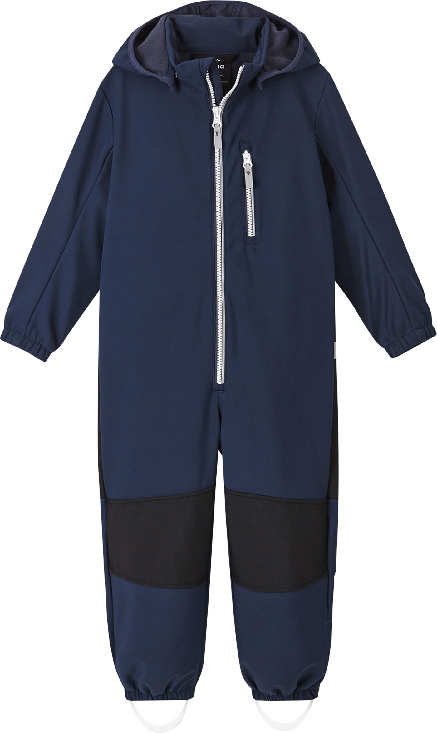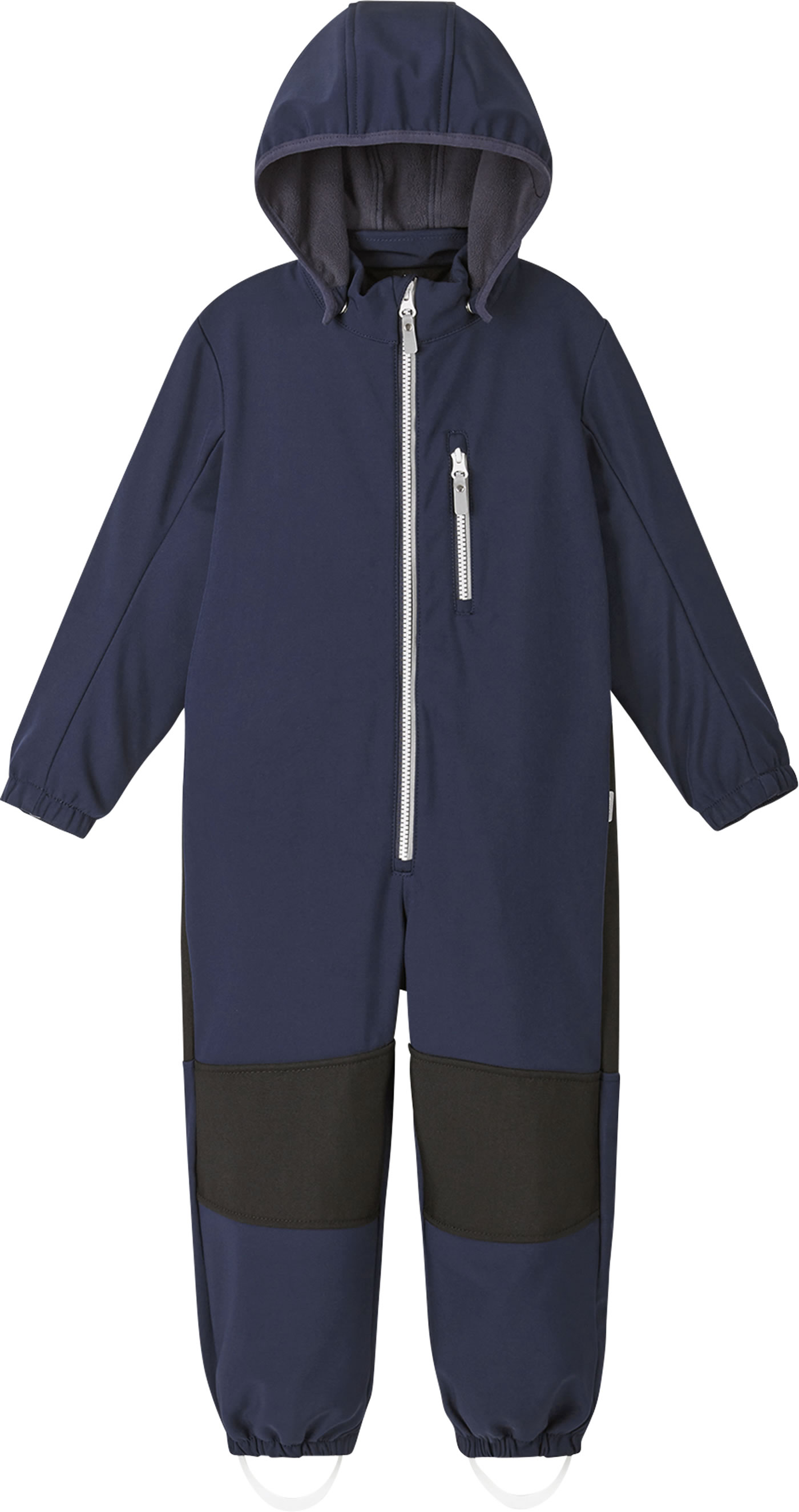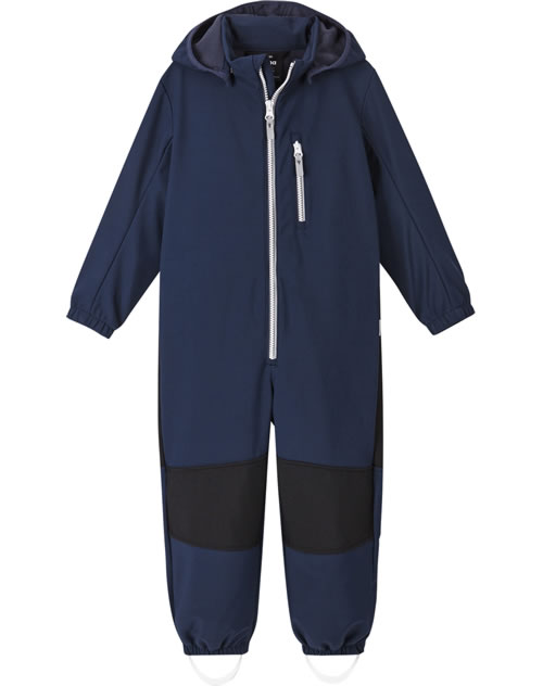 The windproof softshell overall NURMES by REIMA for boys and girls is breathable, water-repellent and lined with soft fleece on the inside. Great details such as the detachable hood and the reflective elements make it a companion for outdoor play. The full zip has a chin guard and makes it easy to put on and take off. Zippered pockets provide space for small treasures. The overall is made of durable material and reinforcements on the knees and bottom make it very robust.