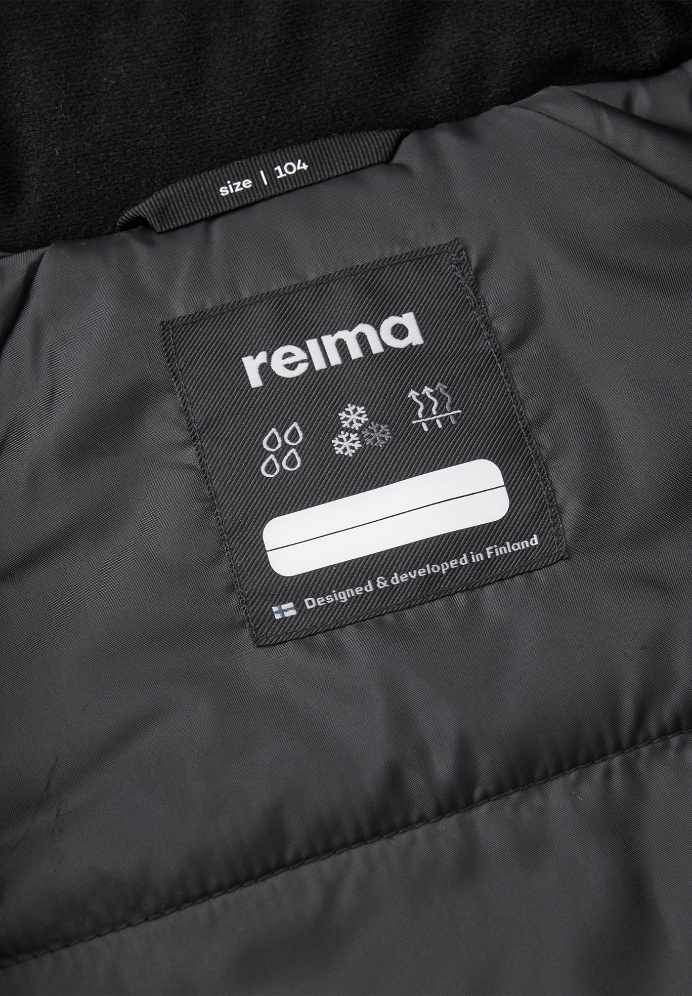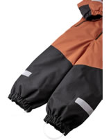 Waterproof and robust Reimatec® winter overall KAUHAVA made from partially recycled material by REIMA with sealed seams. The waterproof and breathable snow overall keeps your child warm and dry without sweating. The elastic at the waist ensures a good fit. It also has elastic cuffs at the ankles. The detachable hood, fastened with snaps, protects against cold wind and is quick to release if it gets caught anywhere. The removable silicone foot straps prevent it from sliding up. Reflective elements ensure better visibility in the dark.