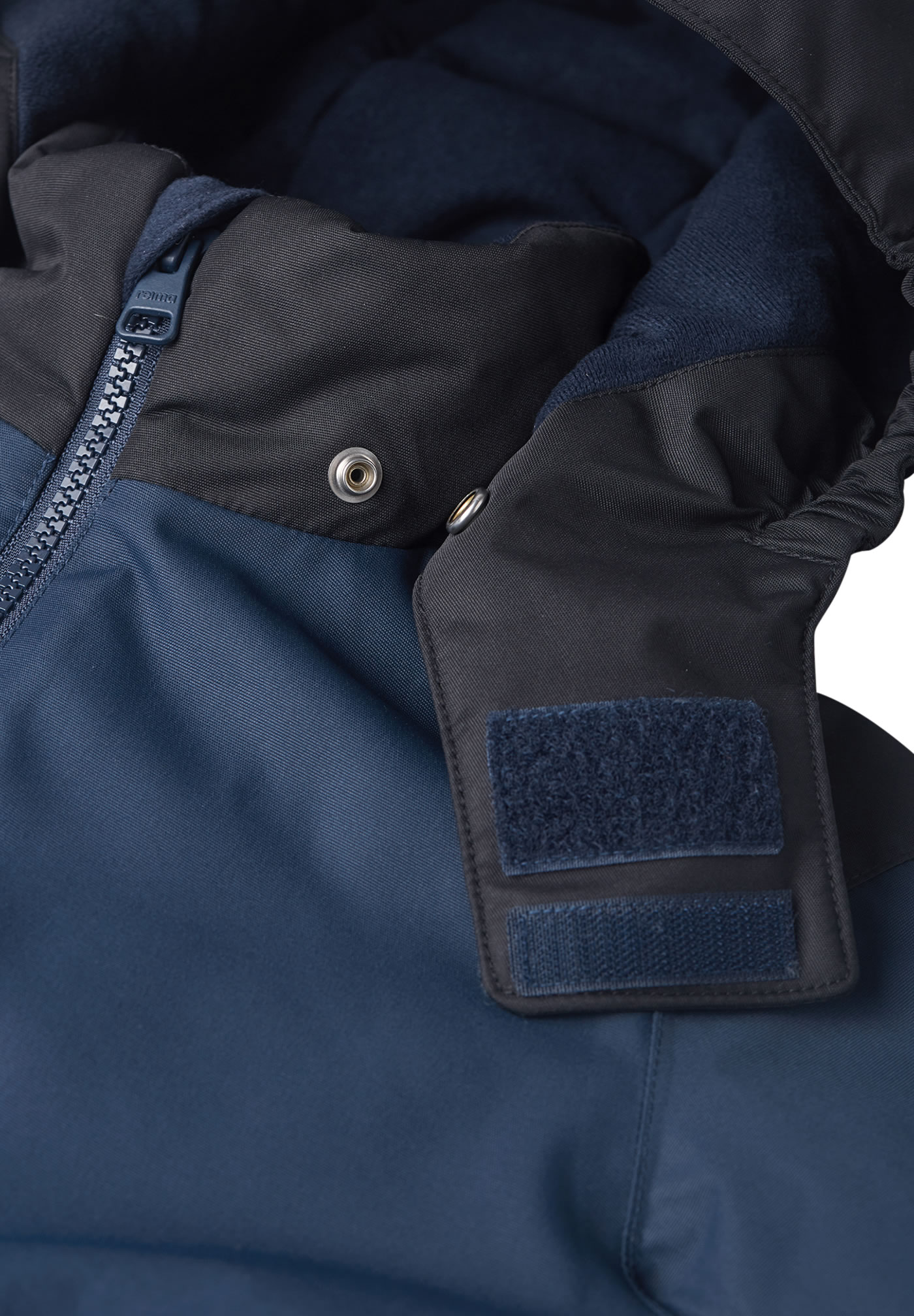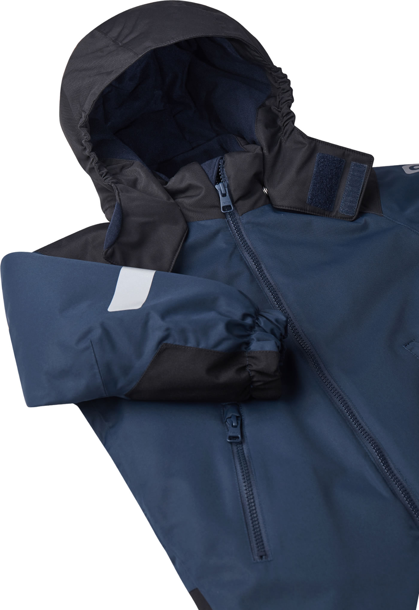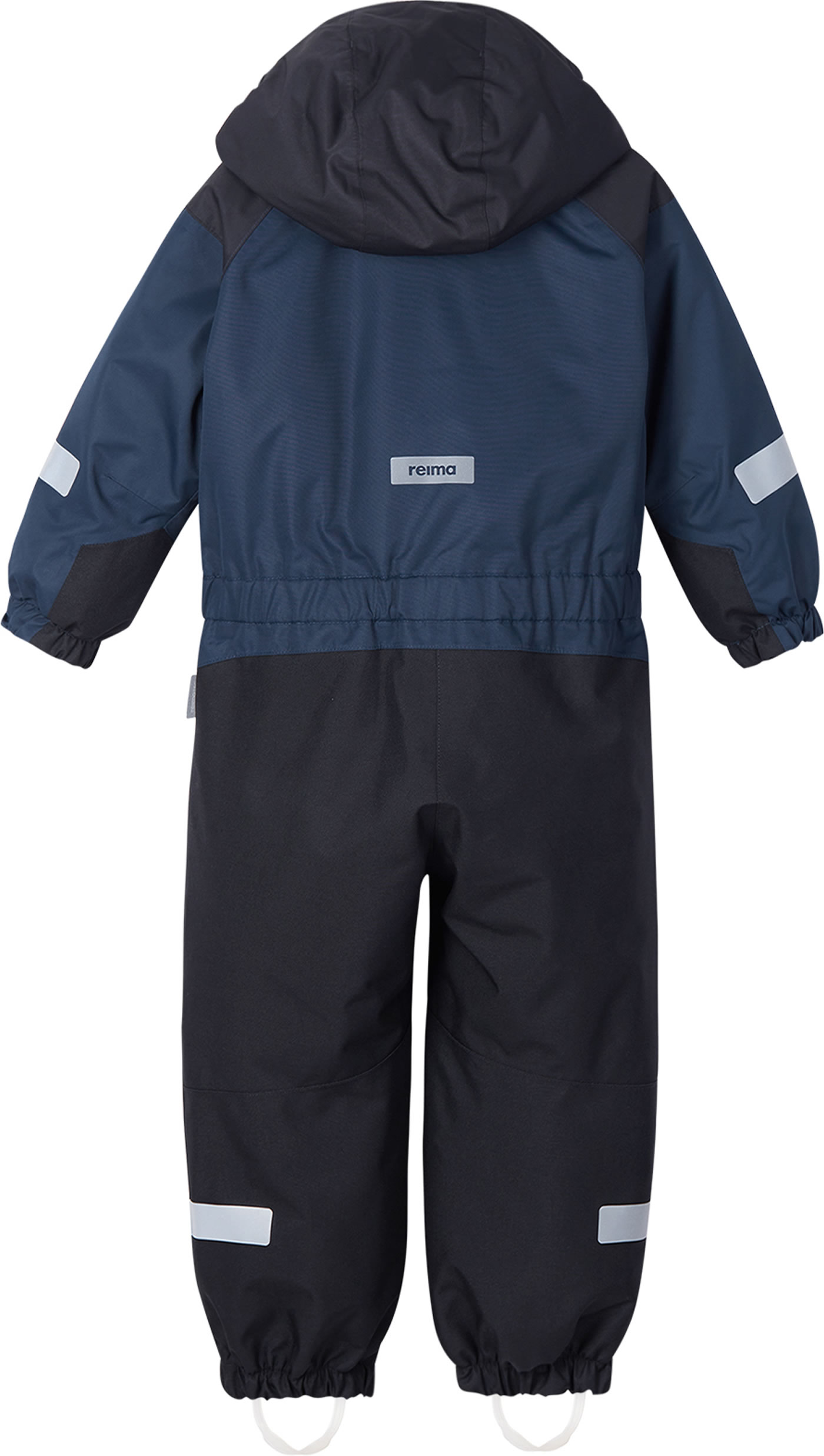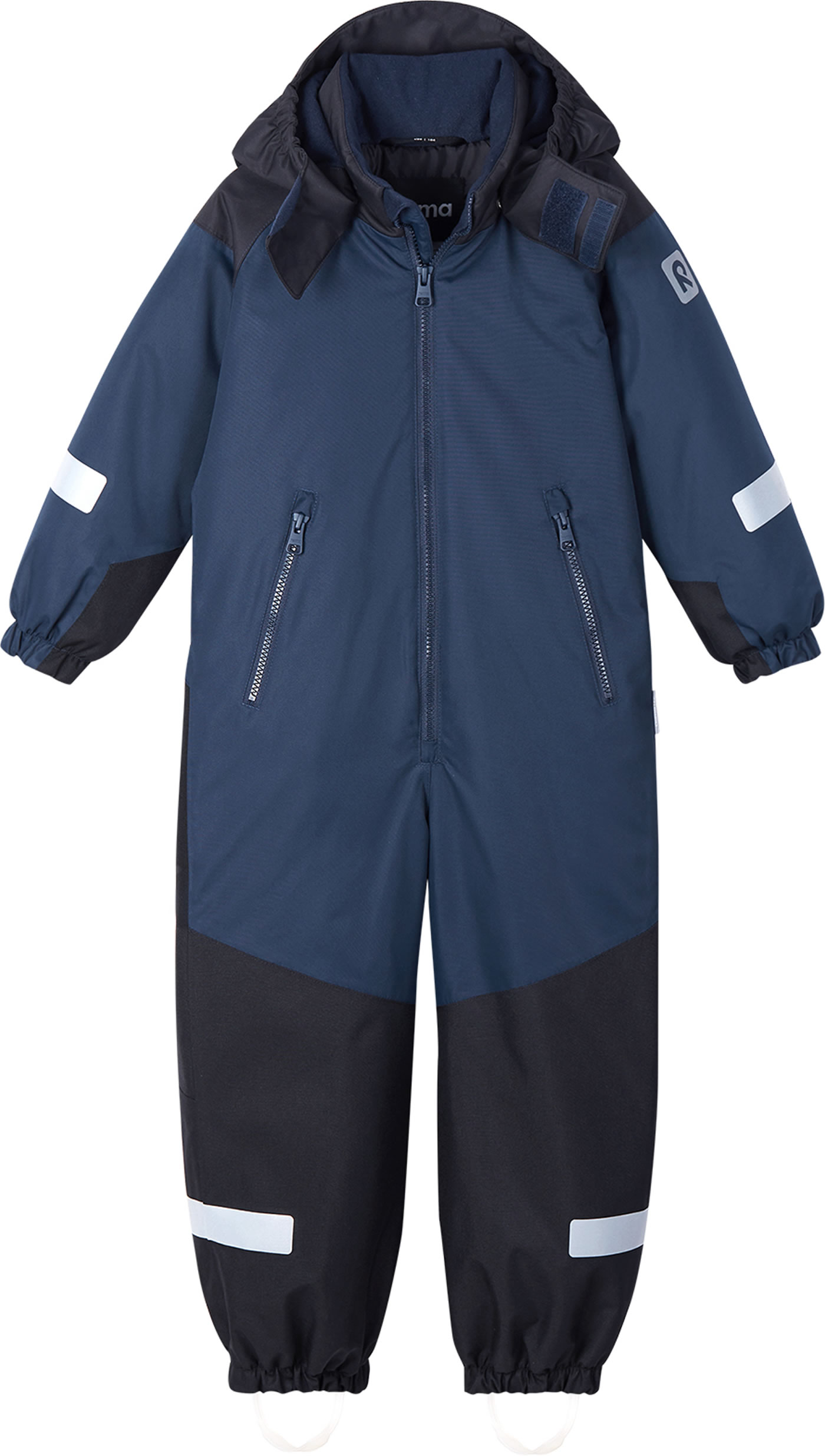 Waterproof and robust Reimatec® winter overall KAUHAVA made from partially recycled material by REIMA with sealed seams. The waterproof and breathable snow overall keeps your child warm and dry without sweating. The elastic at the waist ensures a good fit. It also has elastic cuffs at the ankles. The detachable hood, fastened with snaps, protects against cold wind and is quick to release if it gets caught anywhere. The removable silicone foot straps prevent it from sliding up. Reflective elements ensure better visibility in the dark.