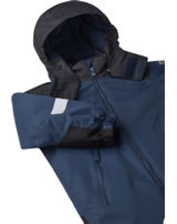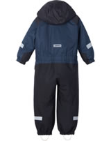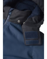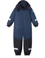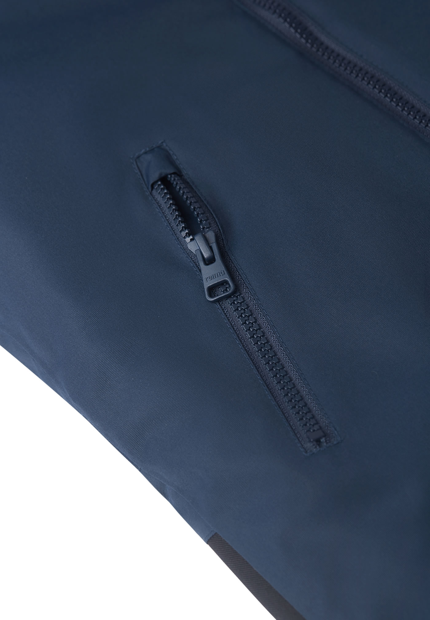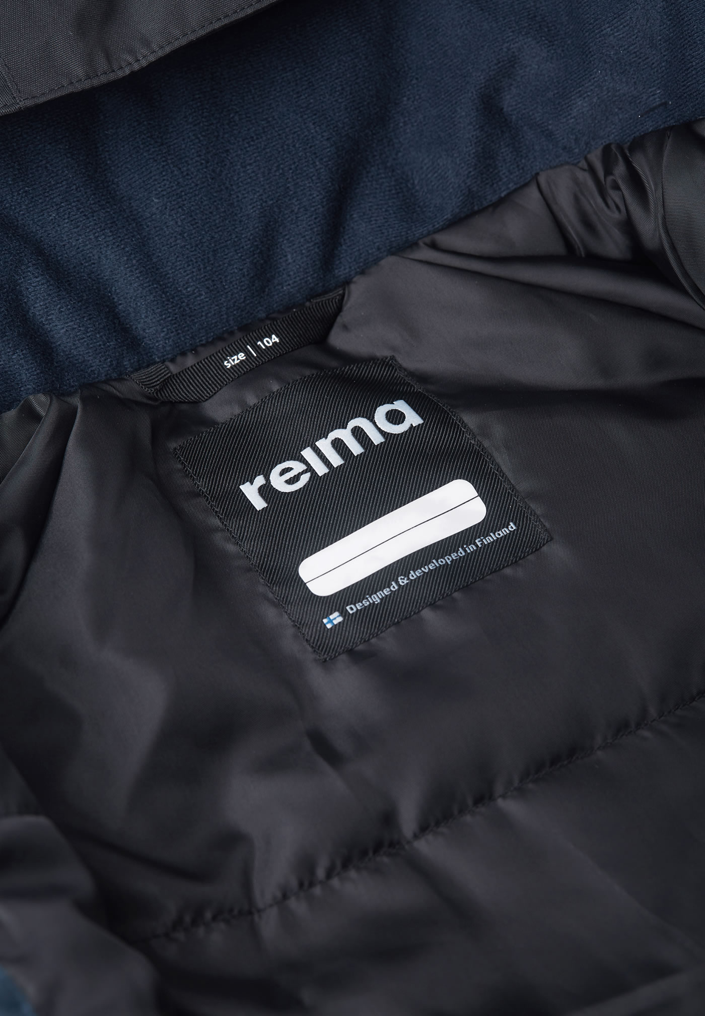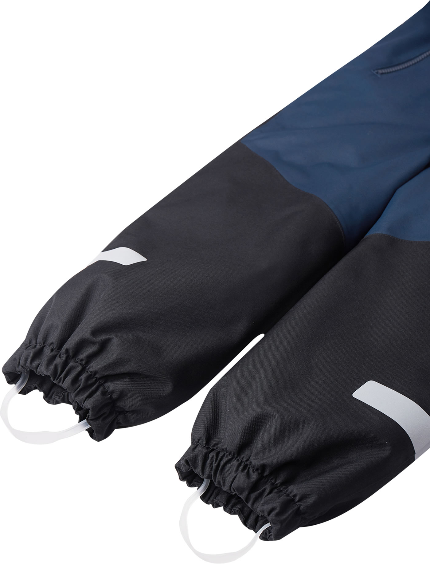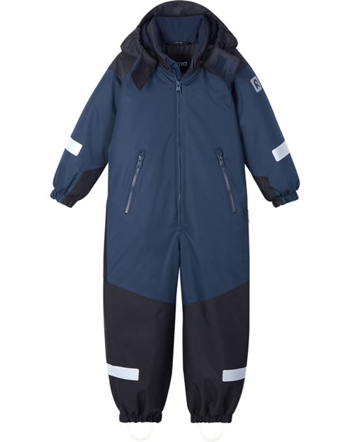 Waterproof and robust Reimatec® winter overall KAUHAVA made from partially recycled material by REIMA with sealed seams. The waterproof and breathable snow overall keeps your child warm and dry without sweating. The elastic at the waist ensures a good fit. It also has elastic cuffs at the ankles. The detachable hood, fastened with snaps, protects against cold wind and is quick to release if it gets caught anywhere. The removable silicone foot straps prevent it from sliding up. Reflective elements ensure better visibility in the dark.