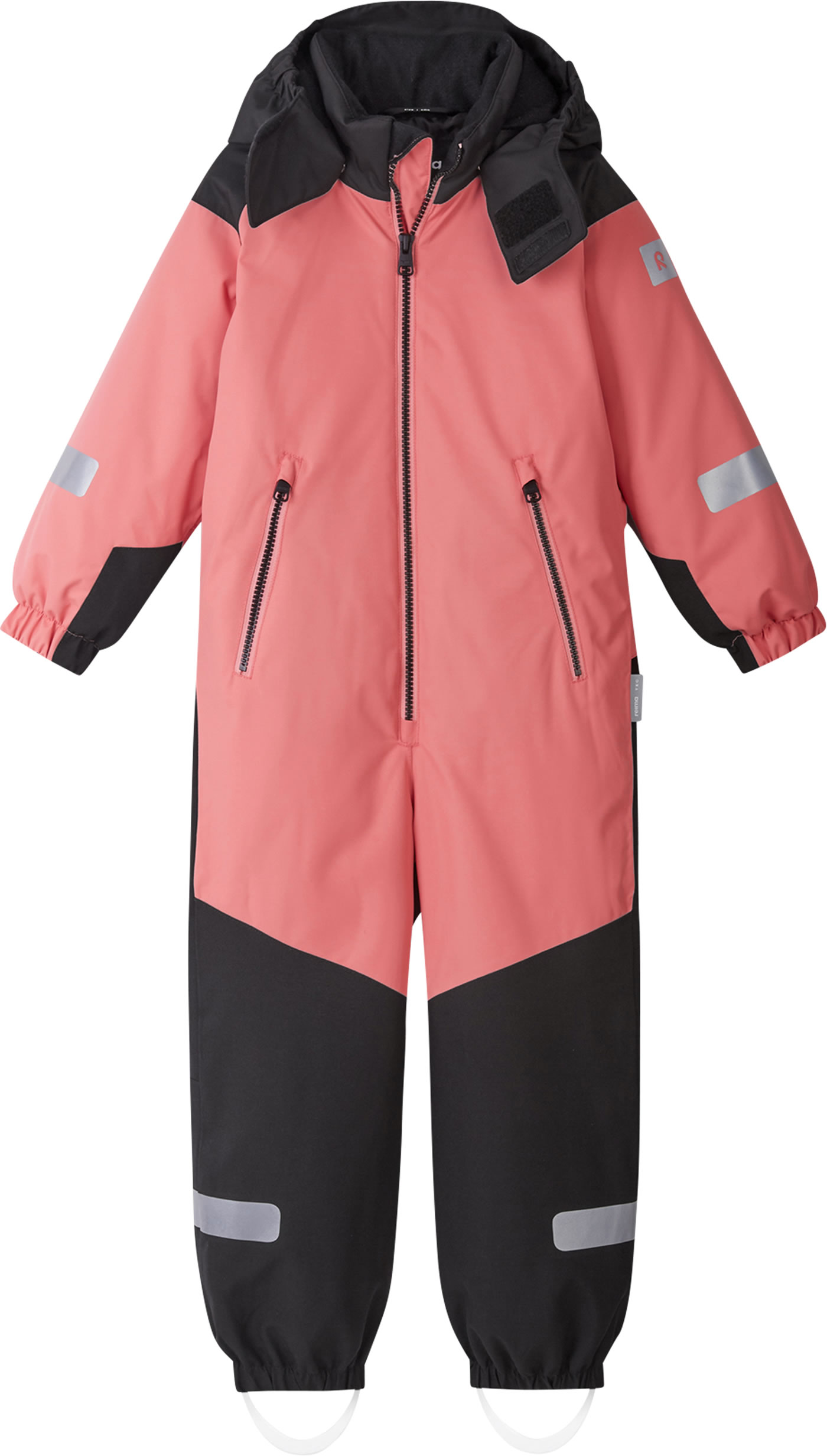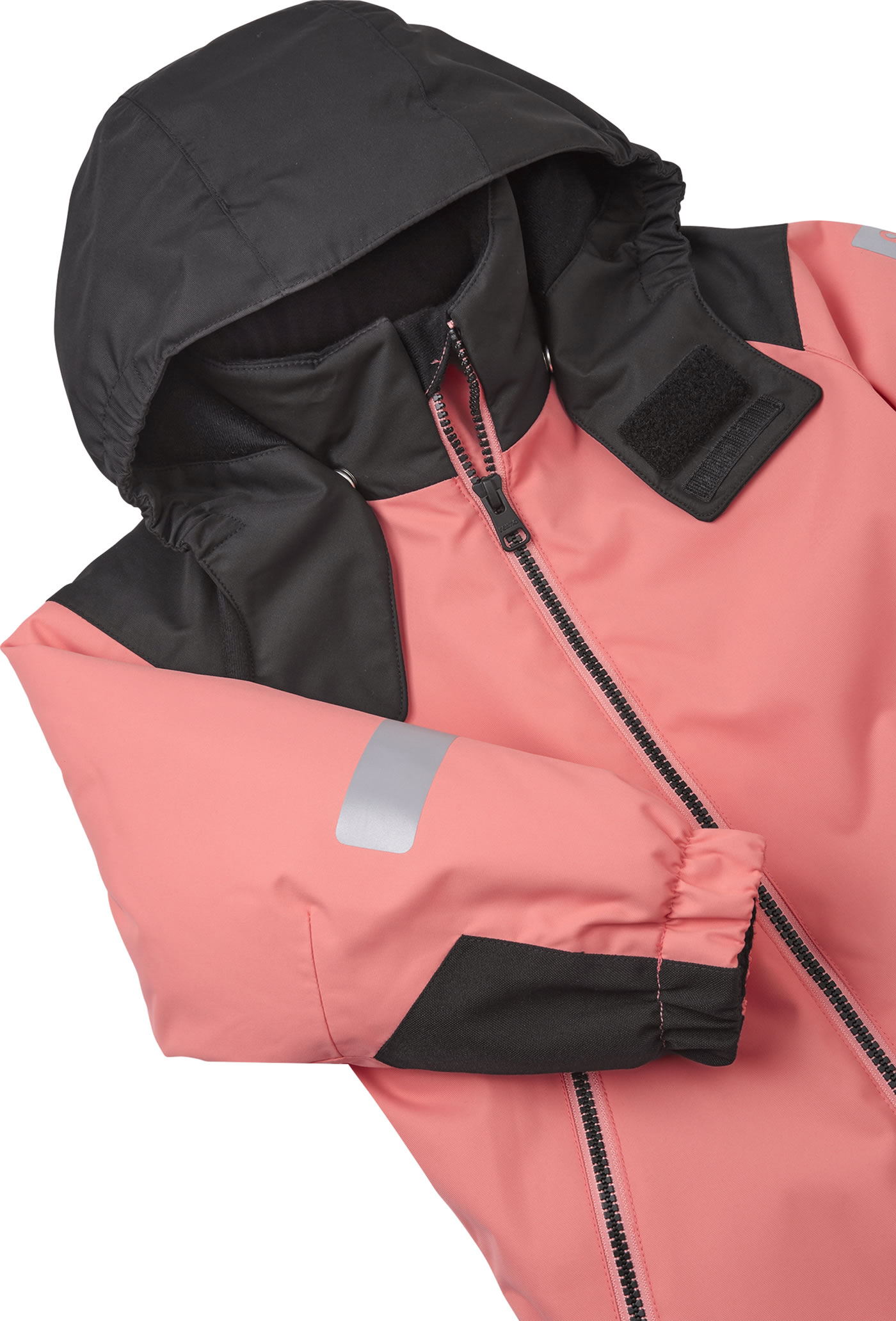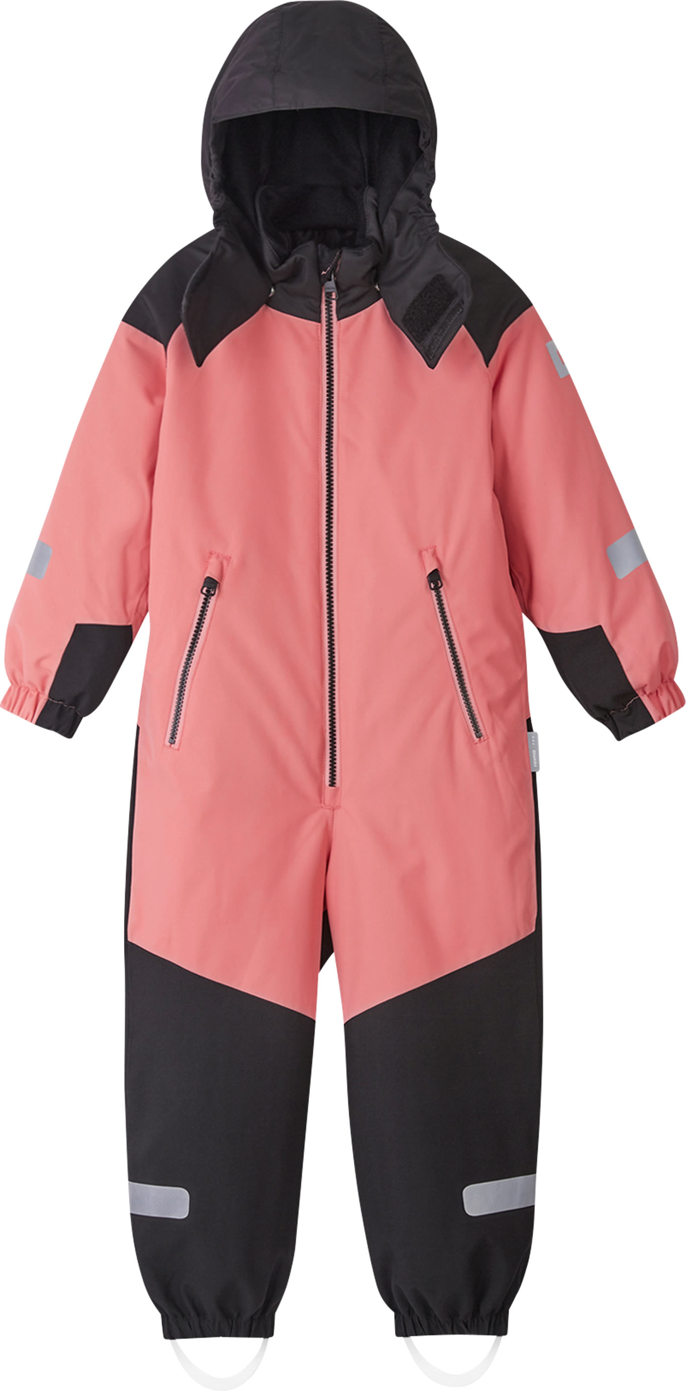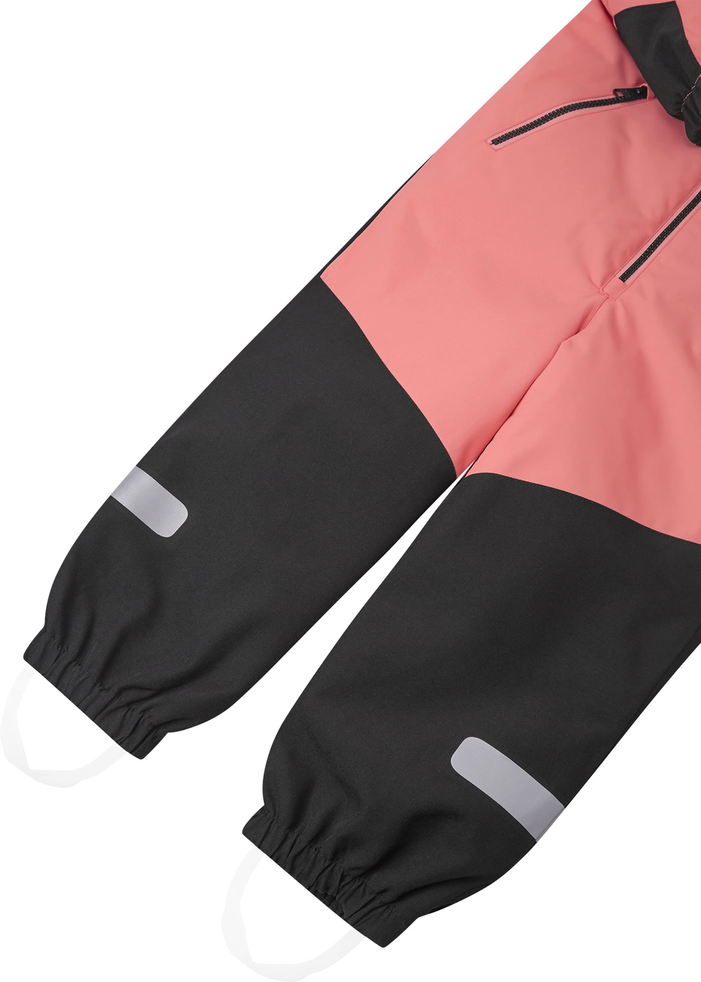 Waterproof and robust Reimatec® winter overall KAUHAVA made from partially recycled material by REIMA with sealed seams. The waterproof and breathable snow overall keeps your child warm and dry without sweating. The elastic at the waist ensures a good fit. It also has elastic cuffs at the ankles. The detachable hood, fastened with snaps, protects against cold wind and is quick to release if it gets caught anywhere. The removable silicone foot straps prevent it from sliding up. Reflective elements ensure better visibility in the dark.