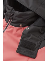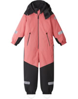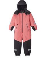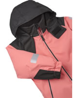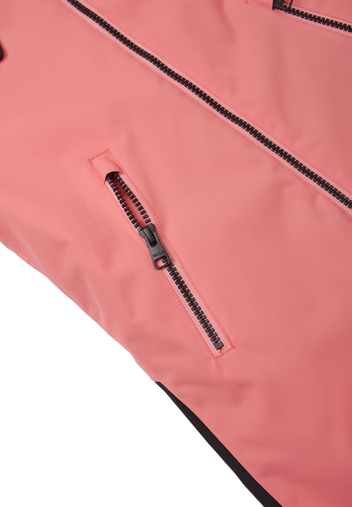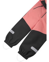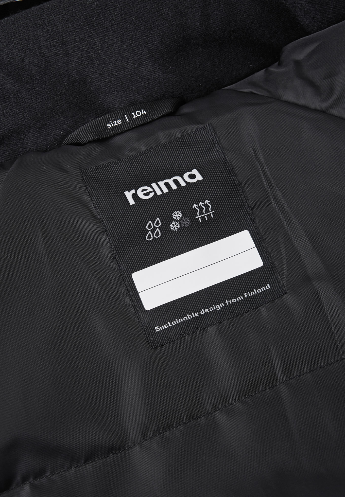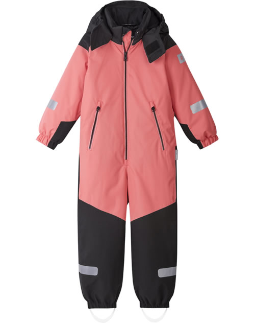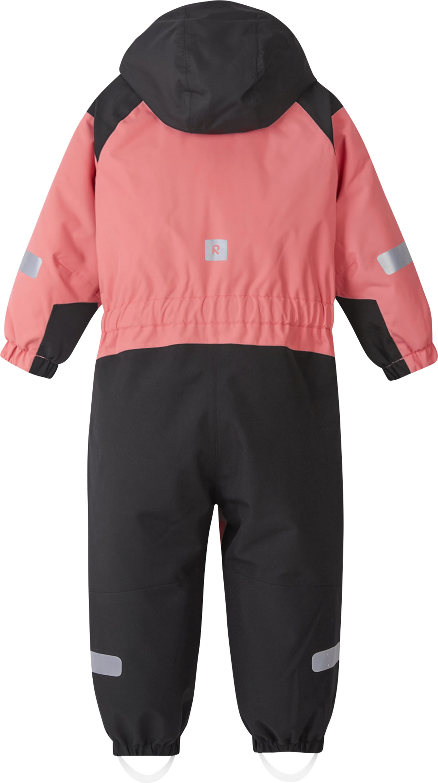 Waterproof and robust Reimatec® winter overall KAUHAVA made from partially recycled material by REIMA with sealed seams. The waterproof and breathable snow overall keeps your child warm and dry without sweating. The elastic at the waist ensures a good fit. It also has elastic cuffs at the ankles. The detachable hood, fastened with snaps, protects against cold wind and is quick to release if it gets caught anywhere. The removable silicone foot straps prevent it from sliding up. Reflective elements ensure better visibility in the dark.