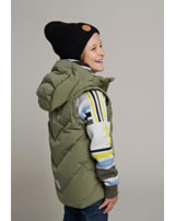 Fantastic 2-in-1 jacket for children with exciting properties: It is made from a heat-retaining fabric based on ground coffee. For the production of coffee, ground coffee is carbonized at very high temperatures and broken down into microscopic particles, which are characterized by a honeycomb structure. When these are made into polyester, tiny holes are created in the fibers that store heat. In combination with the down insulation, this new material based on coffee beans provides cozy warmth. The hood can be removed and the sleeves can also be zipped off to convert the jacket into a vest. A real all-rounder! Straight cut.