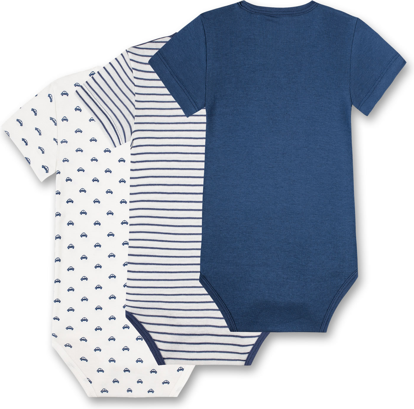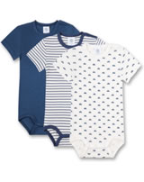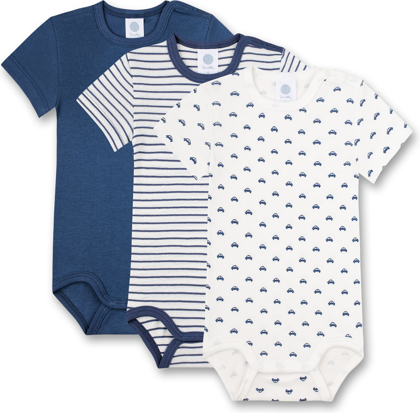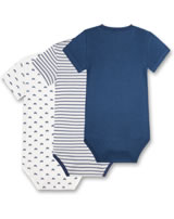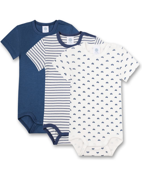 Great set consisting of 3 short-sleeved bodies by SANETTA for boys in white and blue. One body comes in dark blue, the other body in white has a beautiful all-over car print in blue. The third body has a pretty striped pattern. Thanks to the nickel-free press studs on the shoulder and in the crotch, changing and changing is child's play. The bodies are made of 100% organic cotton.