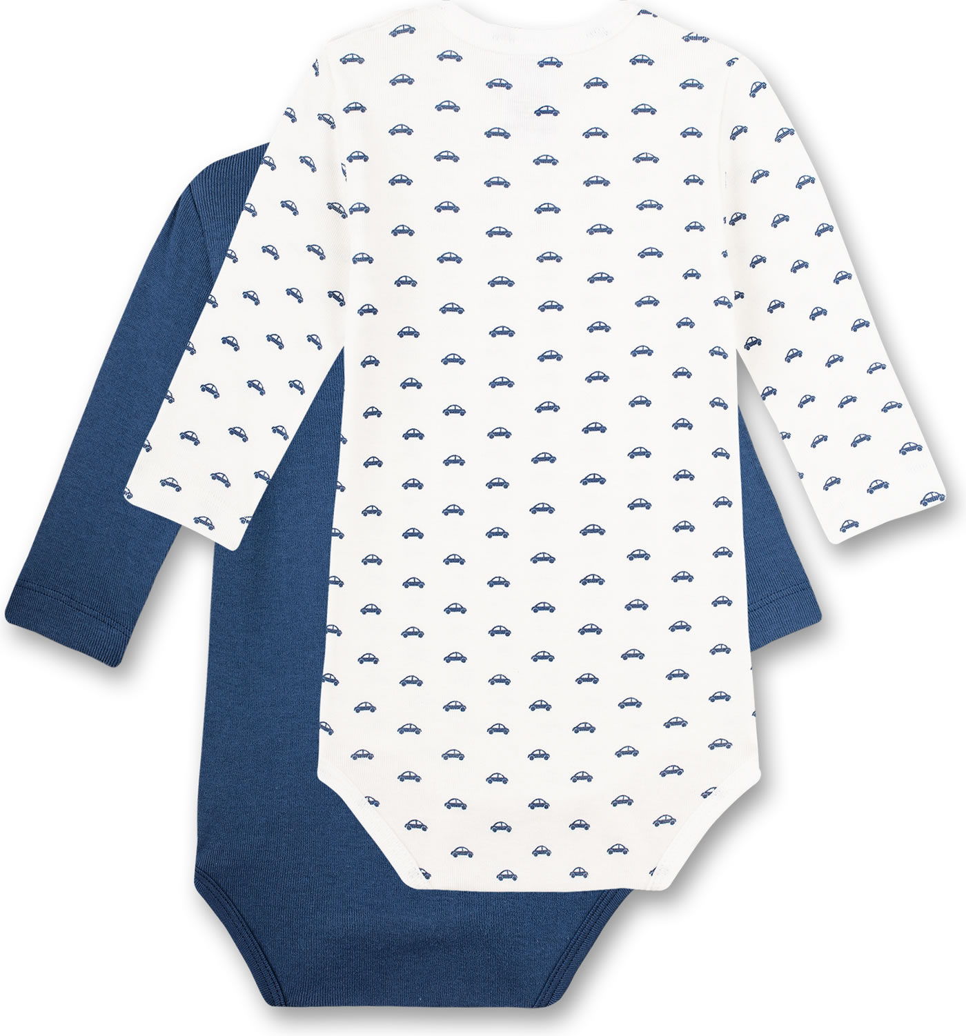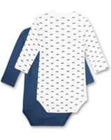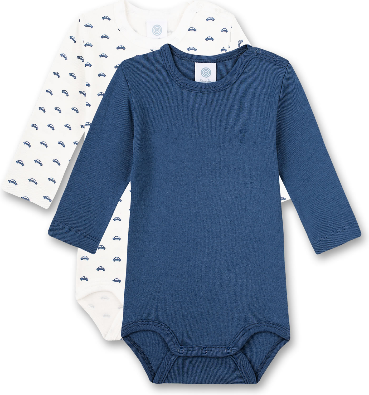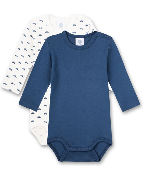 Great set consisting of 2 long-sleeved bodies by SANETTA for boys in white and blue. One body comes in dark blue, the other body in white has a beautiful all-over car print in blue. Thanks to the nickel-free press studs on the shoulder and in the crotch, changing and changing is child's play. The bodies are made of 100% organic cotton.