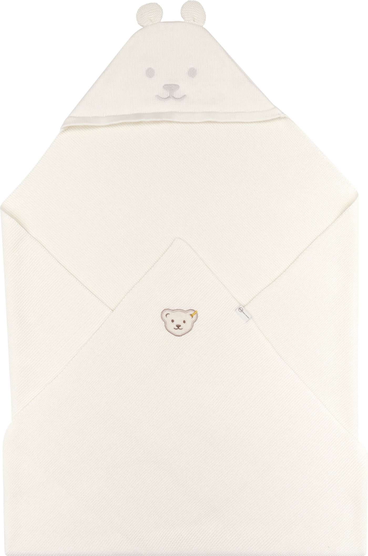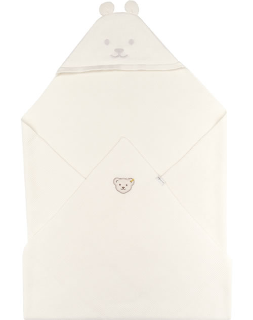 One corner has a hood with a face and ears, so the baby can be snuggled up even better. A small Steiff bear's head adorns the back.