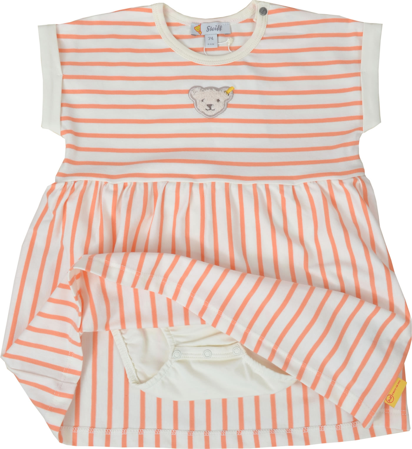 Great bodysuit with short sleeves and a skirt for girls from the Blossom collection by STEIFF. Make one out of two: the pretty jersey body dress comes with underwear. The little STEIFF bear is on the chest. There are press studs in the diaper area and on the left shoulder.