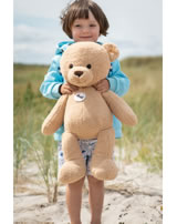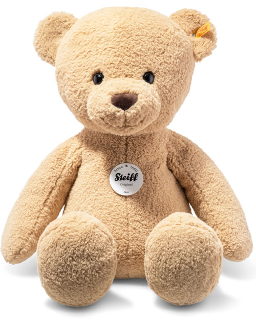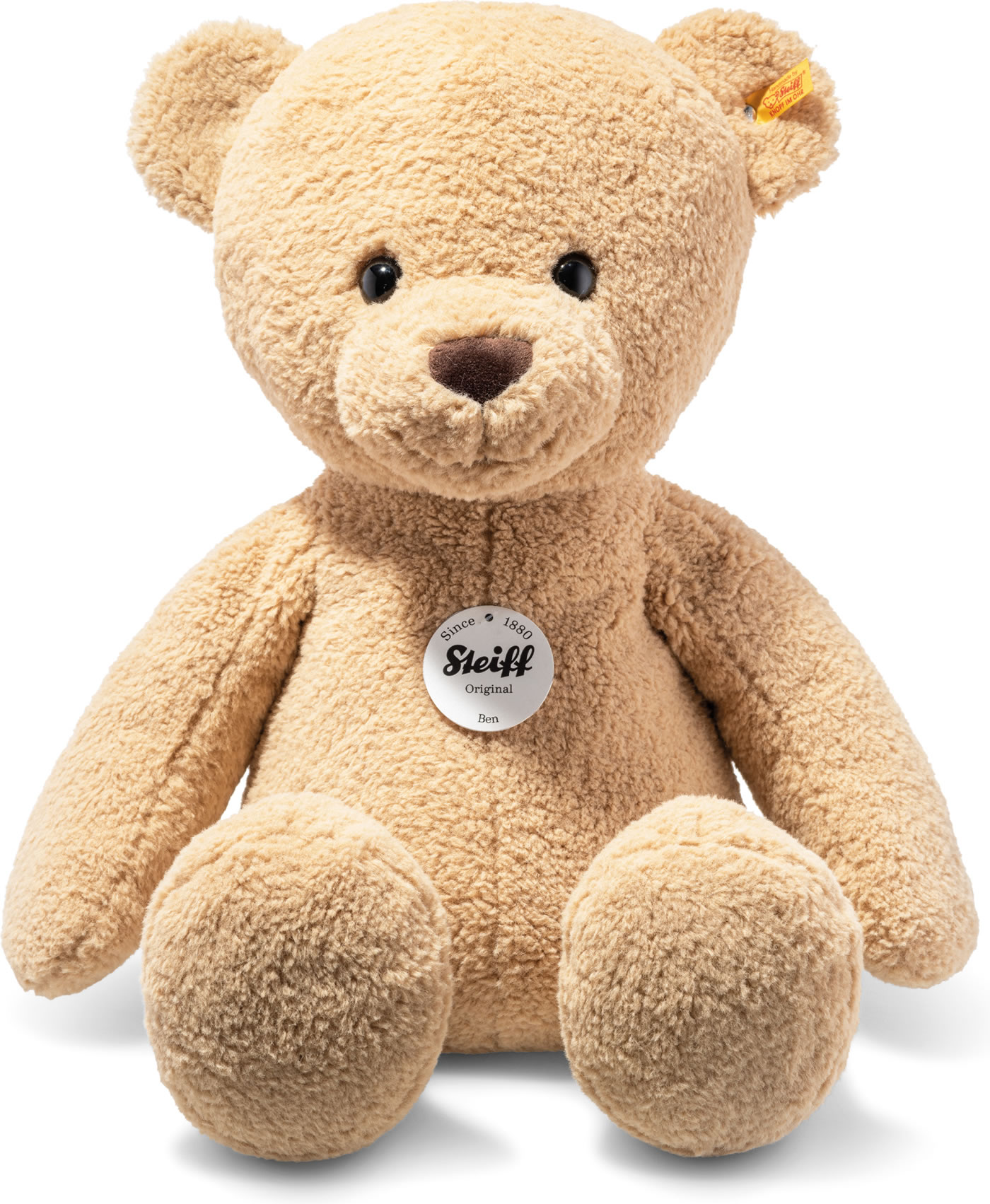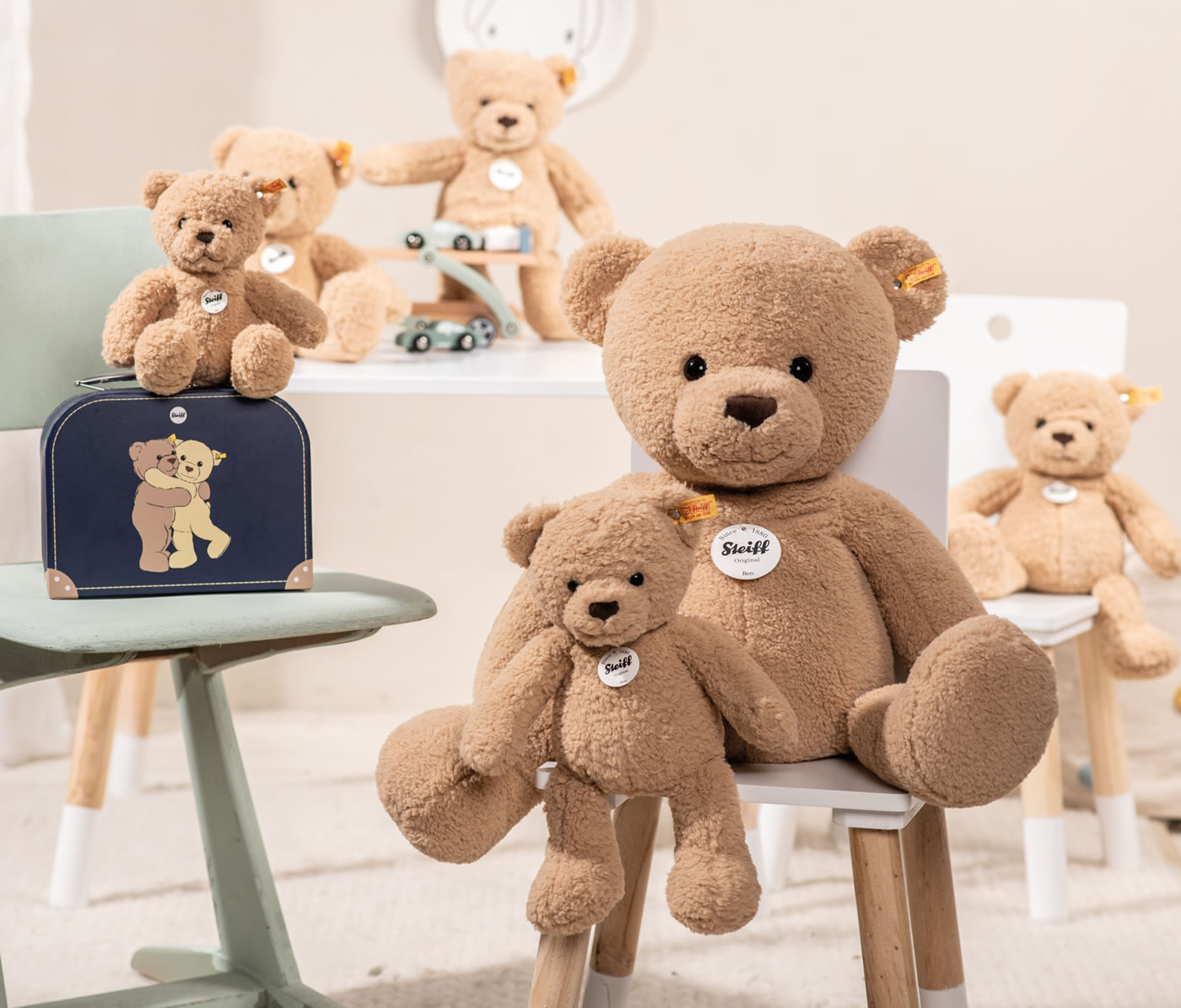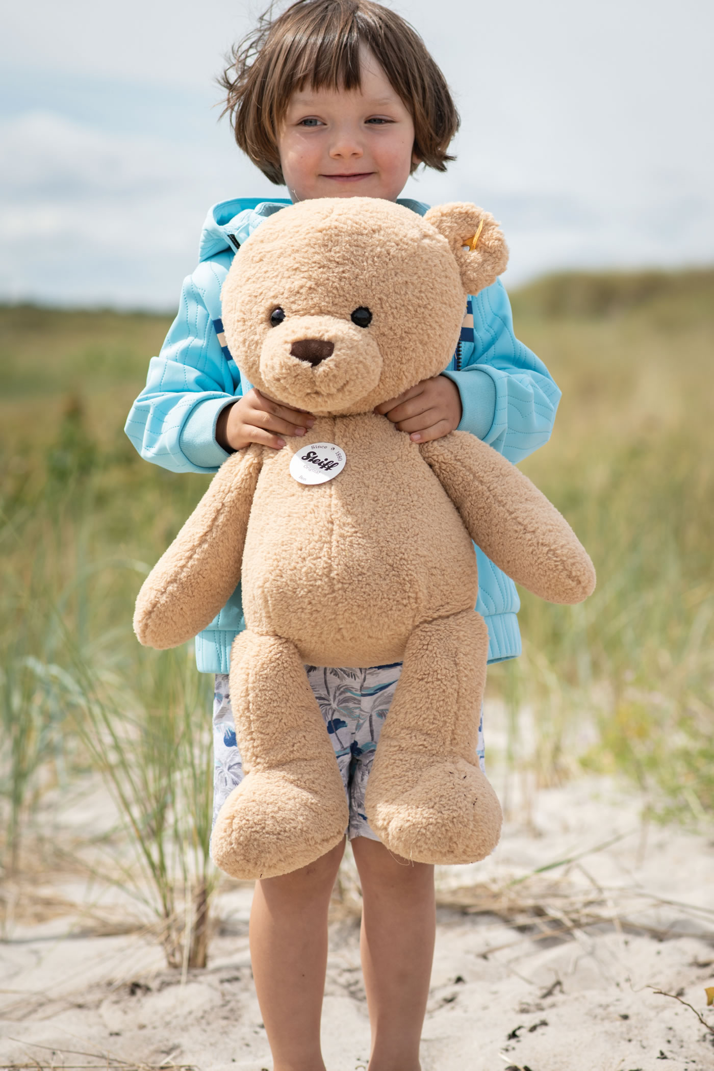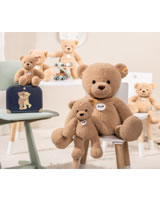 Teddy bear Ben is 54 cm tall, beige and made of cuddly soft teddy fleece. He will keep his favorite people company on every adventure. As part of the “120. Teddy bear anniversary” he shows all the features that characterize his family – a stainless steel “button in ear”, center seams, contrasting paws, characteristic bear eyes and an embroidered nose. Ben likes to play with his family and is always on the move.