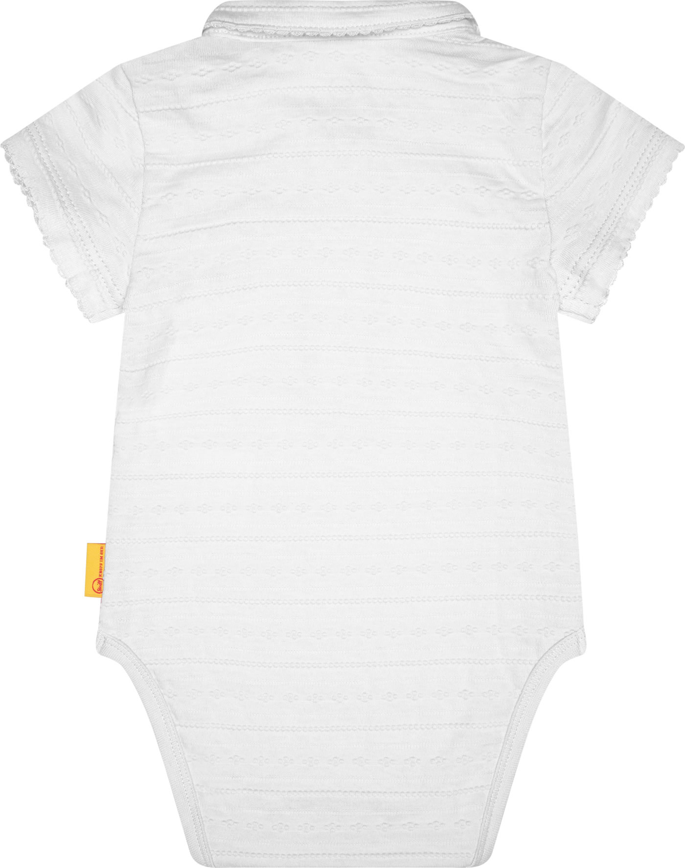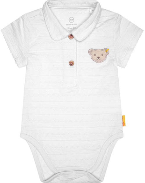 Body with short sleeves for girls from the Beach Please collection by STEIFF. The STEIFF bear is on the chest. The press studs at the crotch and a button placket on the front help with dressing and undressing. The delicate pattern and the mouse teeth edge on the collar and sleeves are particularly beautiful.