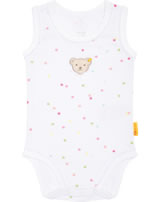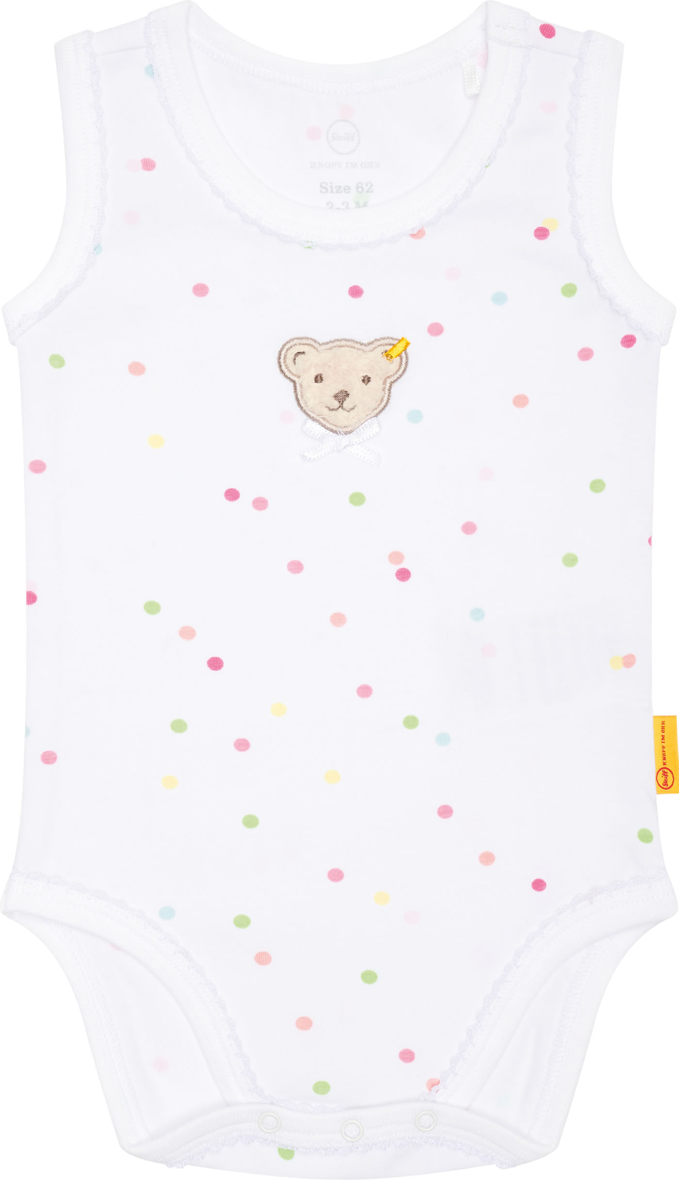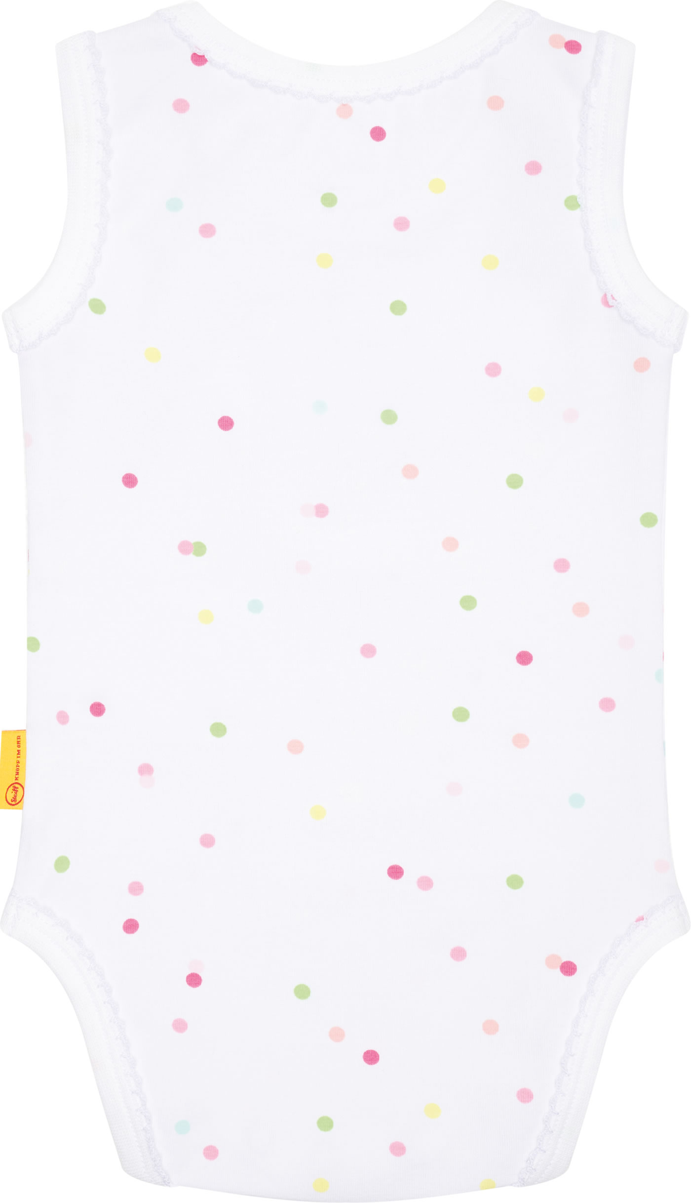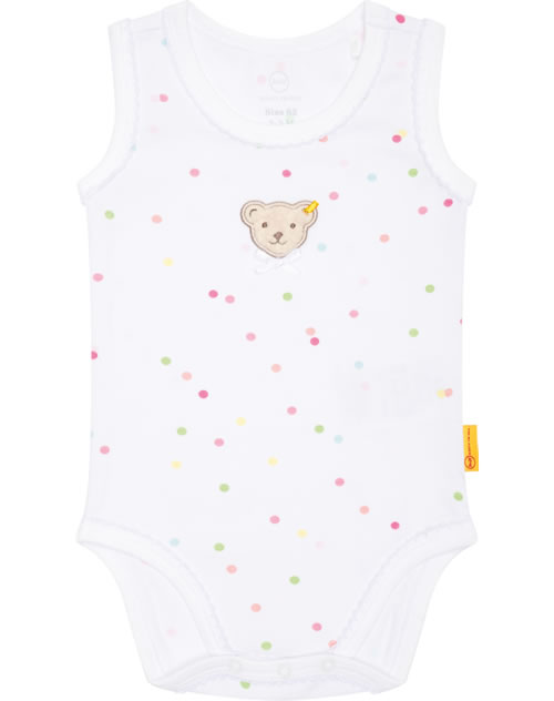Sleeveless body for girls from the Garden Party collection by STEIFF. Beautiful details are the colorful dots that cavort on the body, the little mouse teeth edges and the little STEIFF bear with a bow on the chest. Snaps at the crotch help with dressing and undressing. The soft material offers a high wearing comfort.