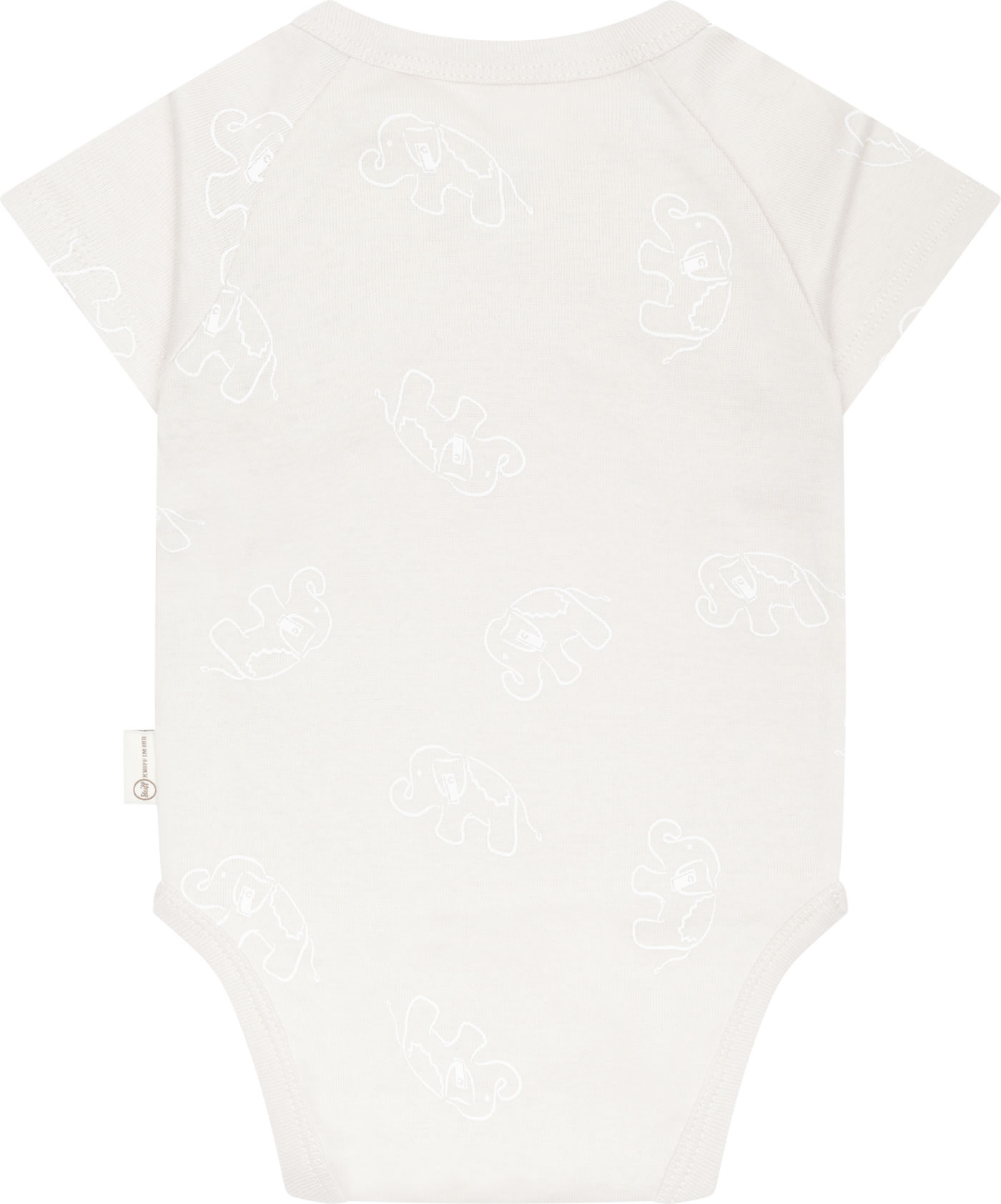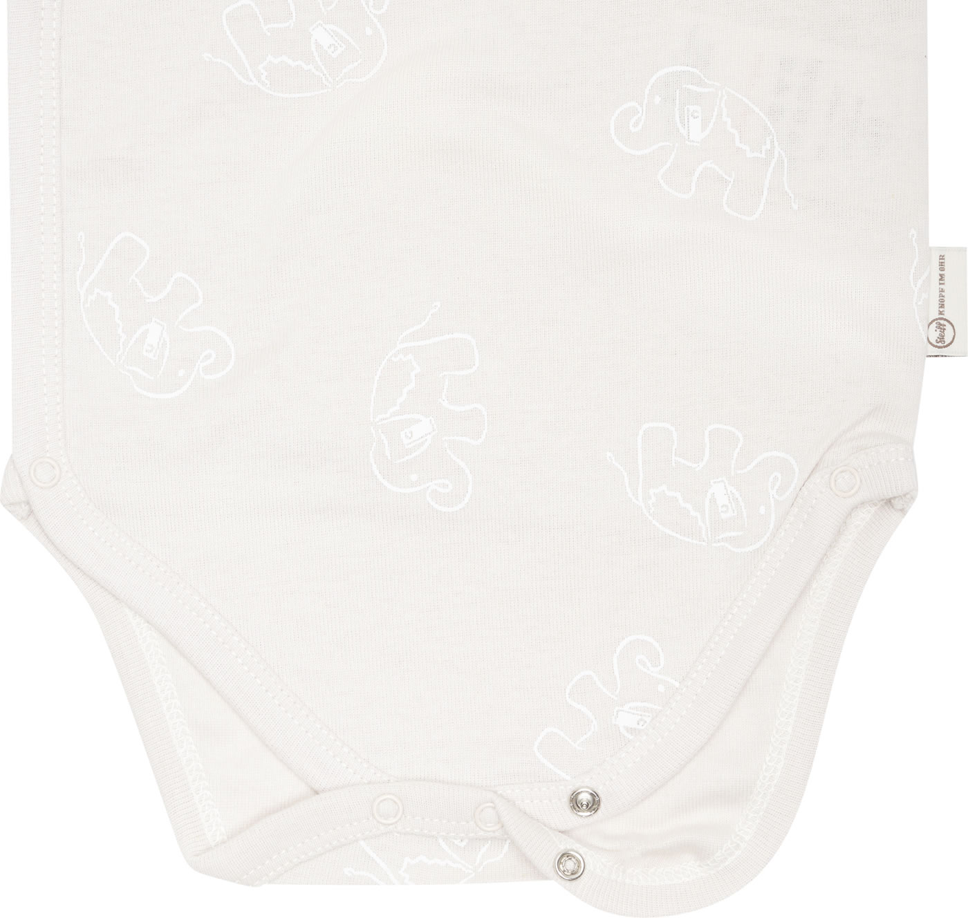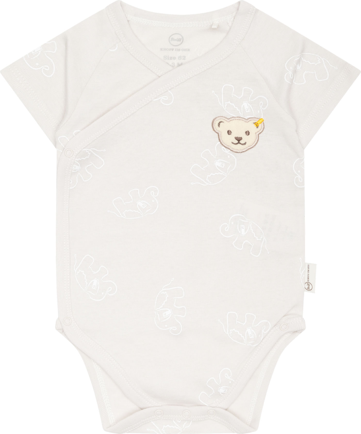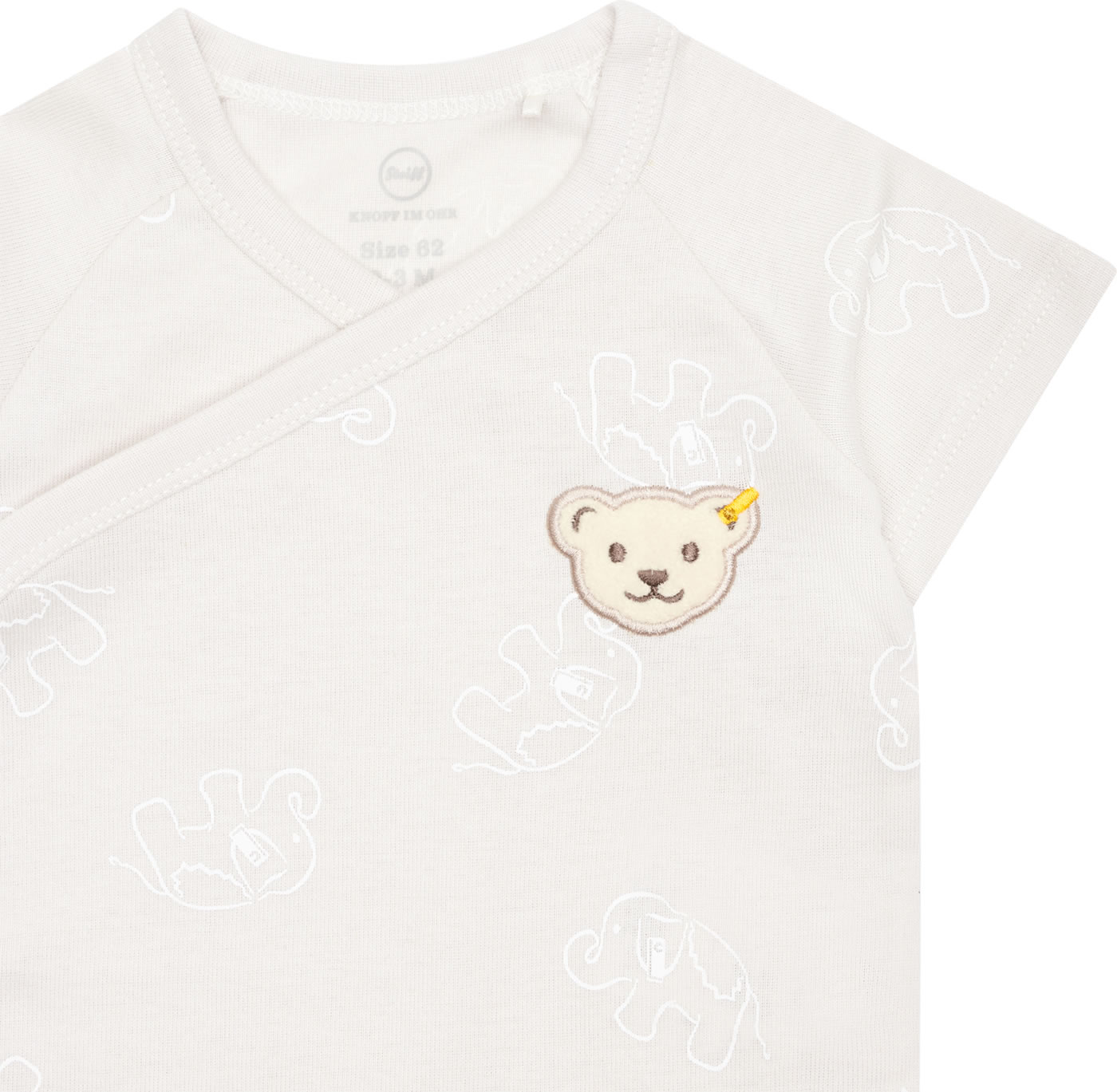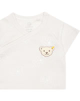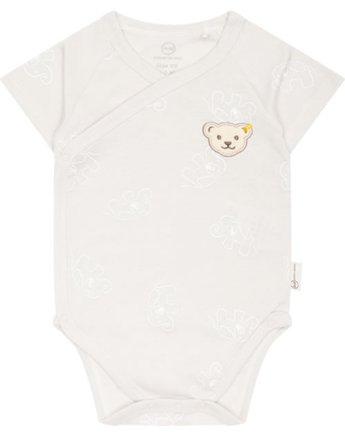 Jersey wrap body with short sleeves from the Baby Wellness Collection by STEIFF. With the little STEIFF bear on the chest. The delicate elephant pattern is a pretty detail. A snap placket from chest to crotch makes dressing and changing easy. The soft material offers a high wearing comfort.