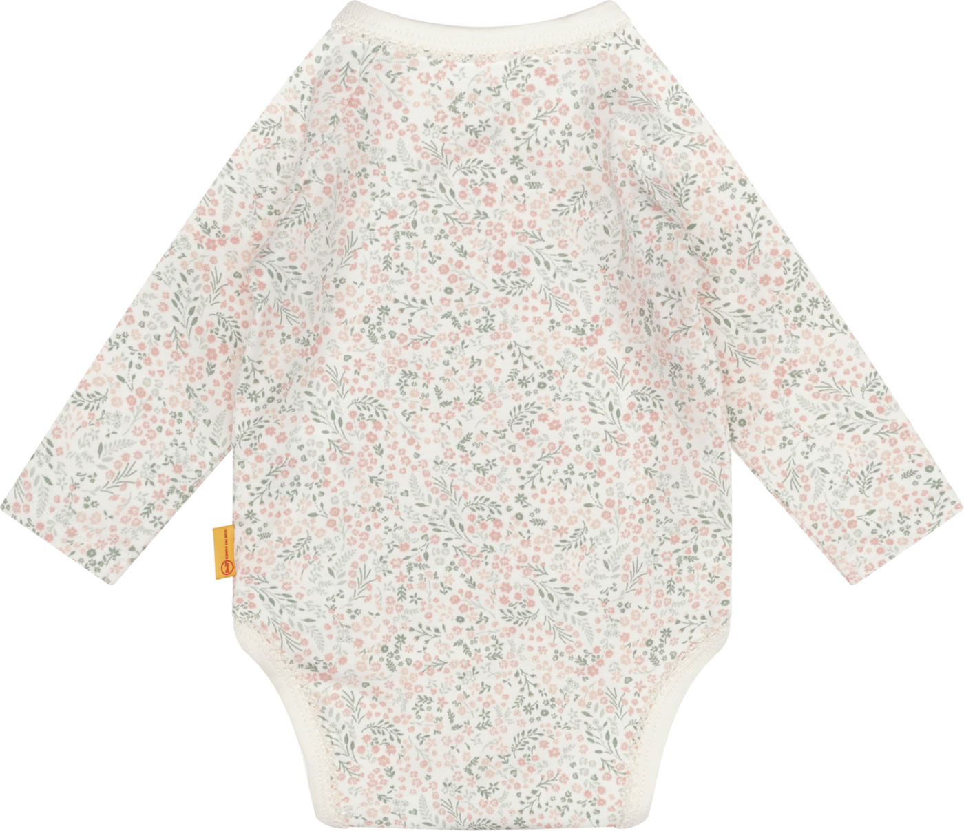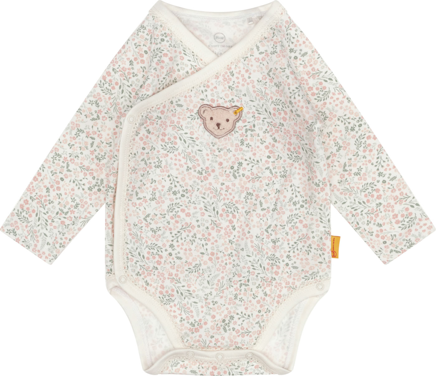 Wrap body made of jersey with long sleeves for girls from the Jungle Feeling collection by STEIFF. With the little STEIFF bear on the chest. The delicate floral pattern and the mouse tooth edges are pretty details. A snap-fastener strip from the chest to the crotch makes it easier to put on and swaddle. The soft material offers a high level of comfort.